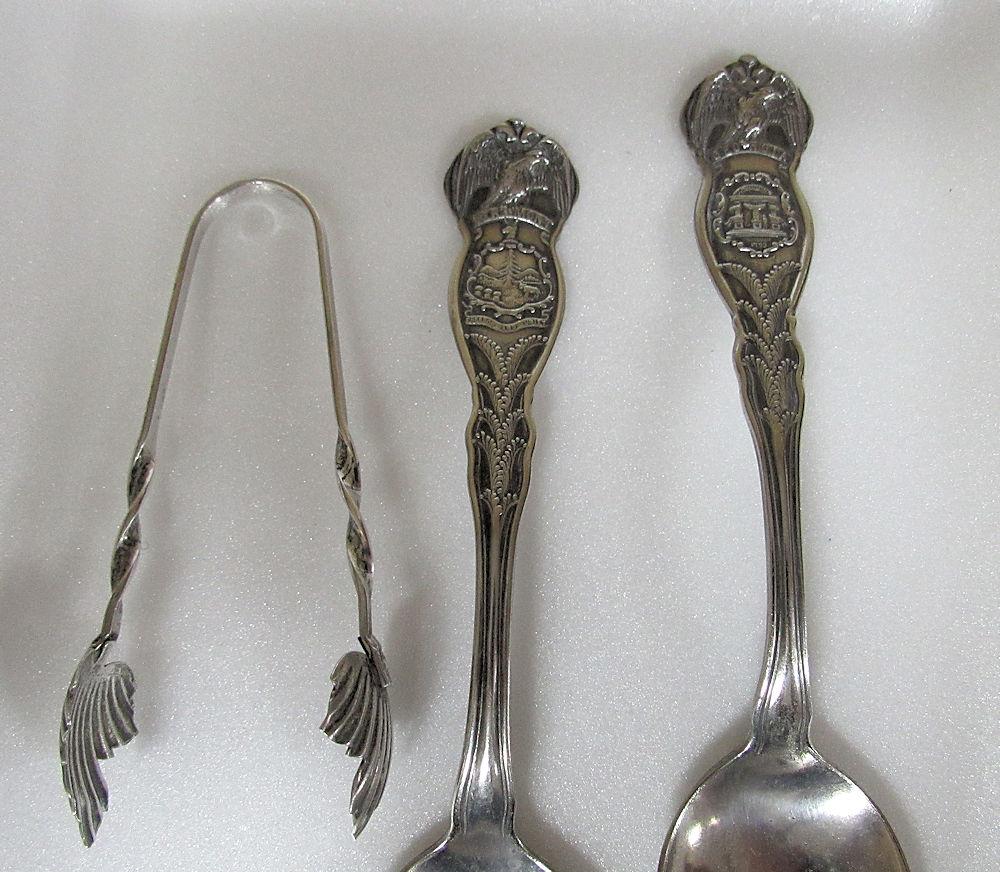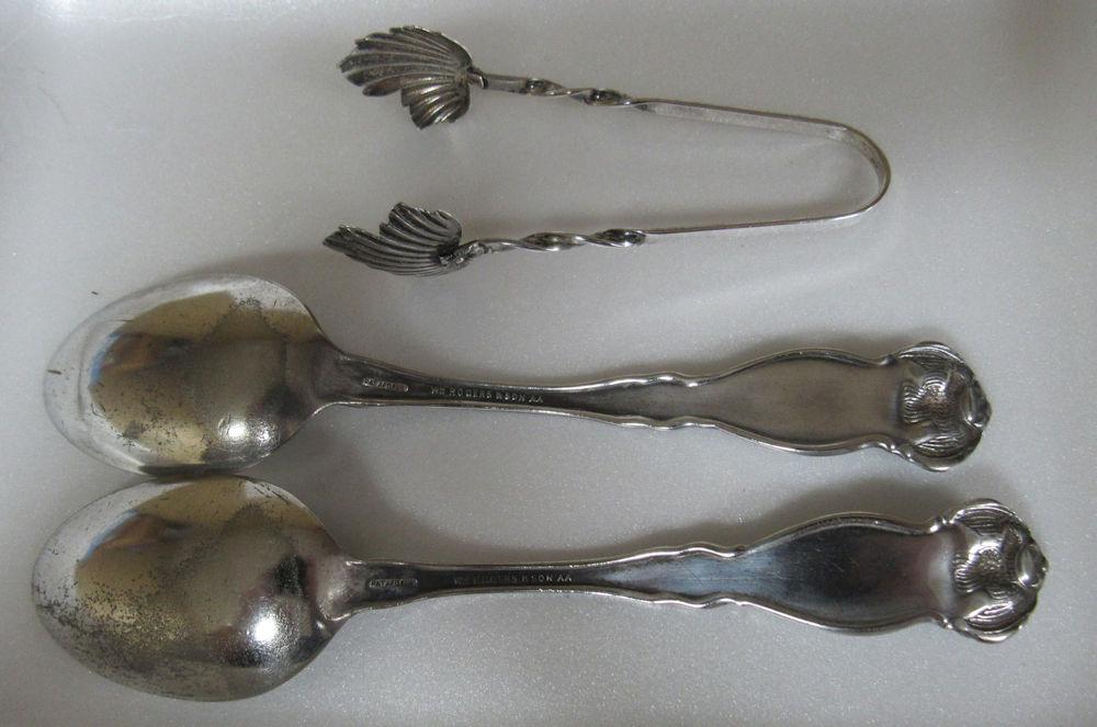 Good condition. Spoons have some silvering wear as seen in photos. Tongs are unmarked. Shipping is available at shipping cost plus $5.00 handling fee on up to 8 lots, $10.00 handling fee on 9 or more lots.