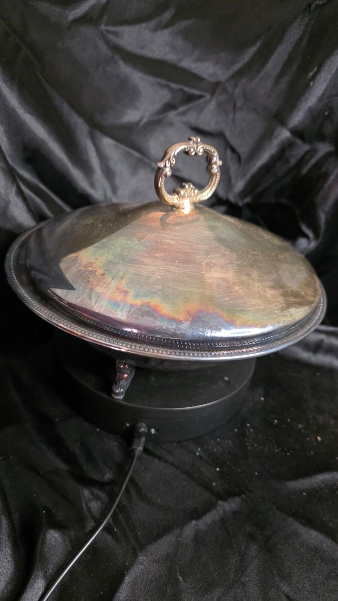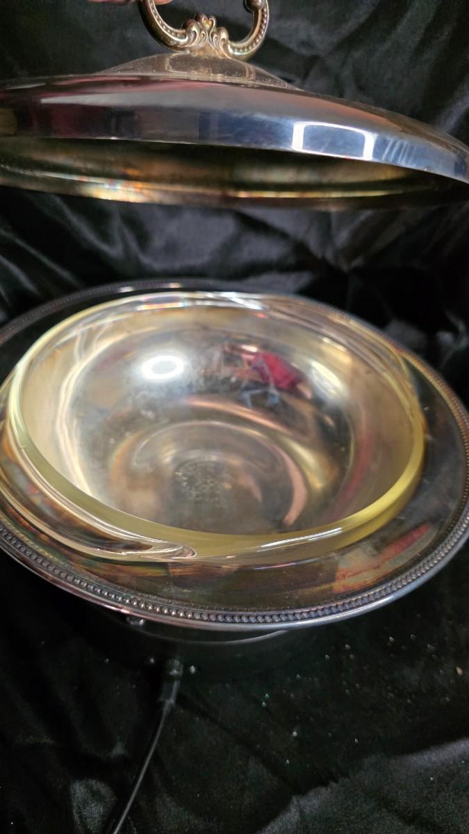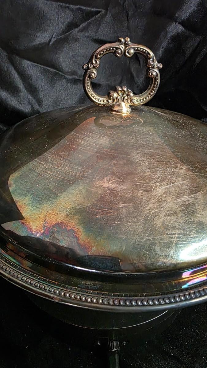 Imagine it at the heart of a holiday feast, steam rising as the lid lifts to reveal treasures below, or displayed on a sideboard where it evokes the hospitality of grandmothers' kitchens and the joy of shared abundance. From the tradition of mid-century silverplate artistry, its patina adds character without flaw, the Pyrex insert ensuring practical warmth for generations of gatherings. Not just a dish, it's a symphony of tradition—the sizzle of oven-fresh comfort, the gleam of polished legacy, the quiet warmth of meals that bind hearts.