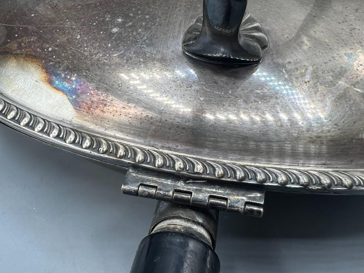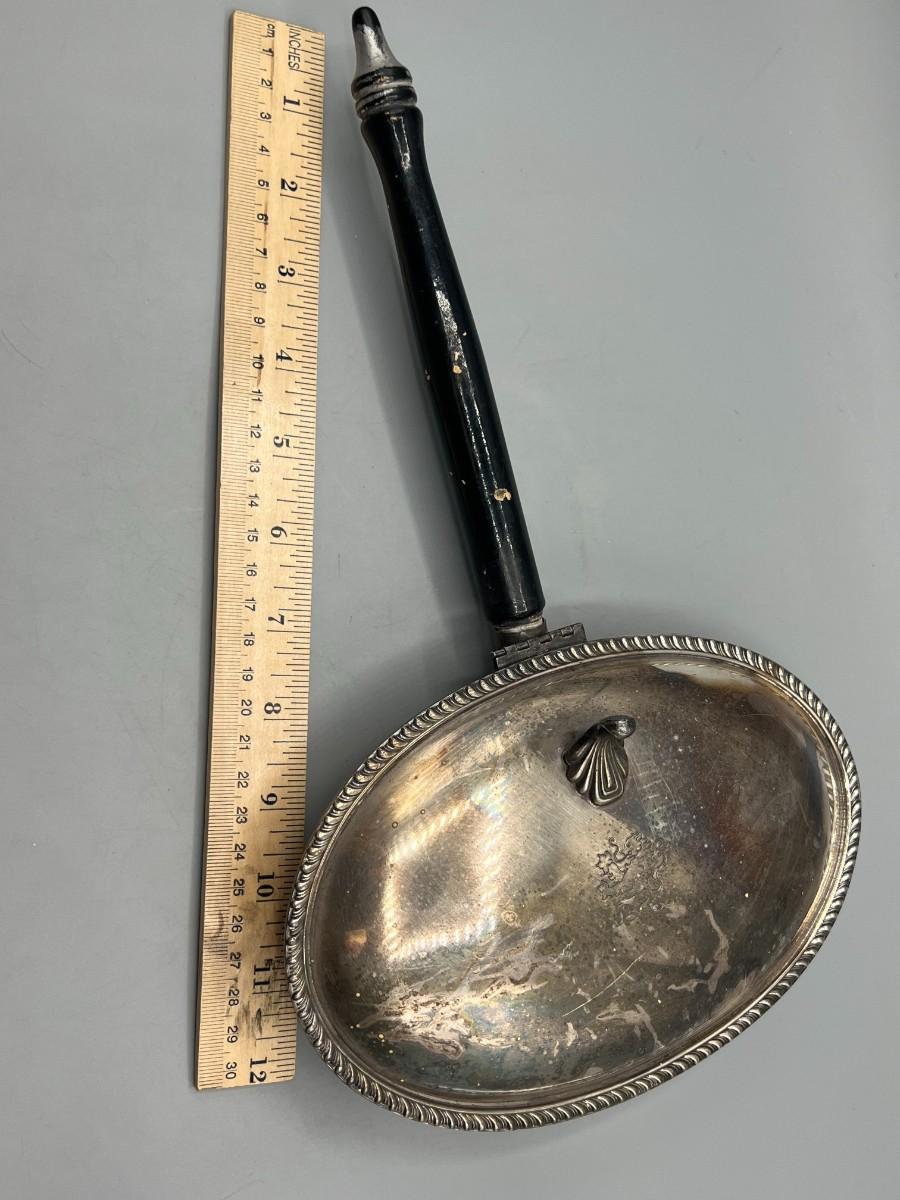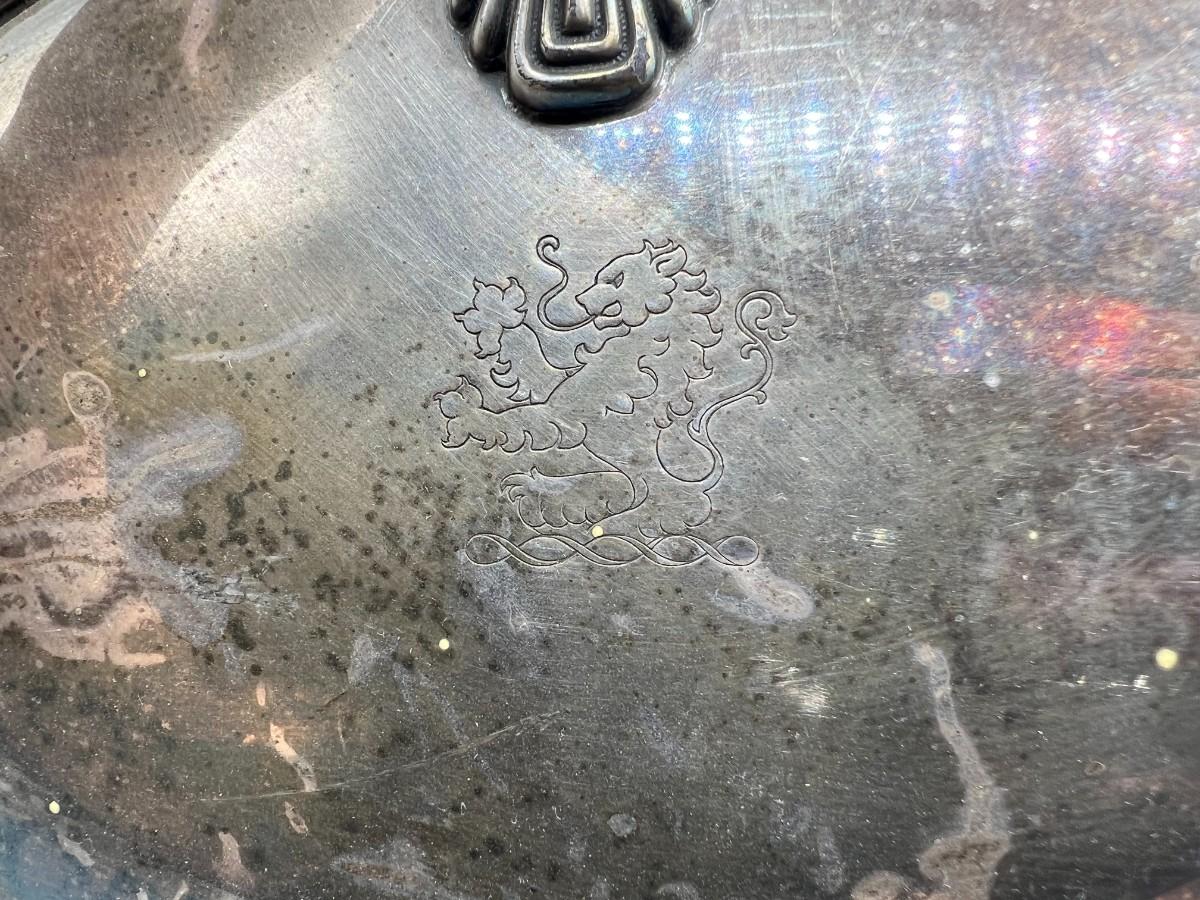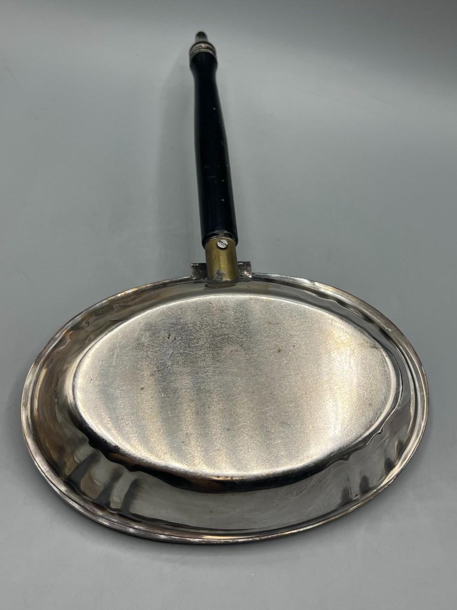 Vintage Silver Plated Crumb Catcher Hot Dish Etched Dragon with Wooden Handle