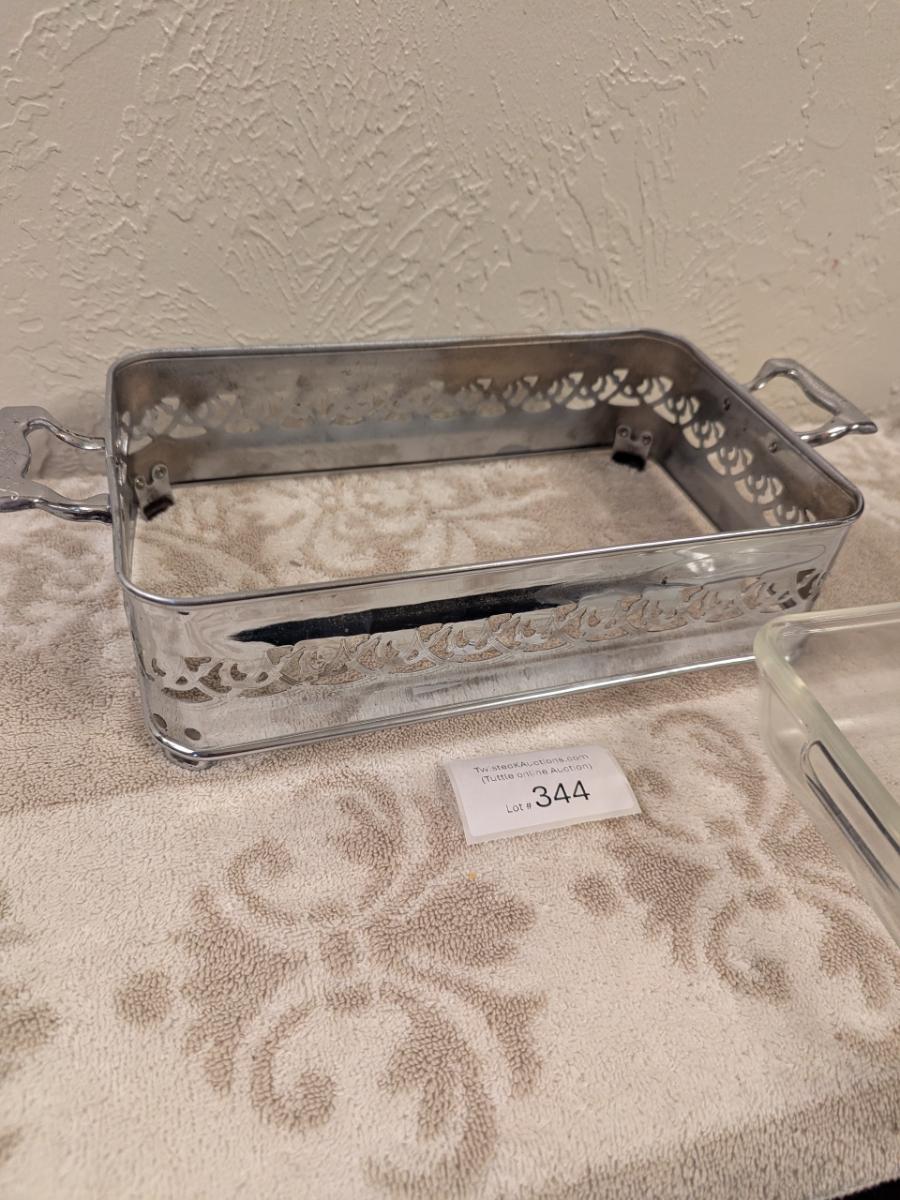 Vintage silver plated serving cradel and pyrex glass dish 231 1.5 qt dish