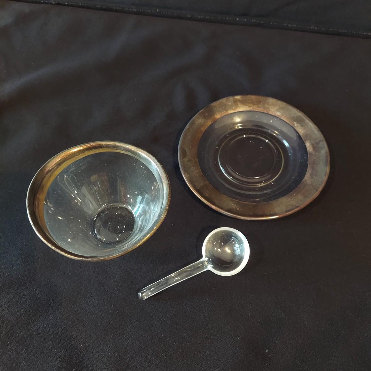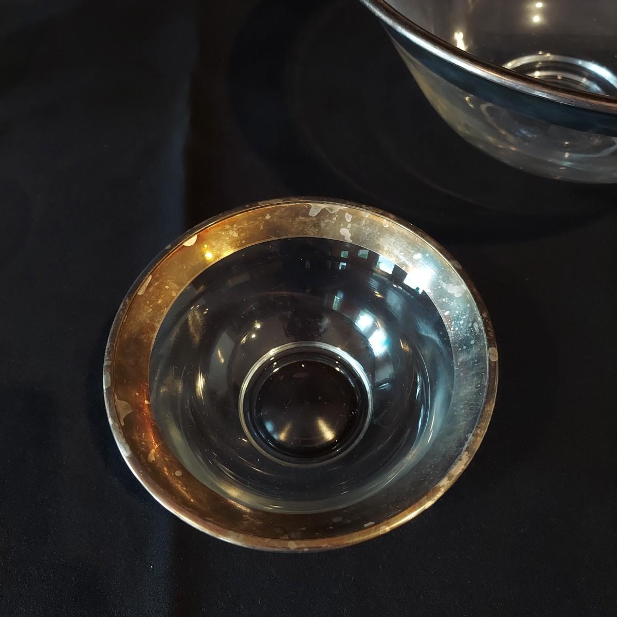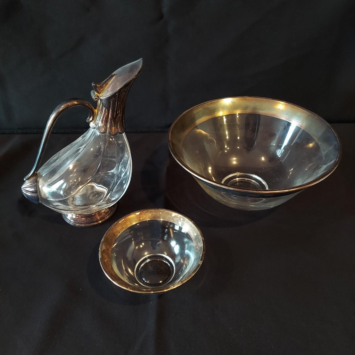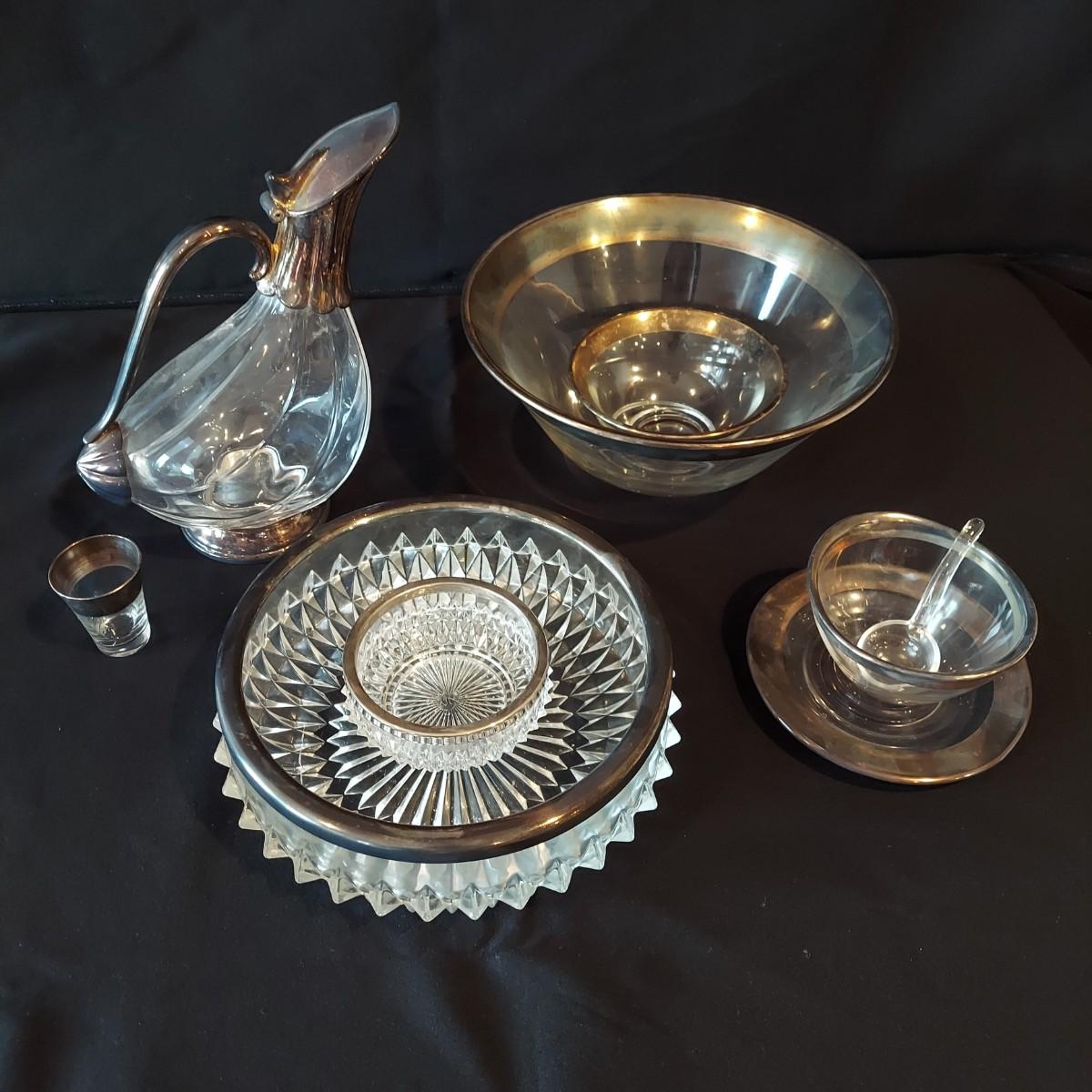 Several pieces of vintage serving ware that appear to be crystal with silver plated trim and possibly two Dorothy Thorpe Mid Century nesting bowls. The large bowl measures 5"H with a 10"D. Also includes two cut glass candy dishes, a small bowl with spoon and saucer, plus a decanter with shot glass. The decanter measures 7" x 4.5" x 10"H. Shipping available