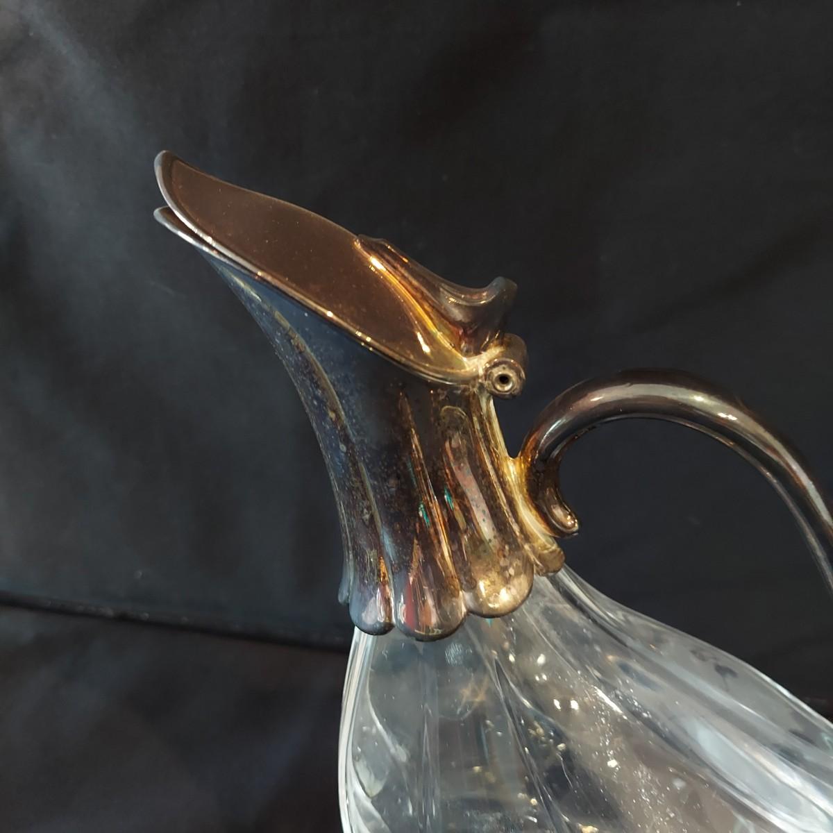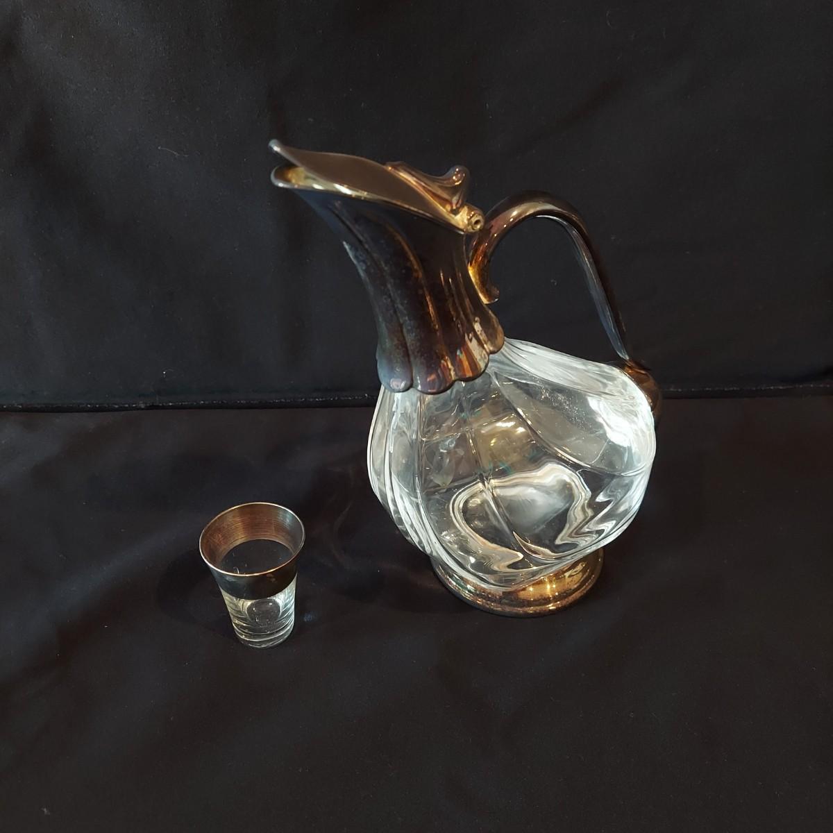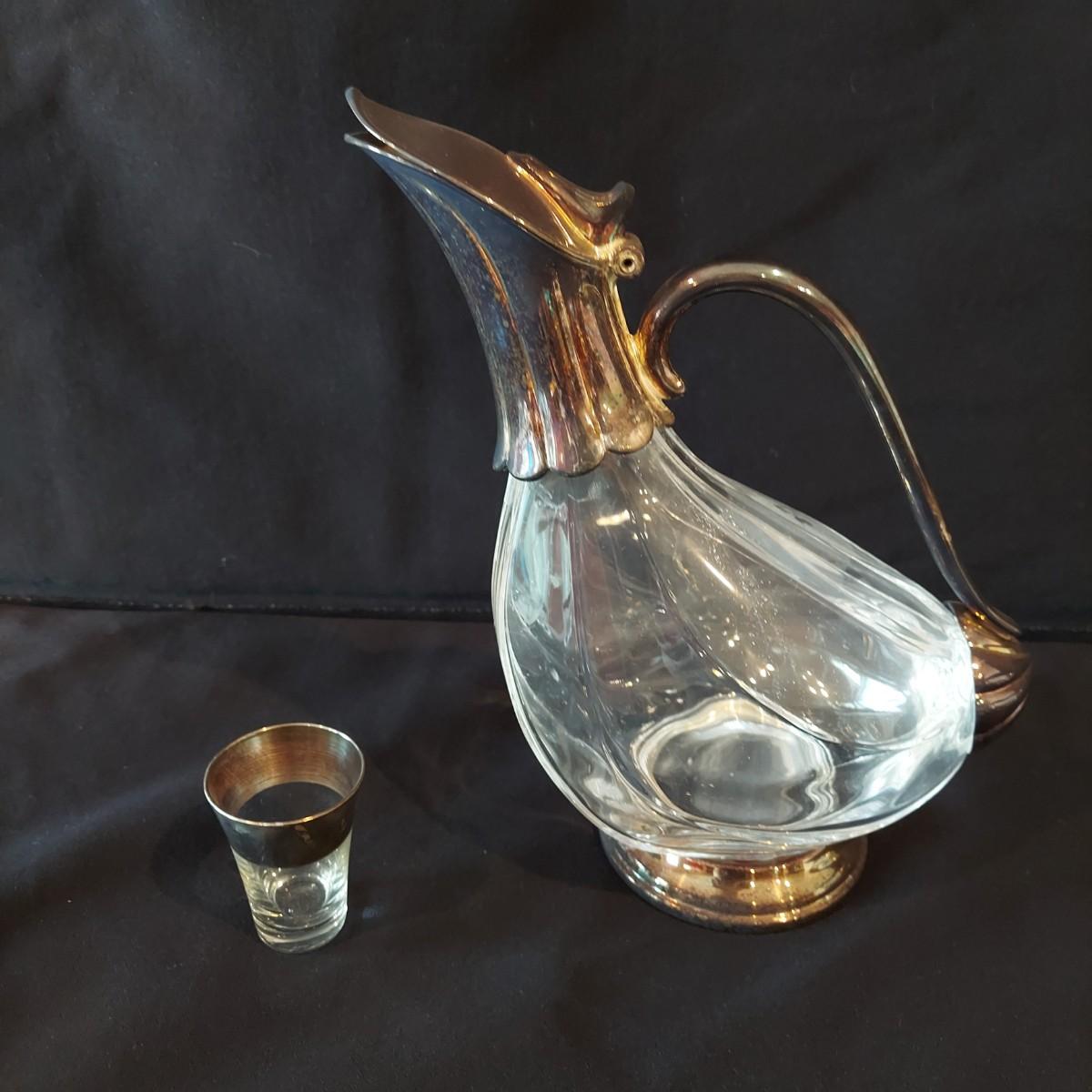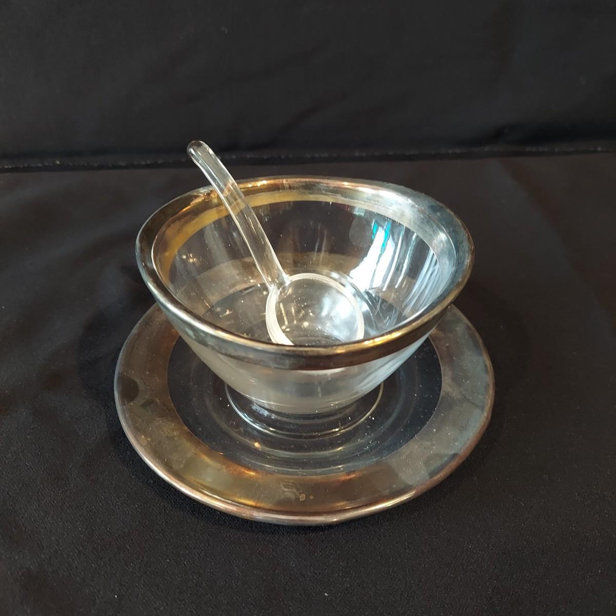 Several pieces of vintage serving ware that appear to be crystal with silver plated trim and possibly two Dorothy Thorpe Mid Century nesting bowls. The large bowl measures 5"H with a 10"D. Also includes two cut glass candy dishes, a small bowl with spoon and saucer, plus a decanter with shot glass. The decanter measures 7" x 4.5" x 10"H. Shipping available