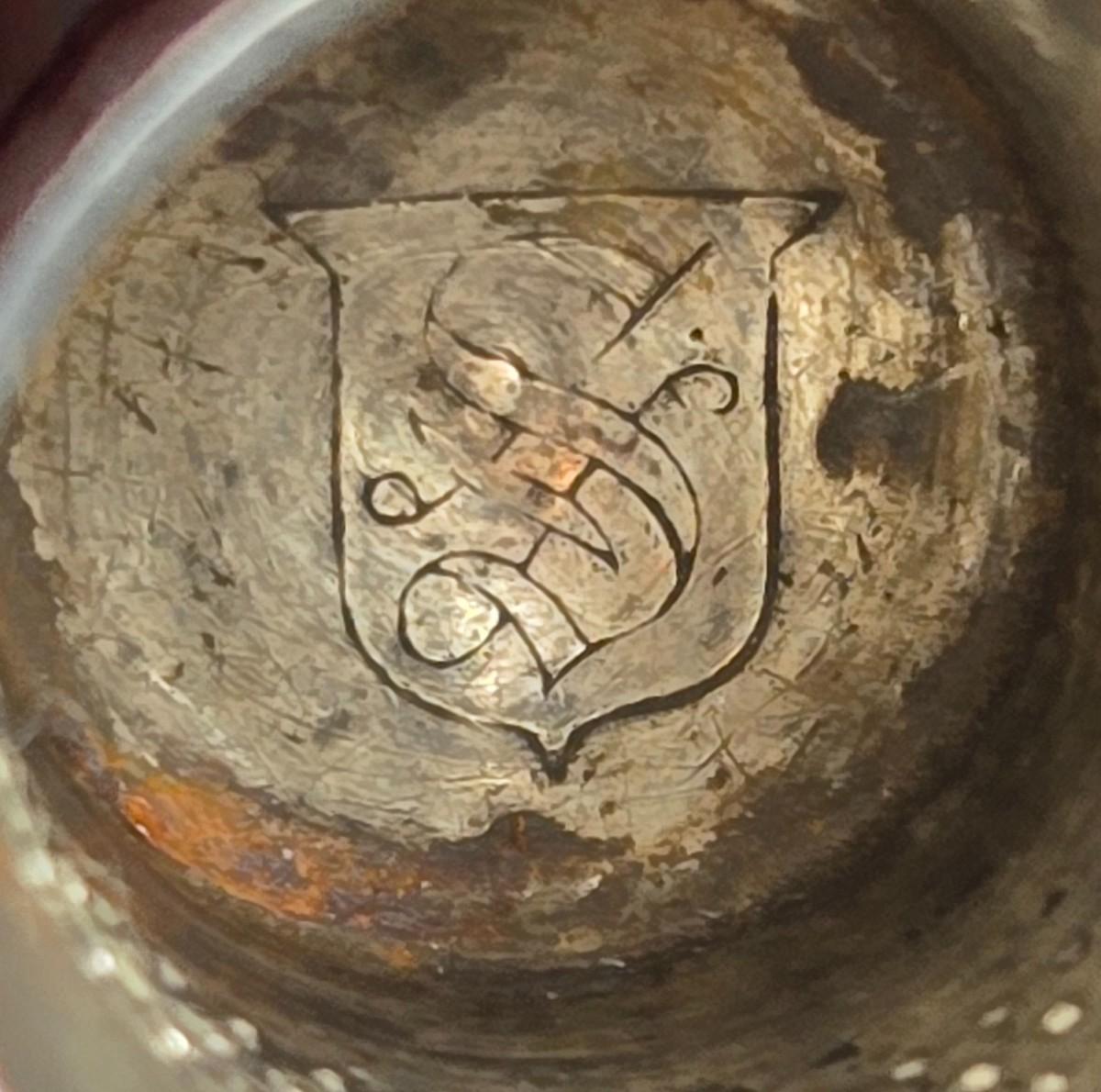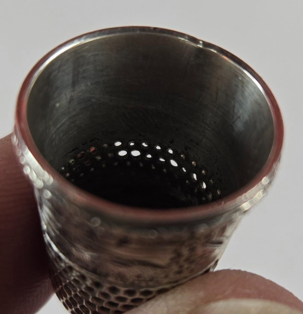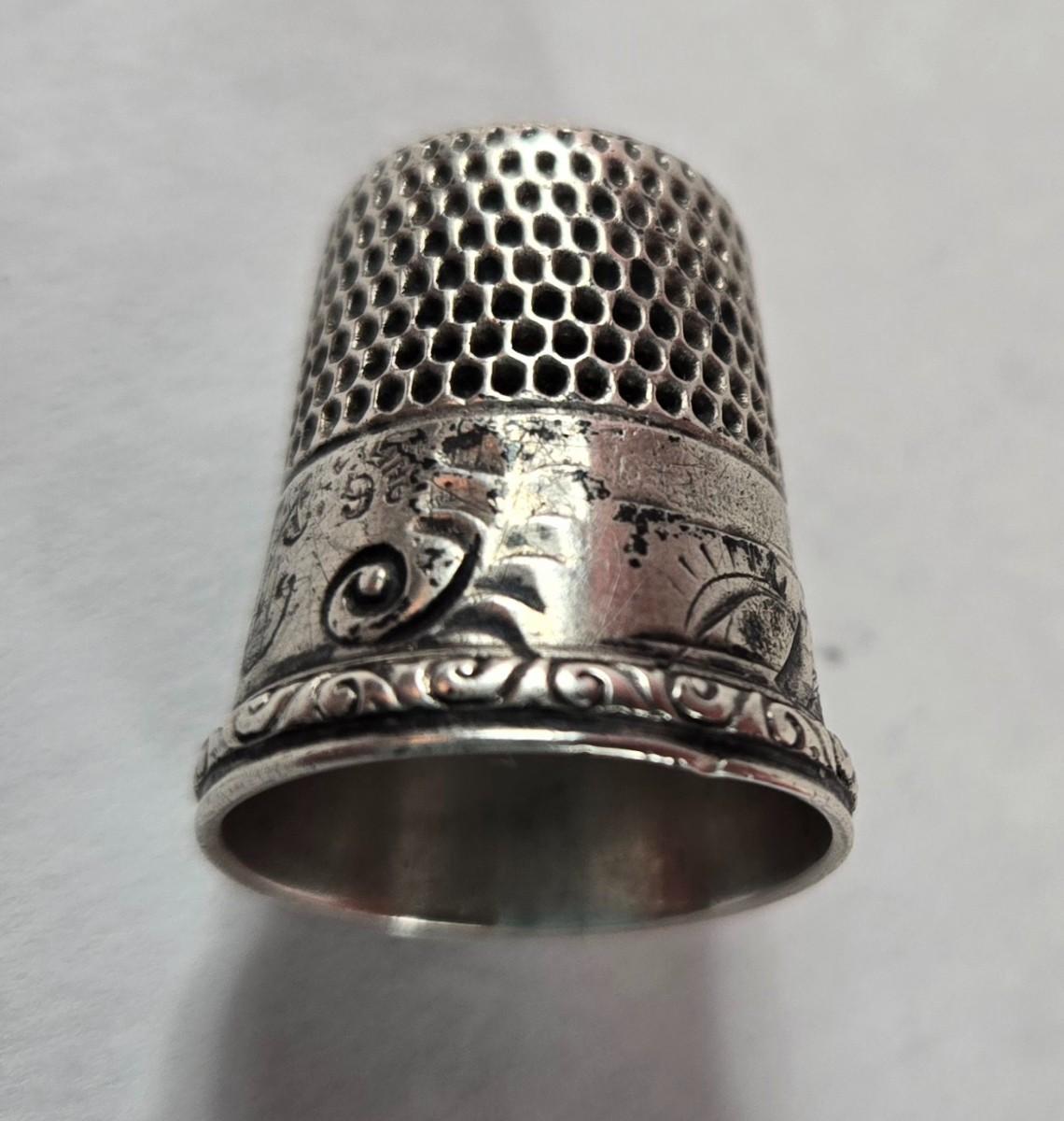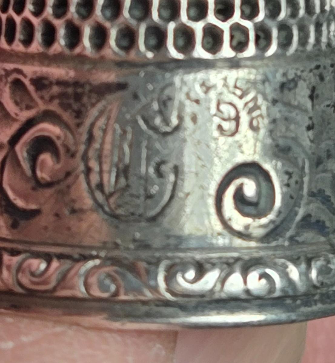This auction lot is for a Vintage Sterling Silver Thimble. This is a very nice ornate Sterling Silver Thimble. It weighs about 6 grams It is monogrammed with what looks like a C or G - near the worn wording of Sterling 9. It also has a fancy S in a shield on inside.