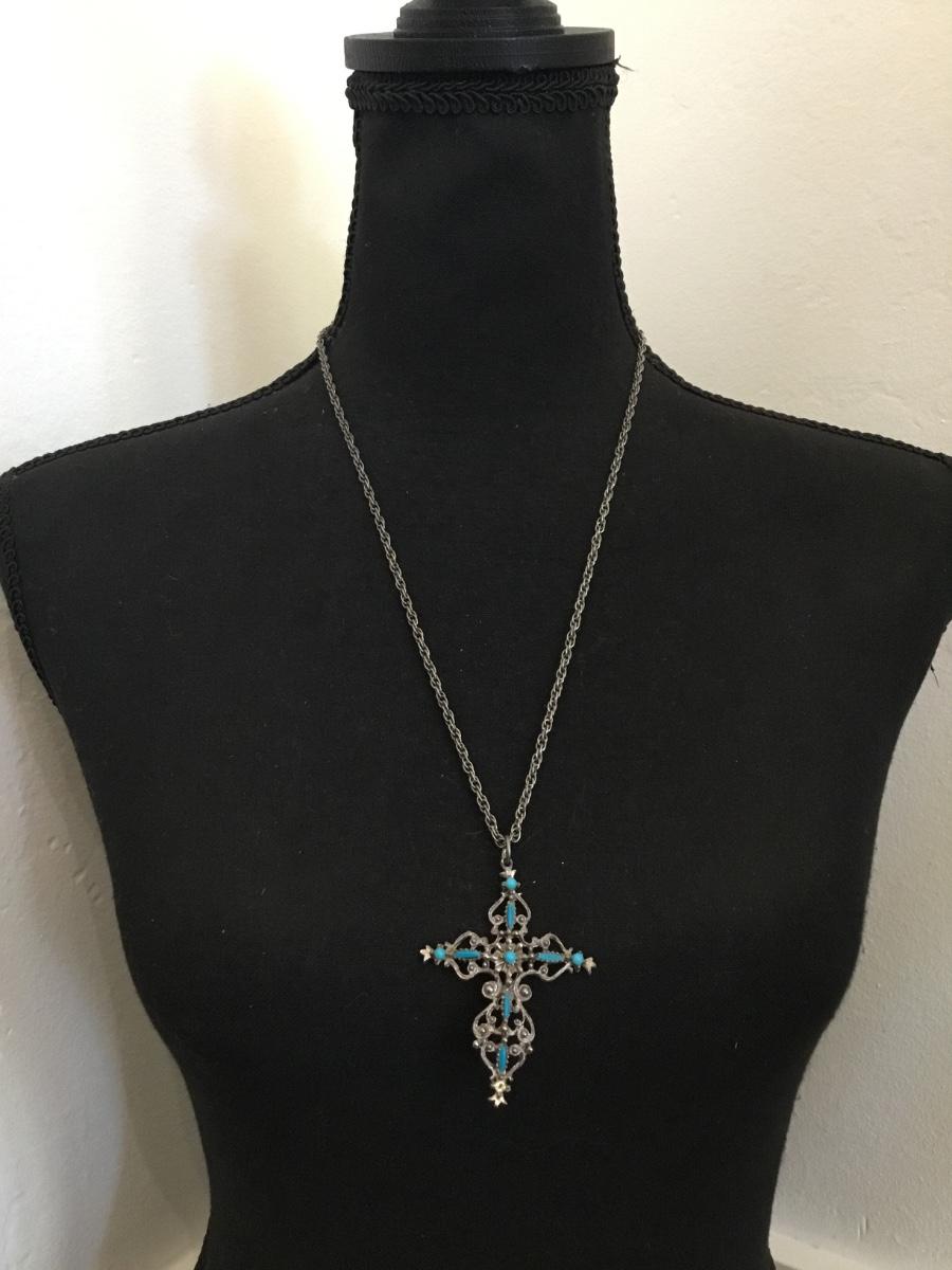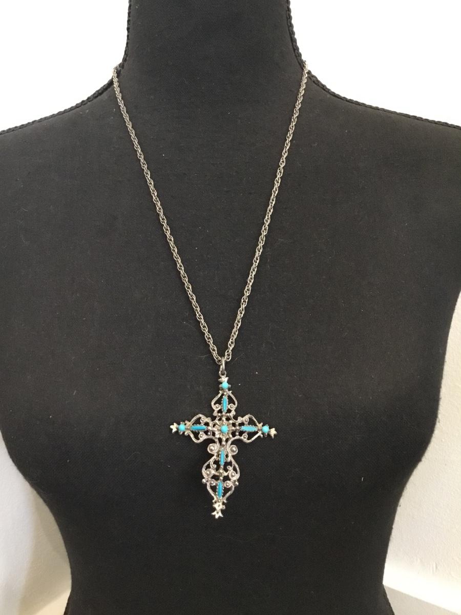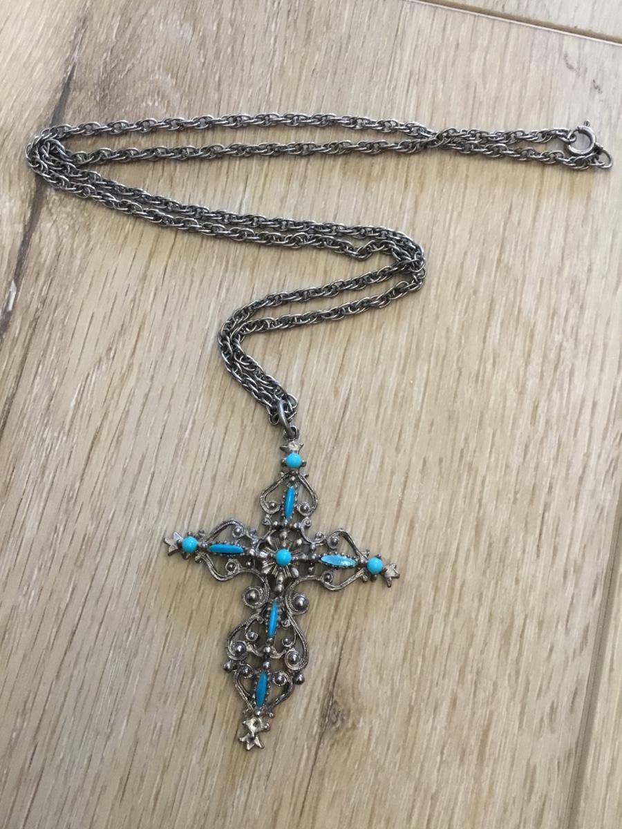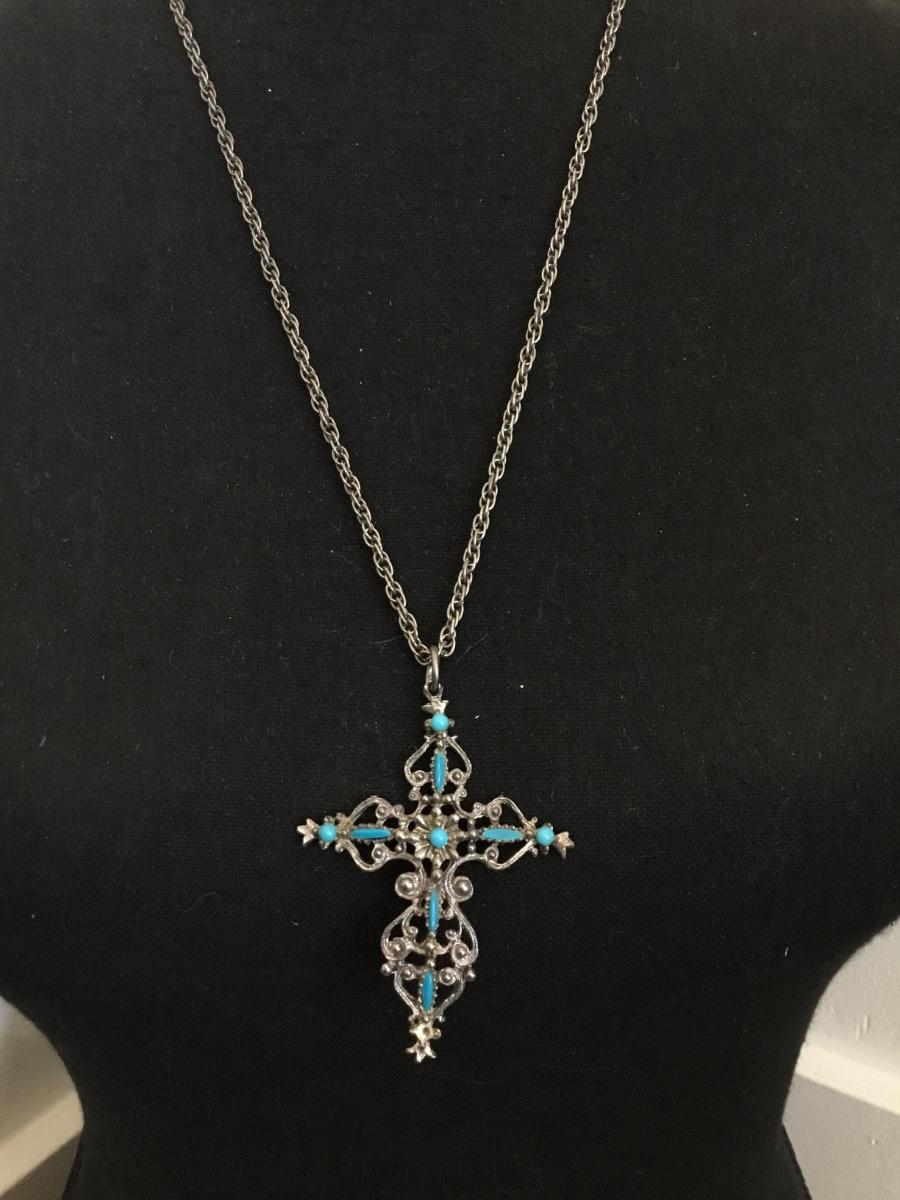Vintage Silver tone, blue turquoise, cross pendant, necklace, vintage