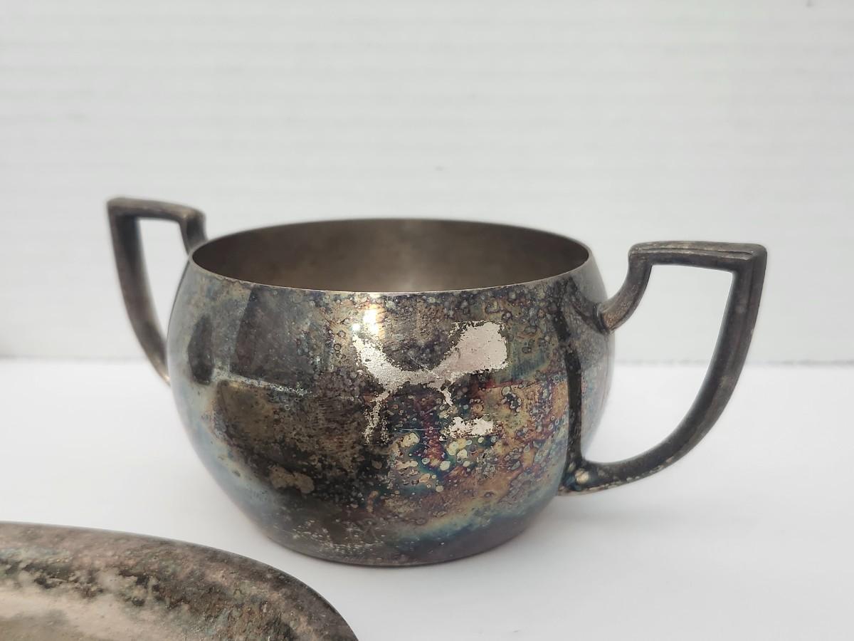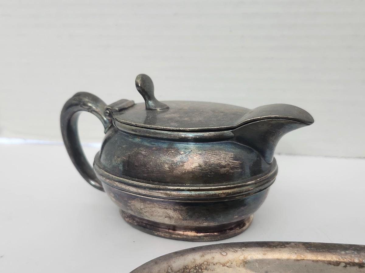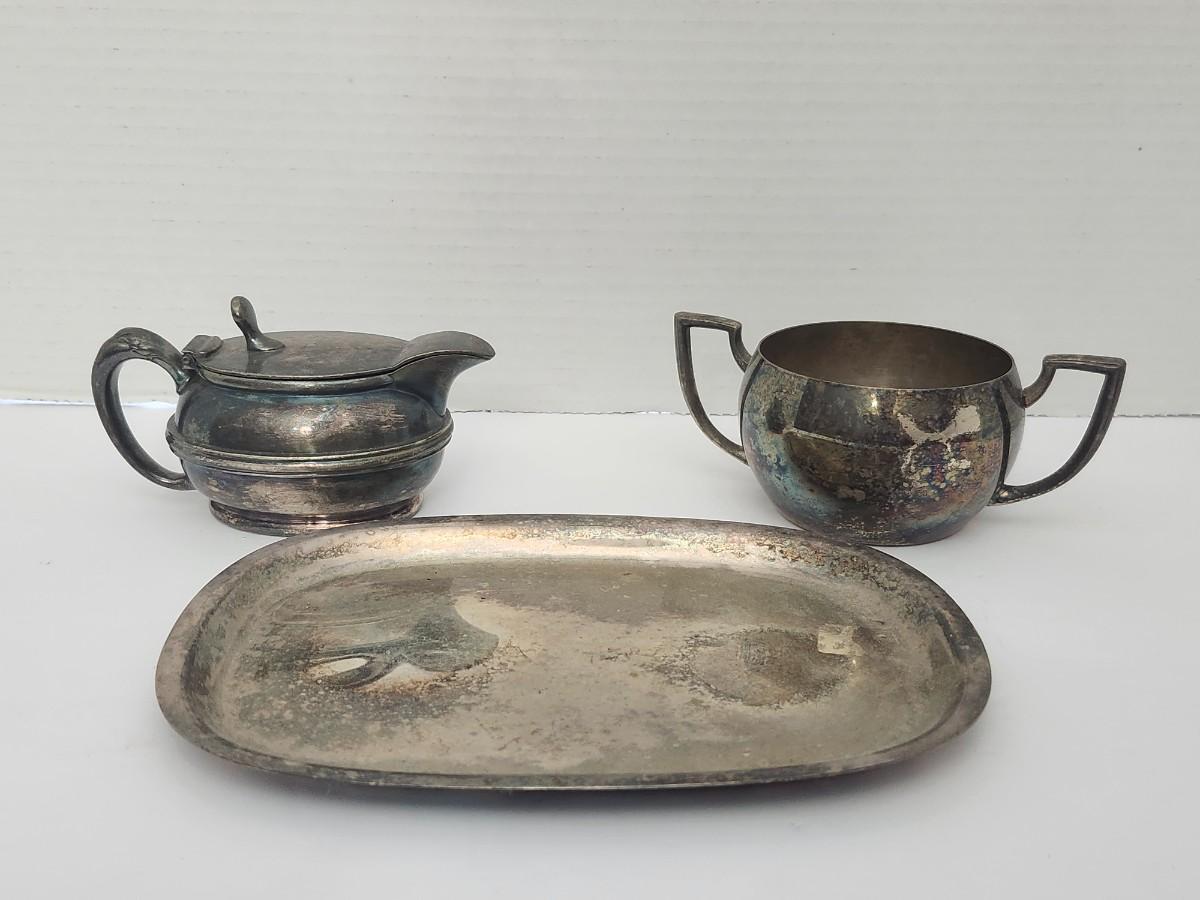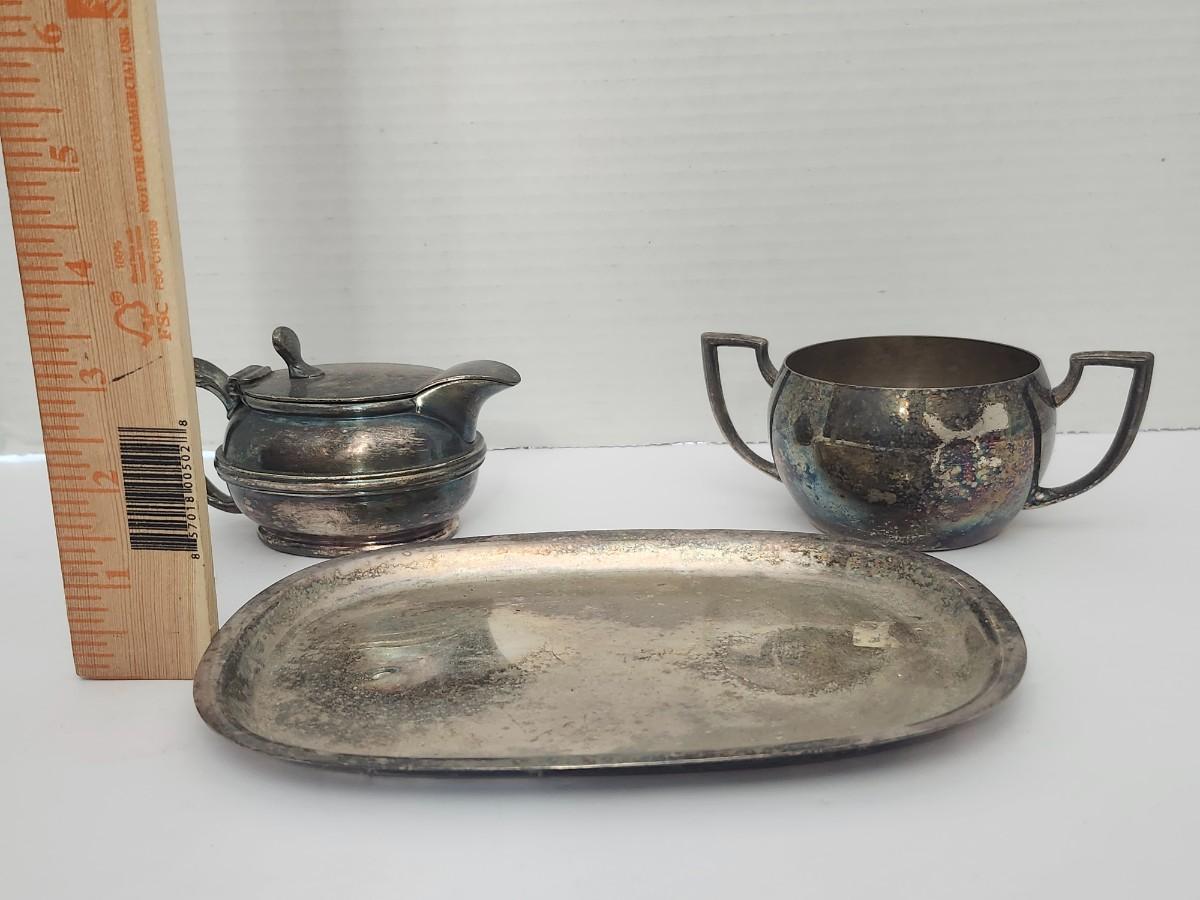 Vintage Silver Tone Creamer Sugar Bowl And Oval Serving Tray Three Piece Tabletop Set