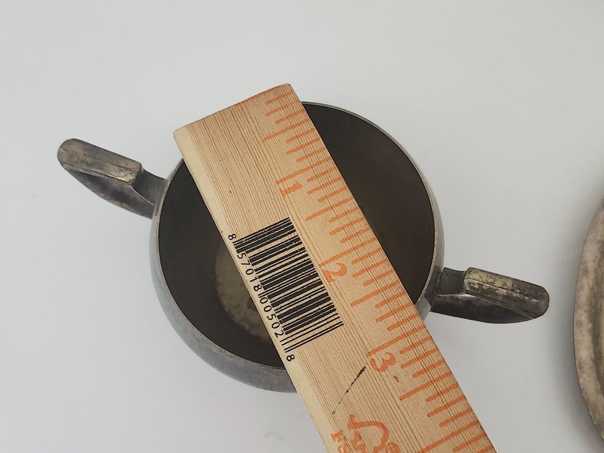 Three piece vintage silver tone tabletop set including a lidded creamer pitcher with spout and handle, a handled sugar bowl, and a matching oval serving tray. Unmarked pieces with classic mid century styling and uniform finish. Metal composition is untested. Set is sold together exactly as shown and has not been polished.