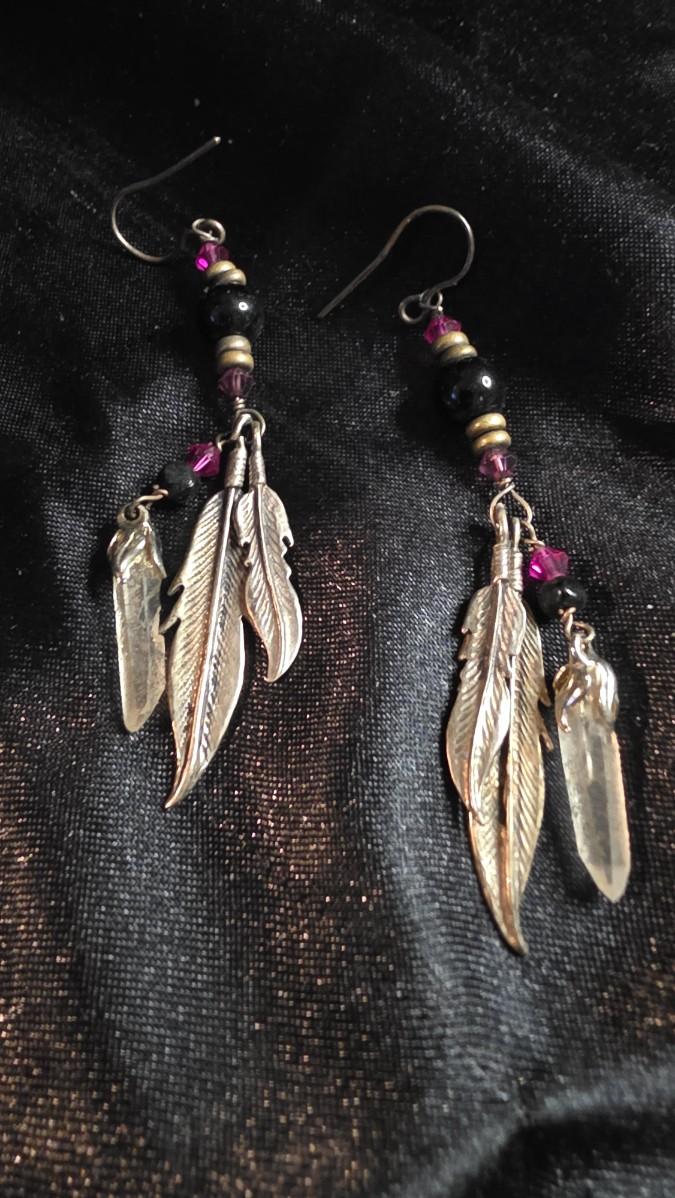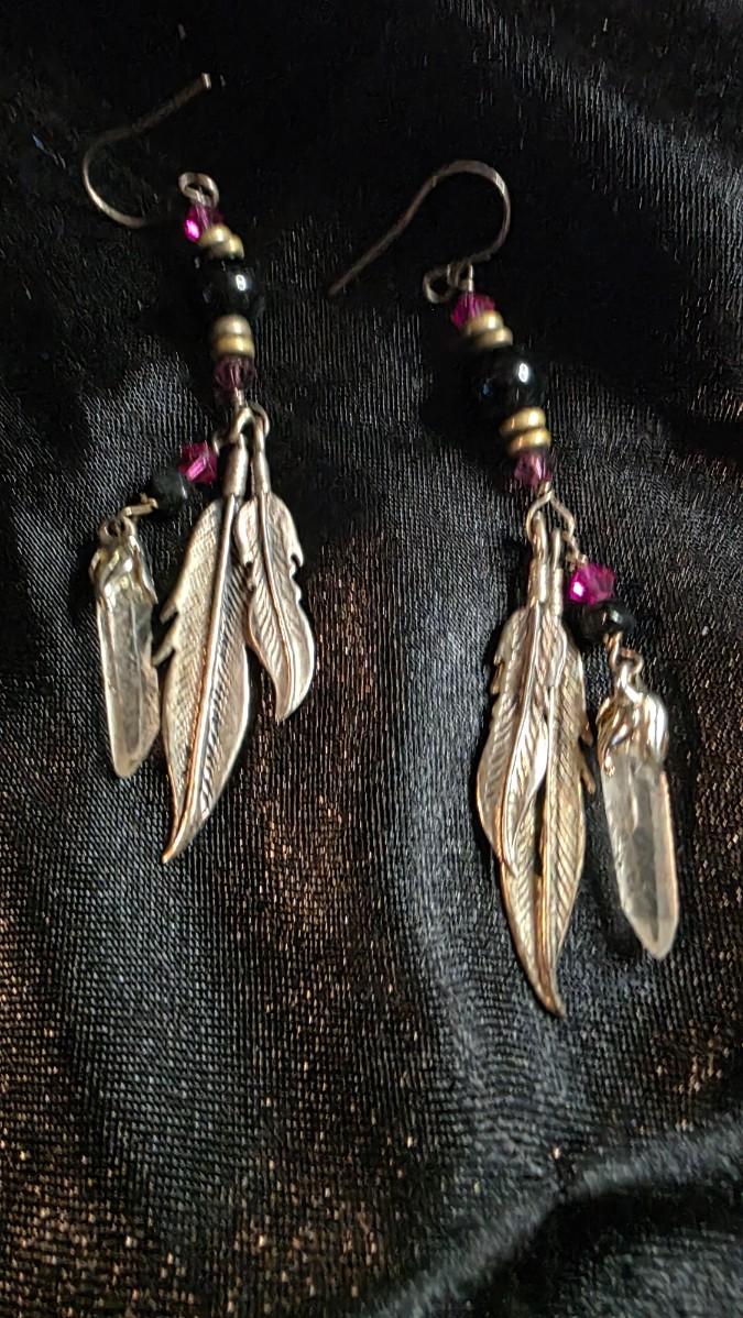 Vintage Silver Tone Feather Dangle Earrings with Amethyst & Black Bead Accents