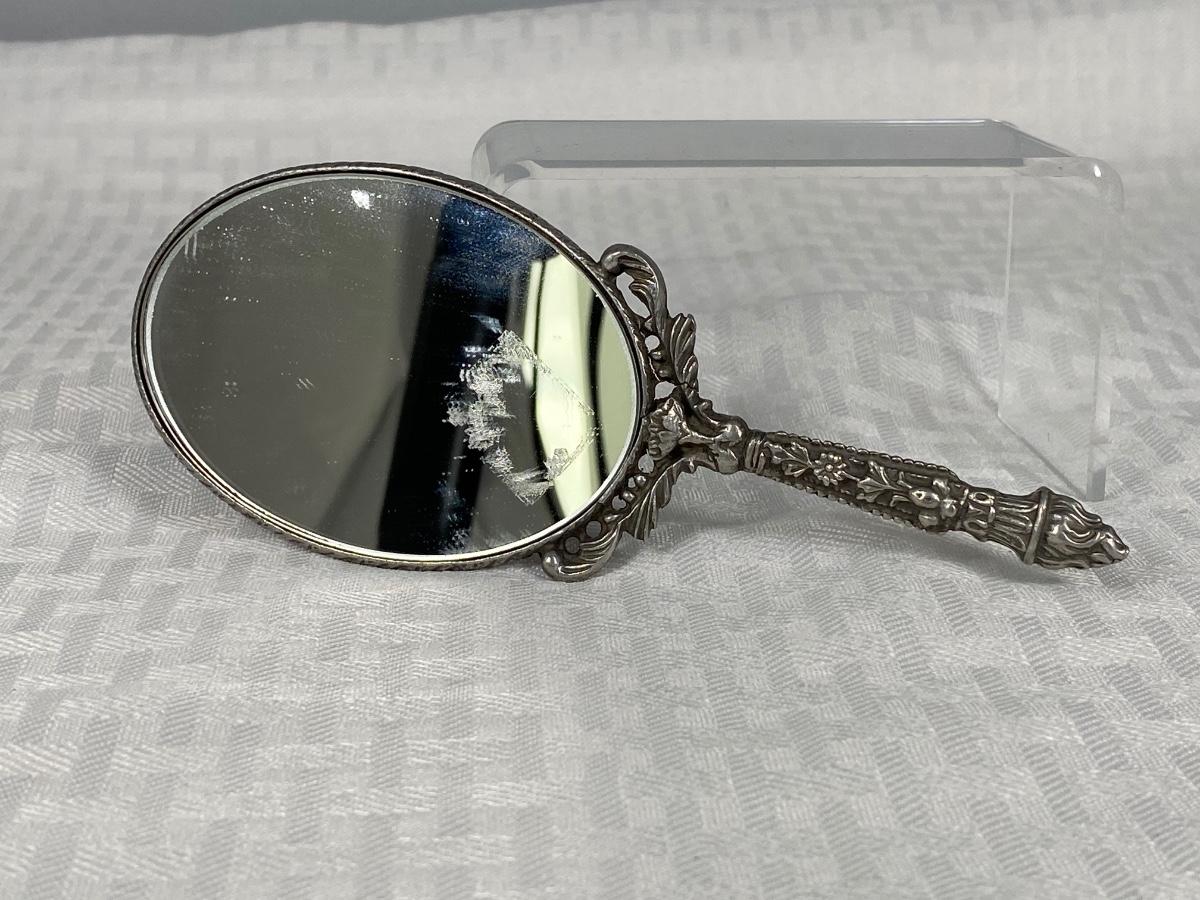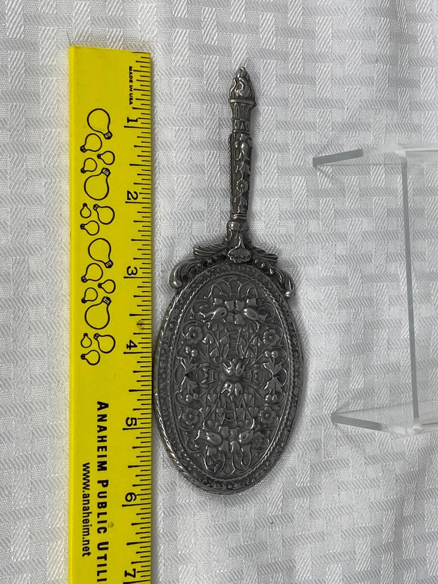 Vintage Silver Tone Floral Filigree Small Handheld Mirror. In good condition. There is an old sticker spot on mirror that just needs to be cleaned off. About 6" size. No markings found.