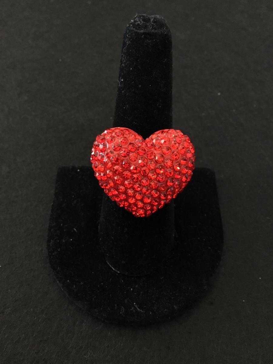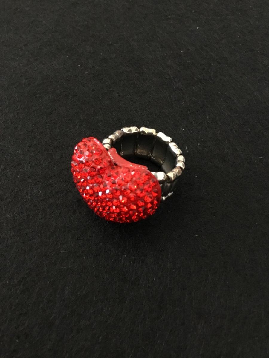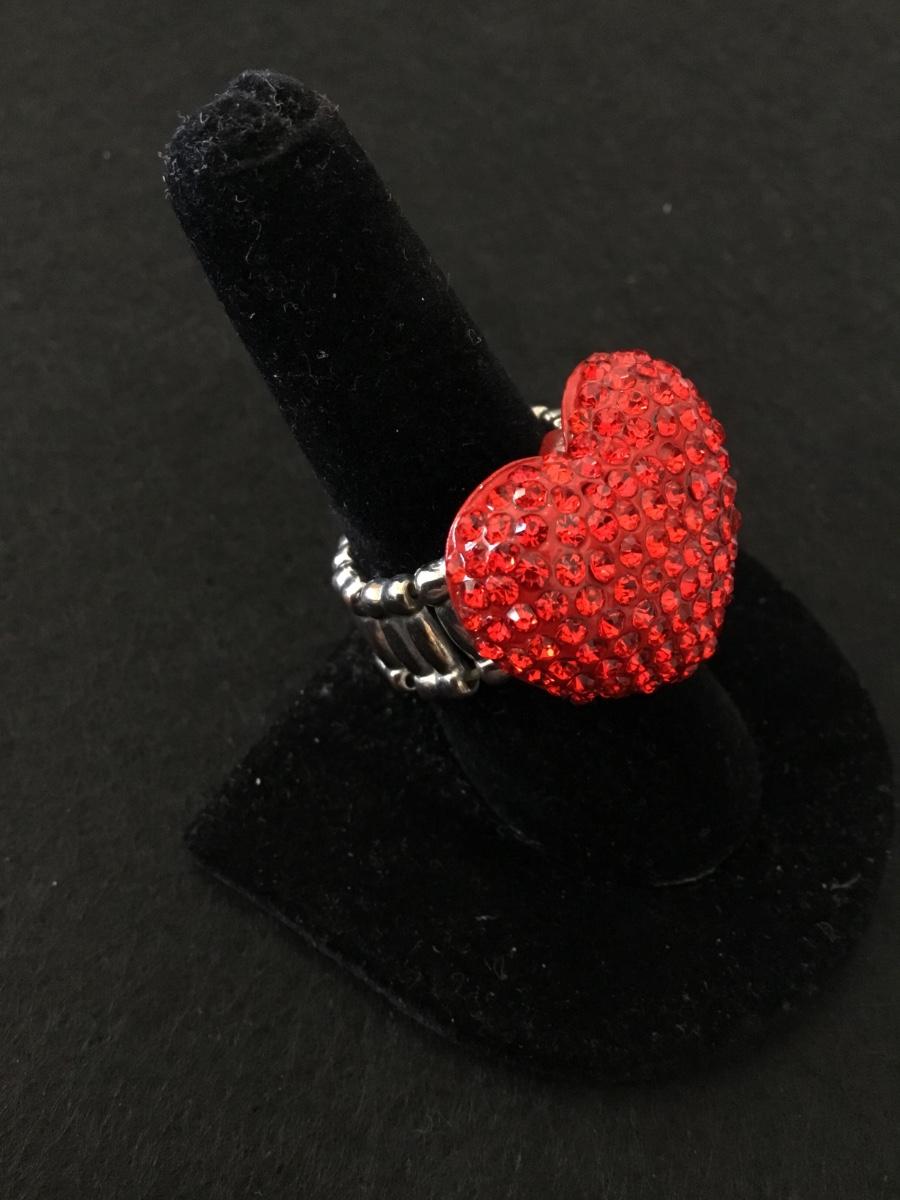 Vintage Silver tone, red heart, rhinestone adjustable, stretch, statement ring