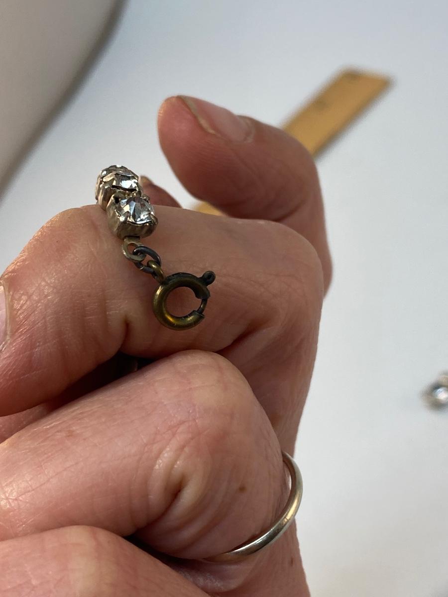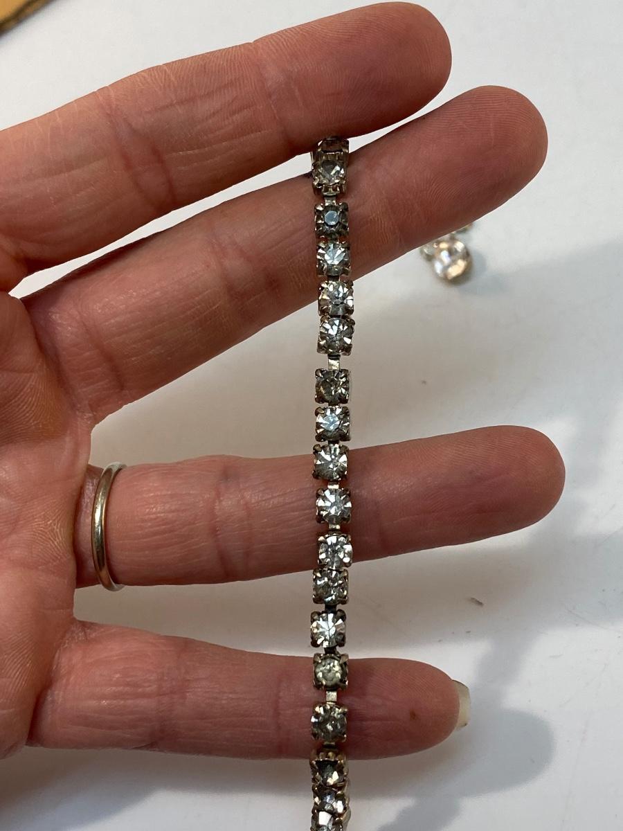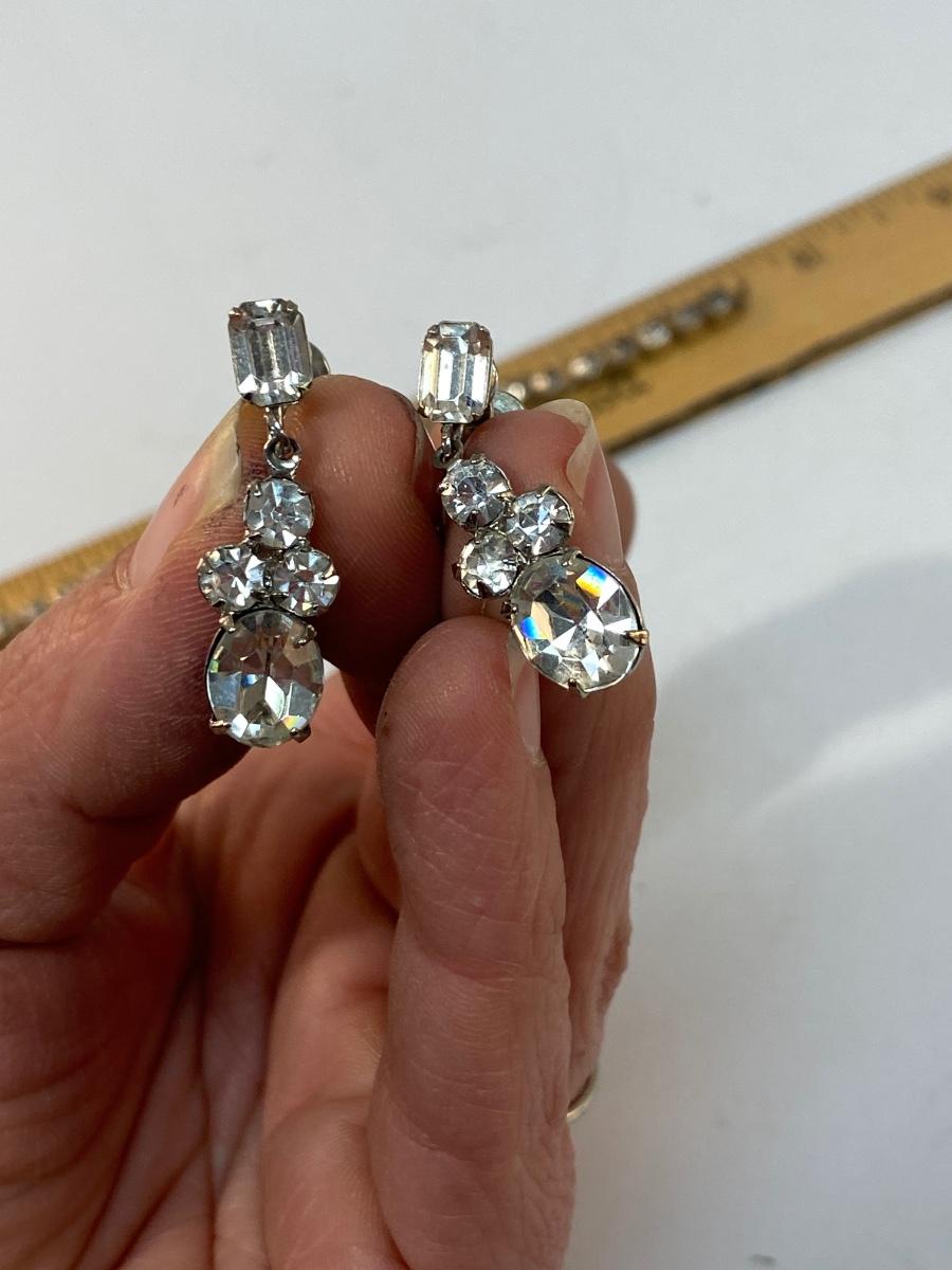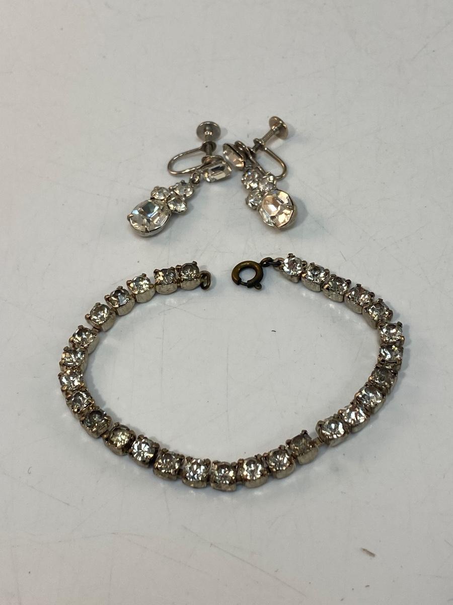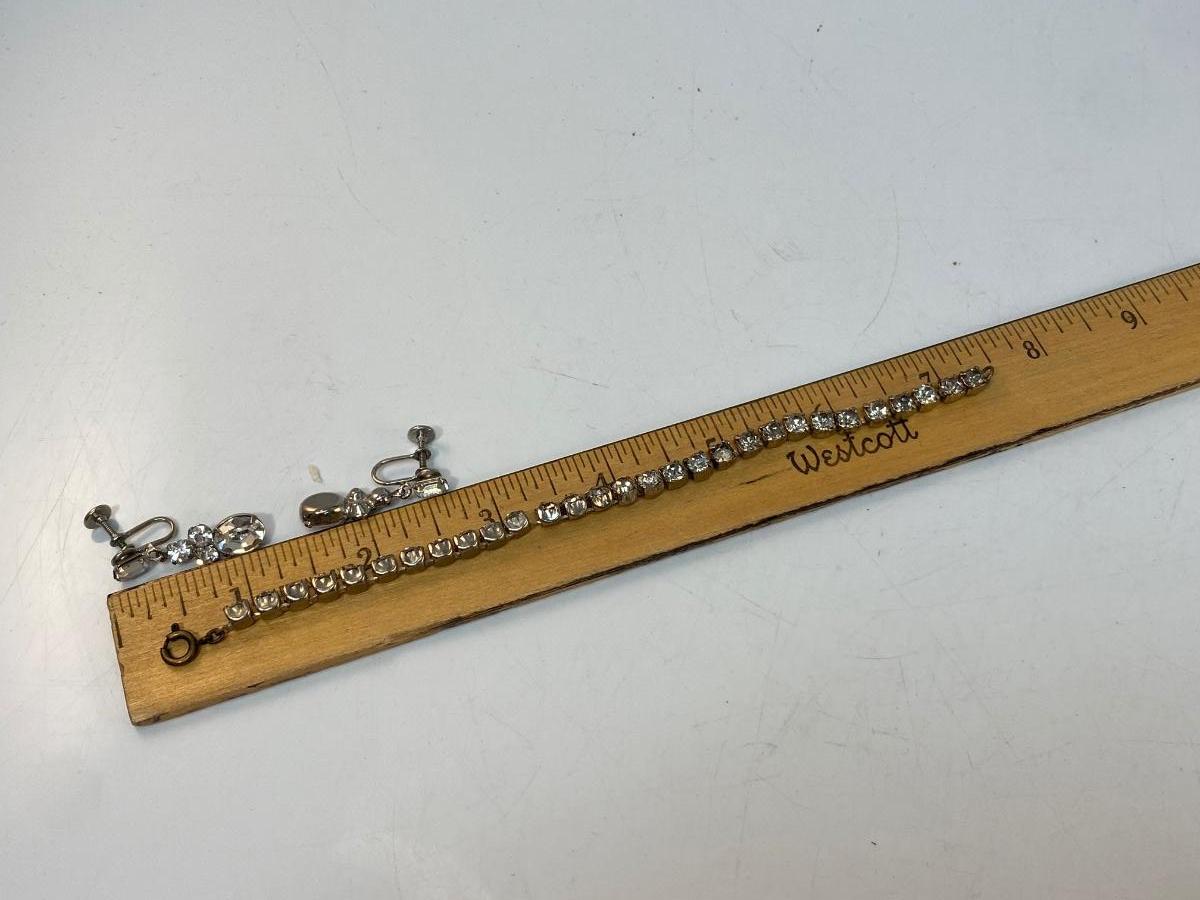 Vintage Silver Tone Setting Rhinestone Bracelet and Screw Back Earrings. Earrings are in good condition, brilliant clear rhinestones. Bracelet does have some discolored rhinestones and signs of age. Both are unbranded.
