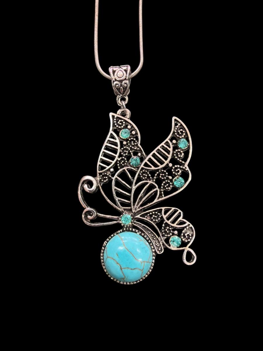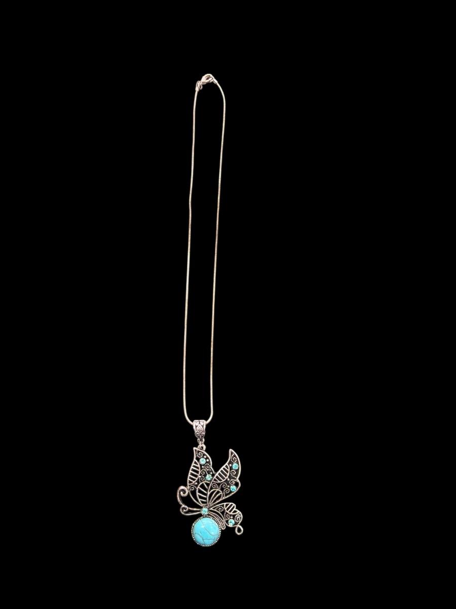 Vintage Silver Toned Butterfly Pendant Necklace With Faux Turquoise Accents
