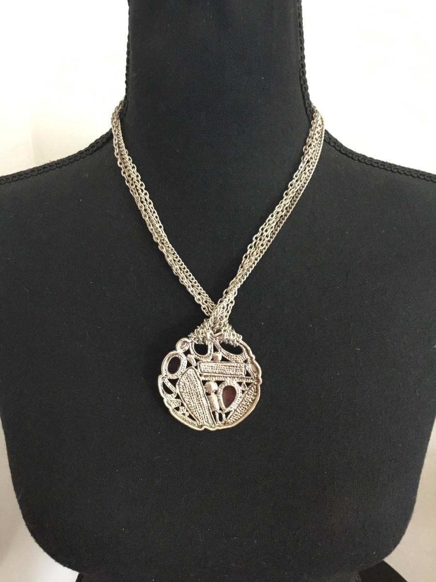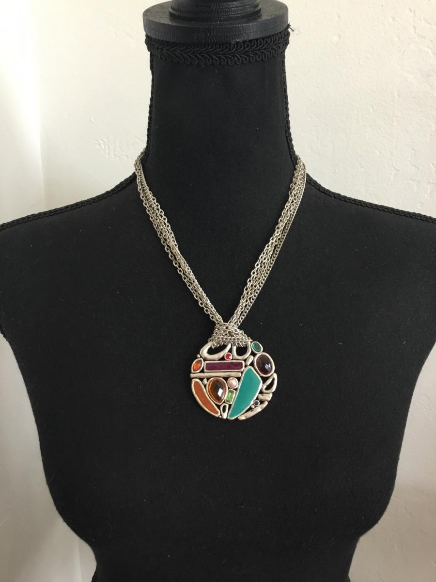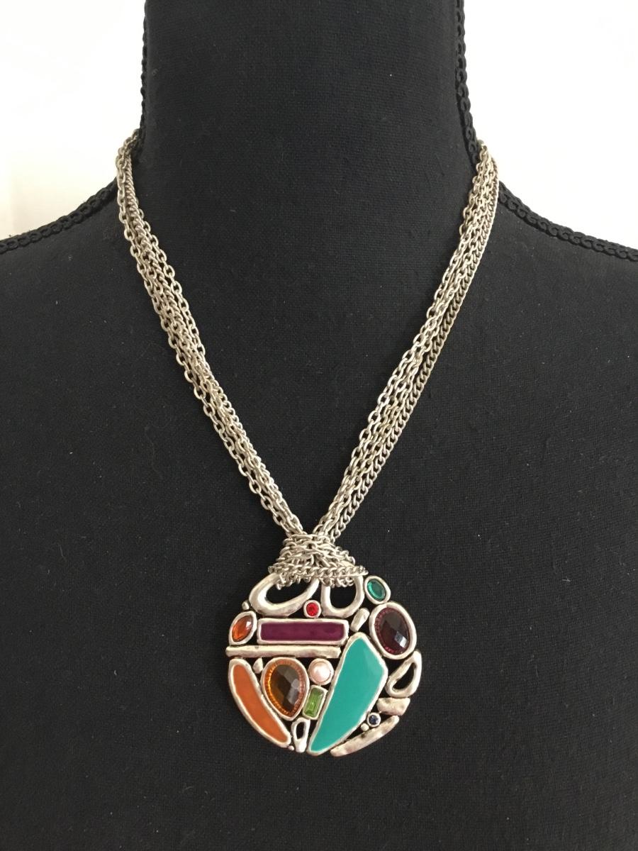 Vintage, silver toned enamel multicolor, crystal pendant necklace
