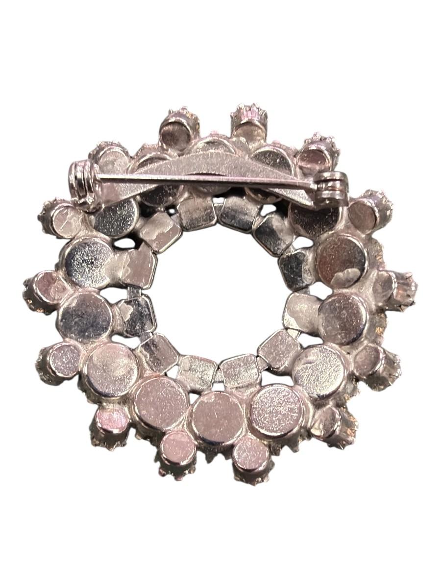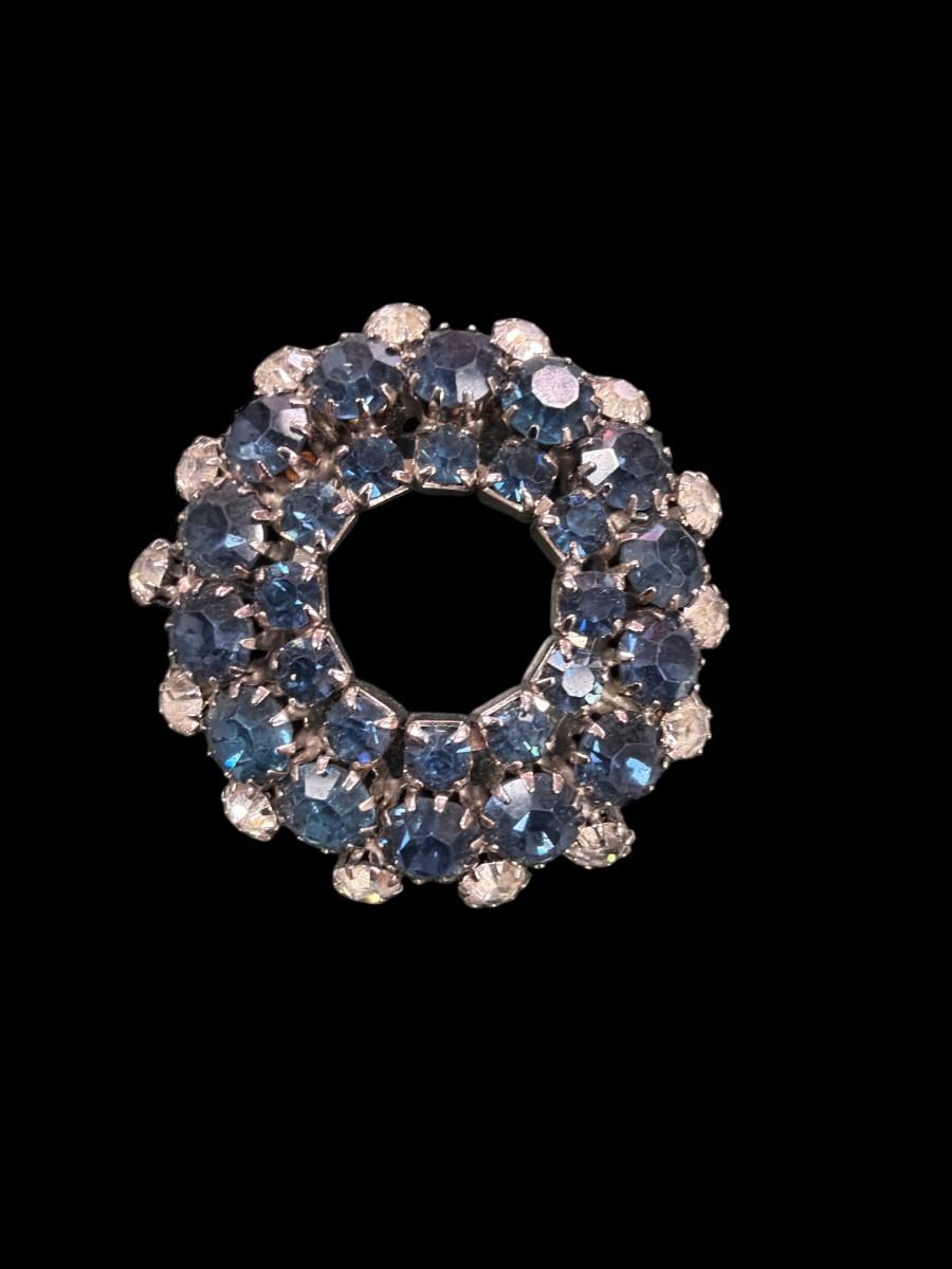 Vintage Silver Toned Rhinestone Wreath Brooch Featuring Concentric Circles of Blue and Clear Crystal