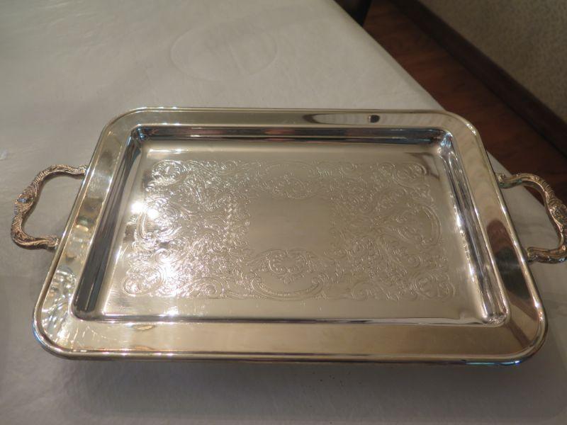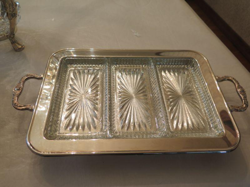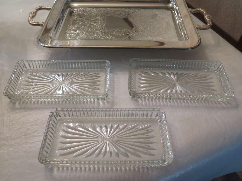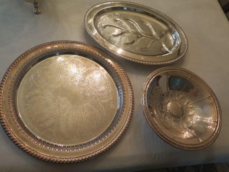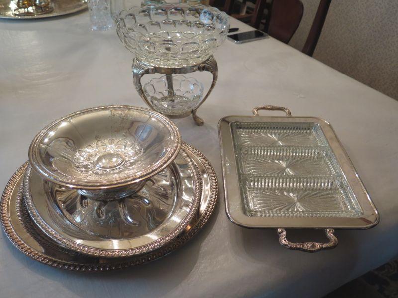 Vintage silverplate and glass serving trays. **Please read Terms and Conditions before placing a bid. Pick up is Sunday, September 15, 2019 from 11am to 4pm and Tuesday, September 17 from 4pm-7pm in Sicklerville. All sales are final. All sales are as is, where is. Please review all photos. Any props included in photos are not included in listing. All measurements are approximate.