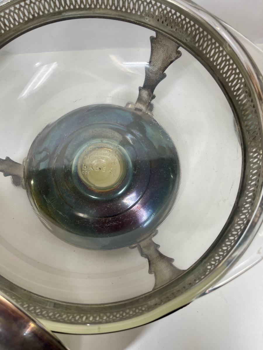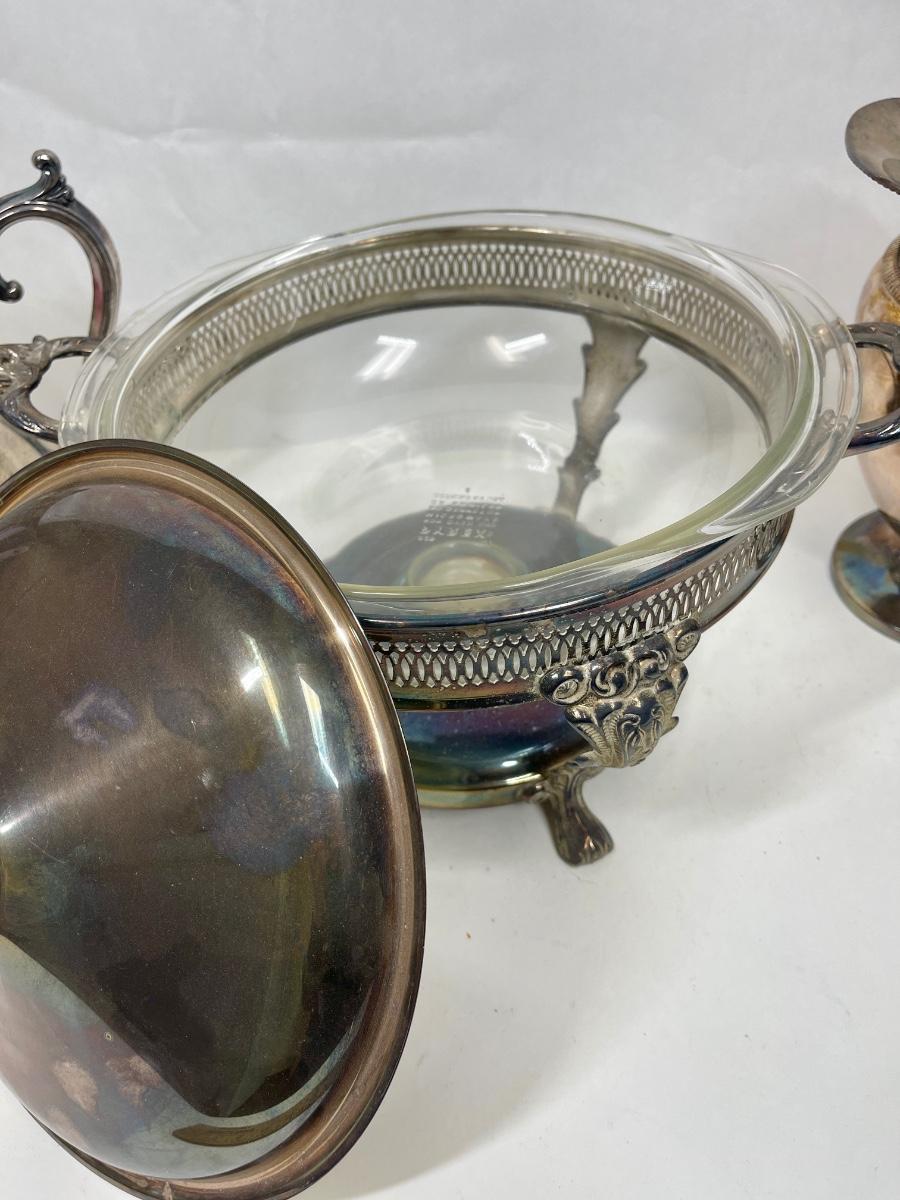 Pitchers by WM Rogers and Portsmouth Silverplate, chafing dish has no markings. Chafing dish includes the clear glass Pyrex insert. All in good condition with nice patina.