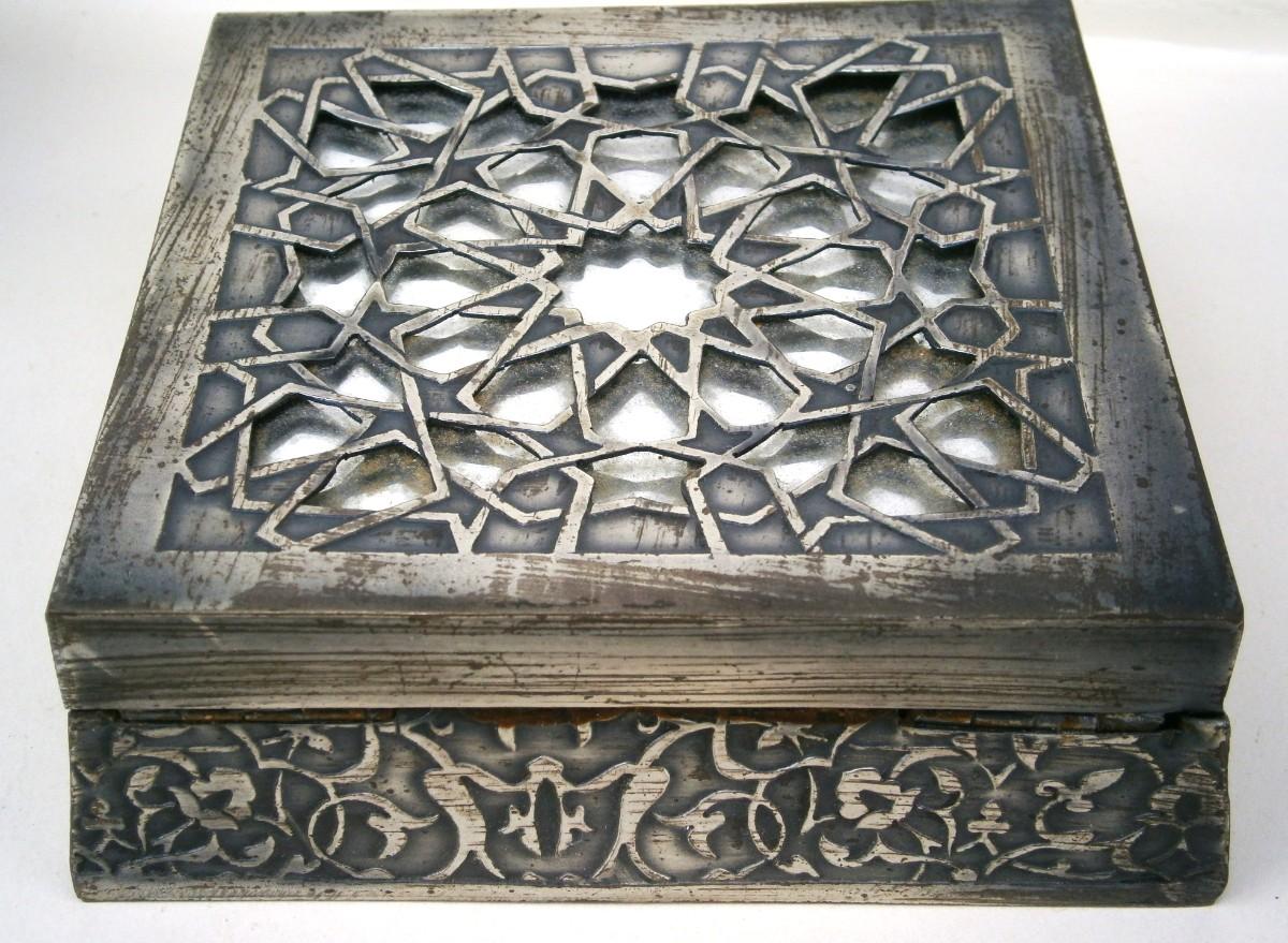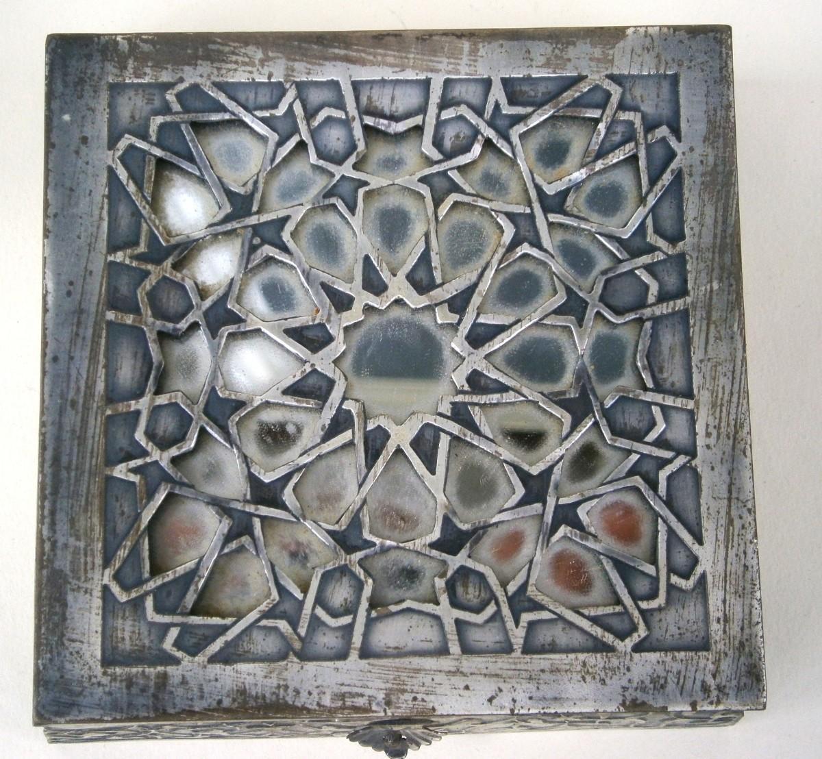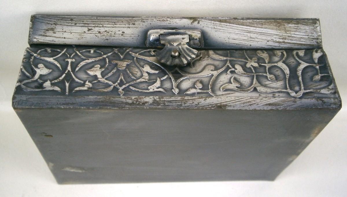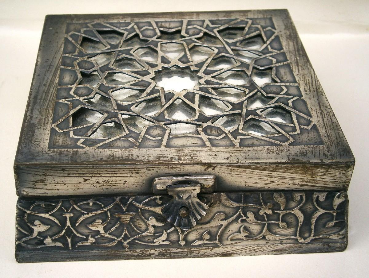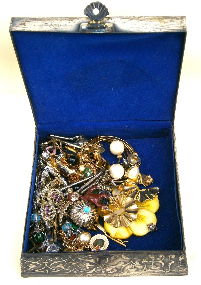 Vintage Silverplate Dresser Box with Costume Jewelry, box measures 4 1/2 x 4 12 x 1 1/2 in., top has mirror beneath metalwork, vintage jewelry consists of earring, necklaces,, pins, as pictured.