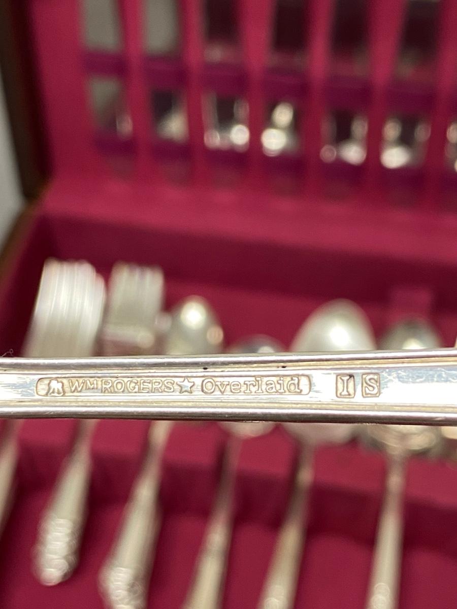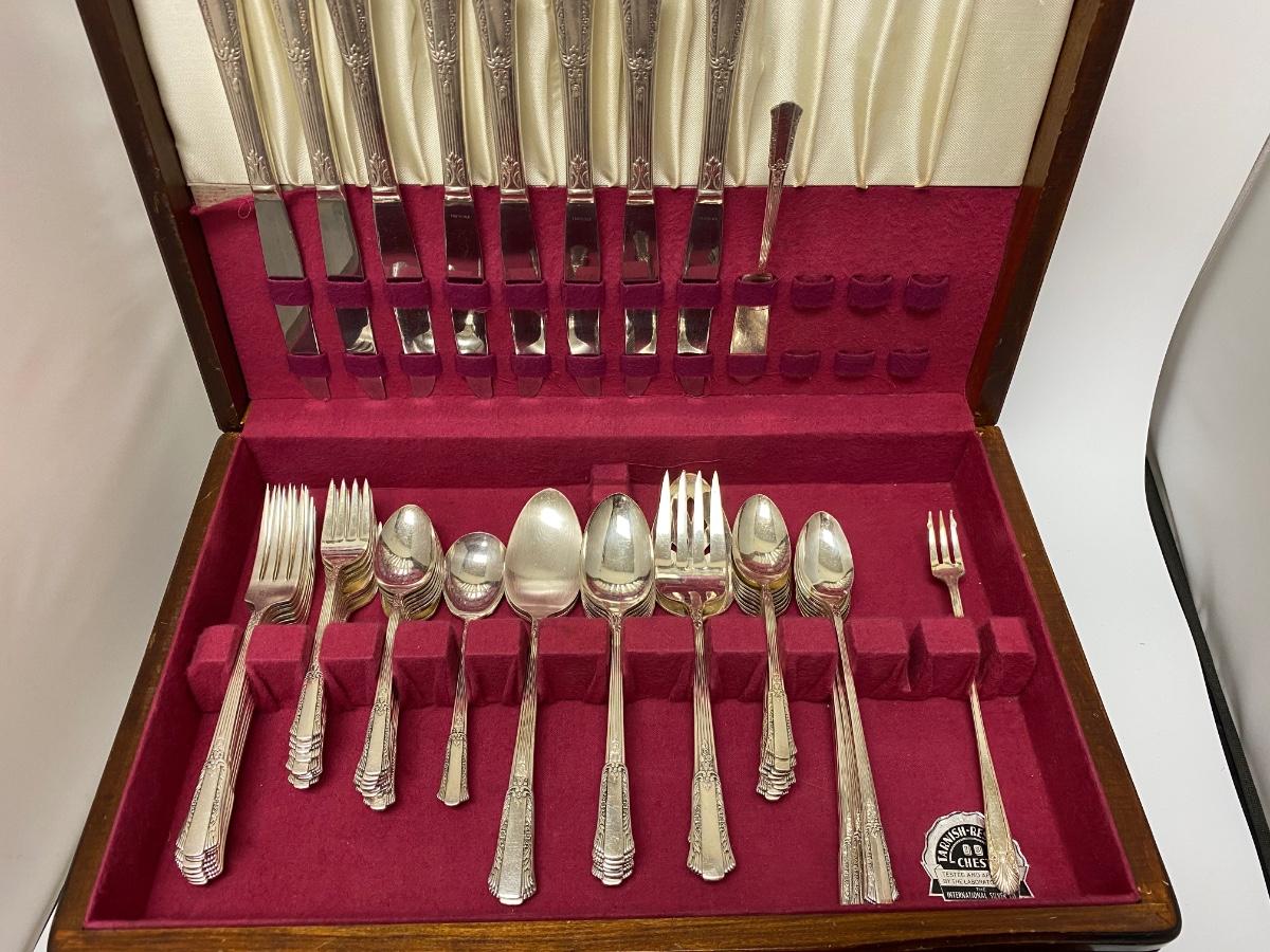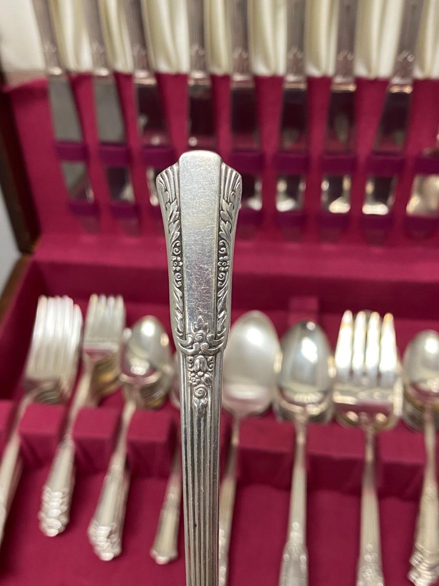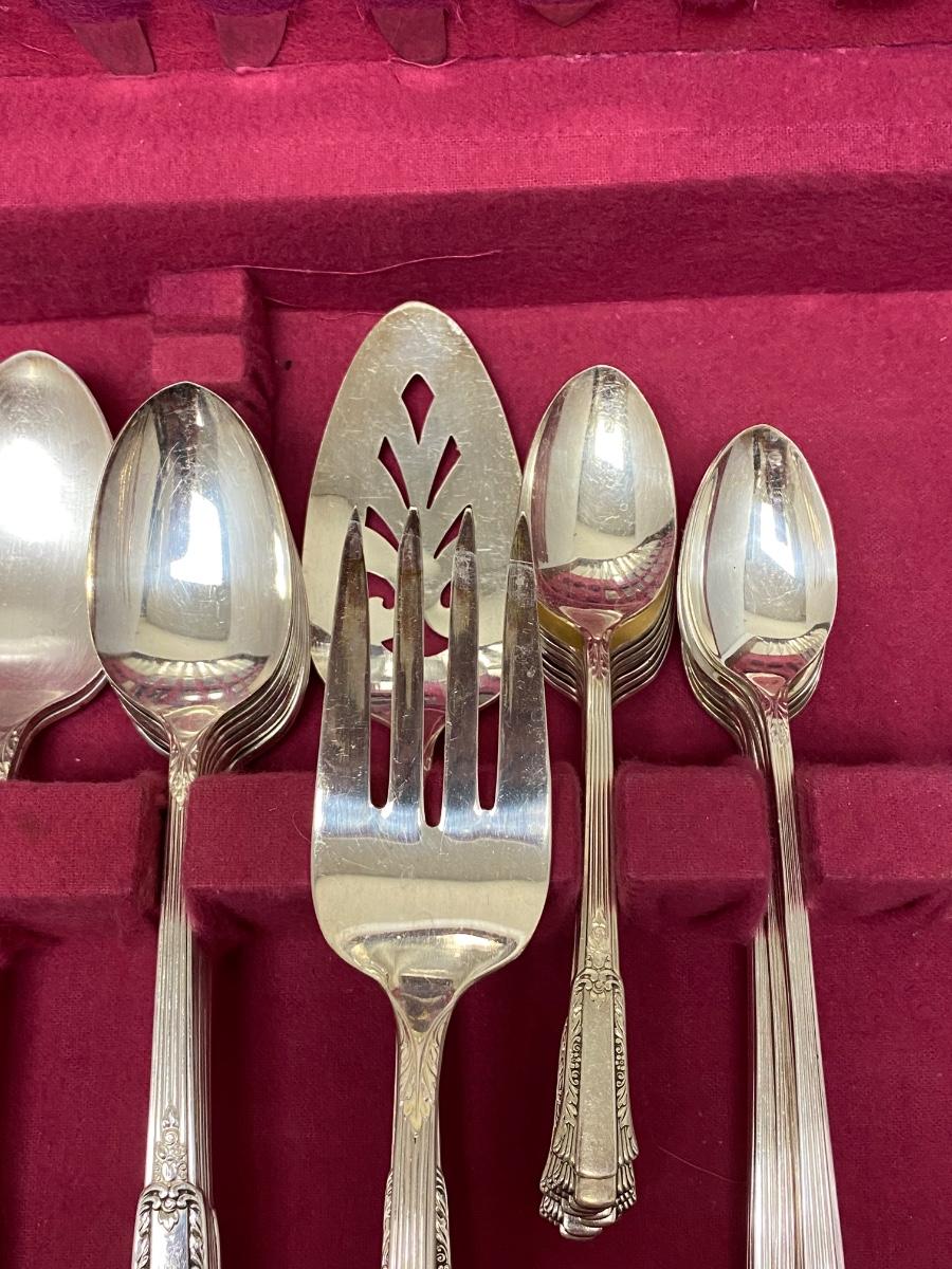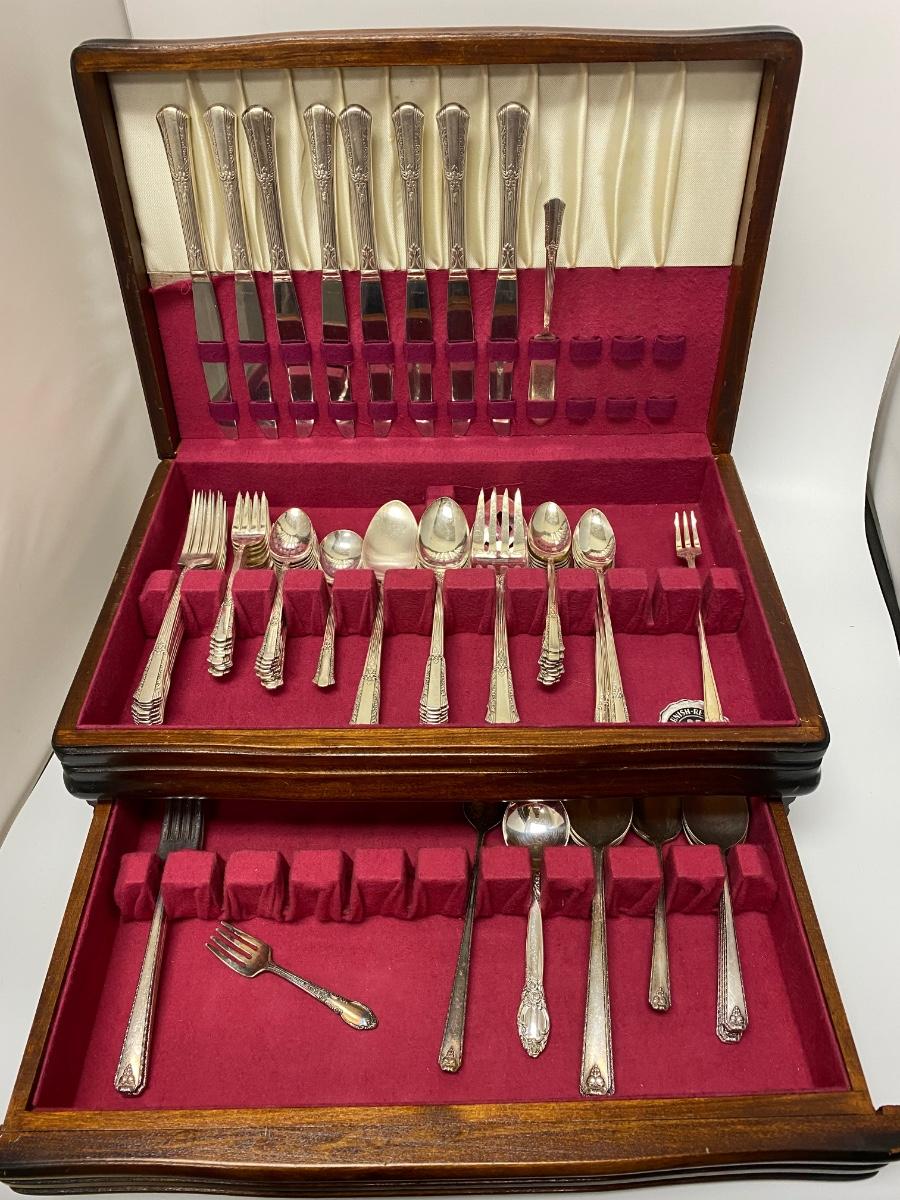 Service for 8 plus extras silverplate flatware set. Comes in felt lined box with hinged lid and a pullout drawer.
