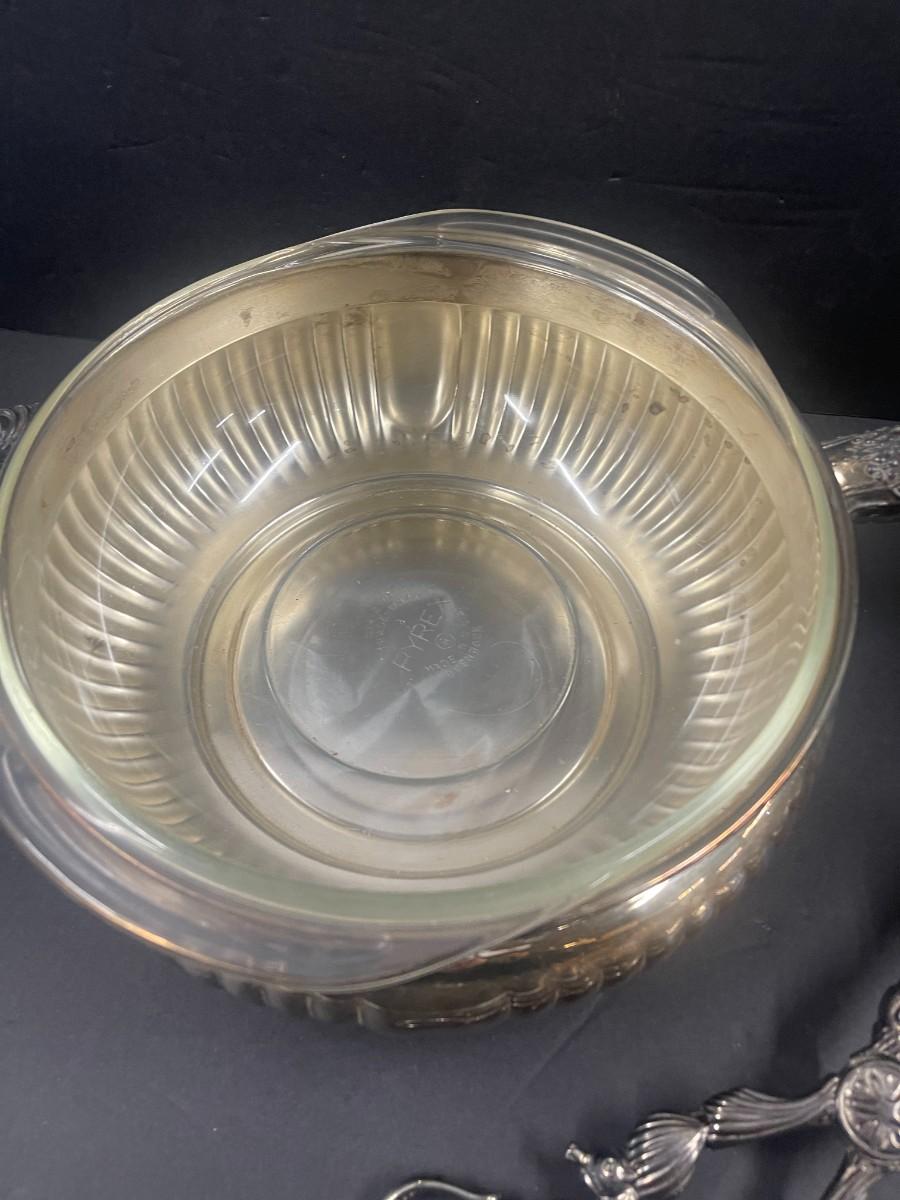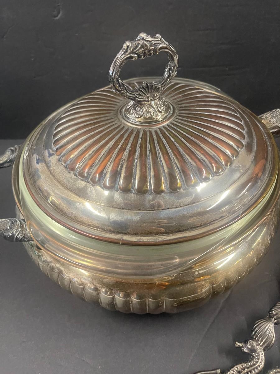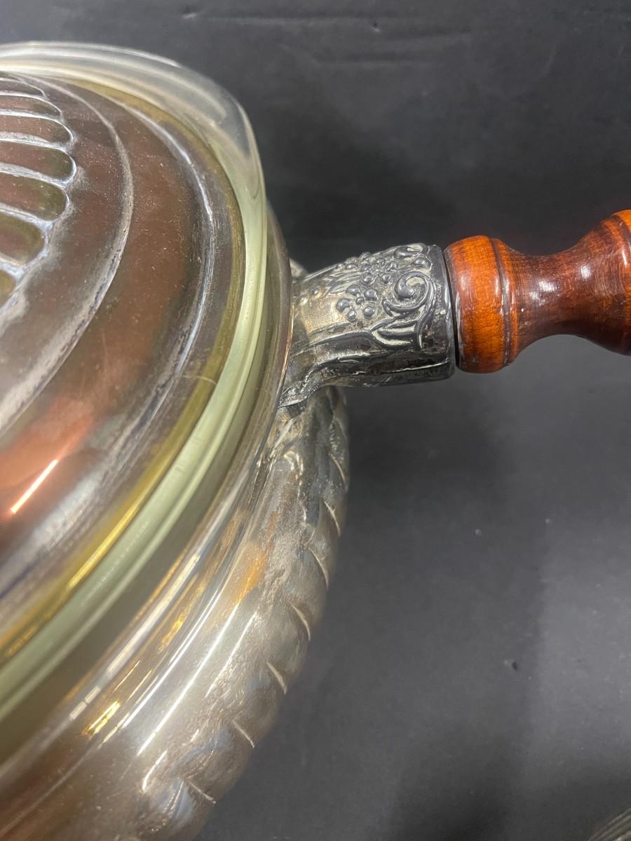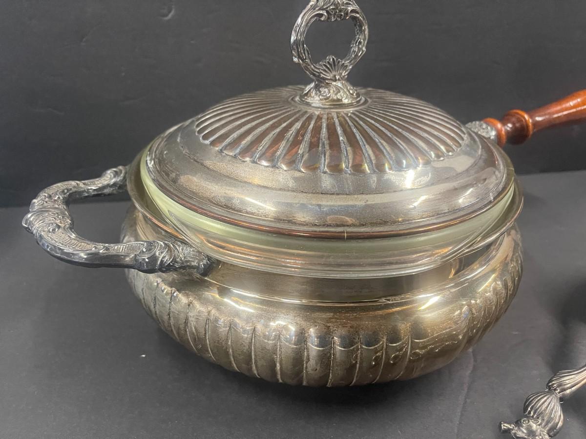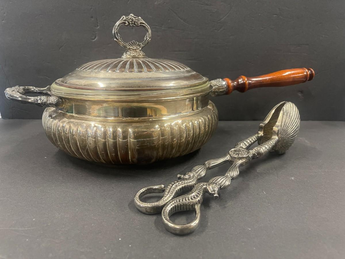 Vintage Silverplate Wood Handle Chafing Dish and Pair of Godinger Silverplate Tongs