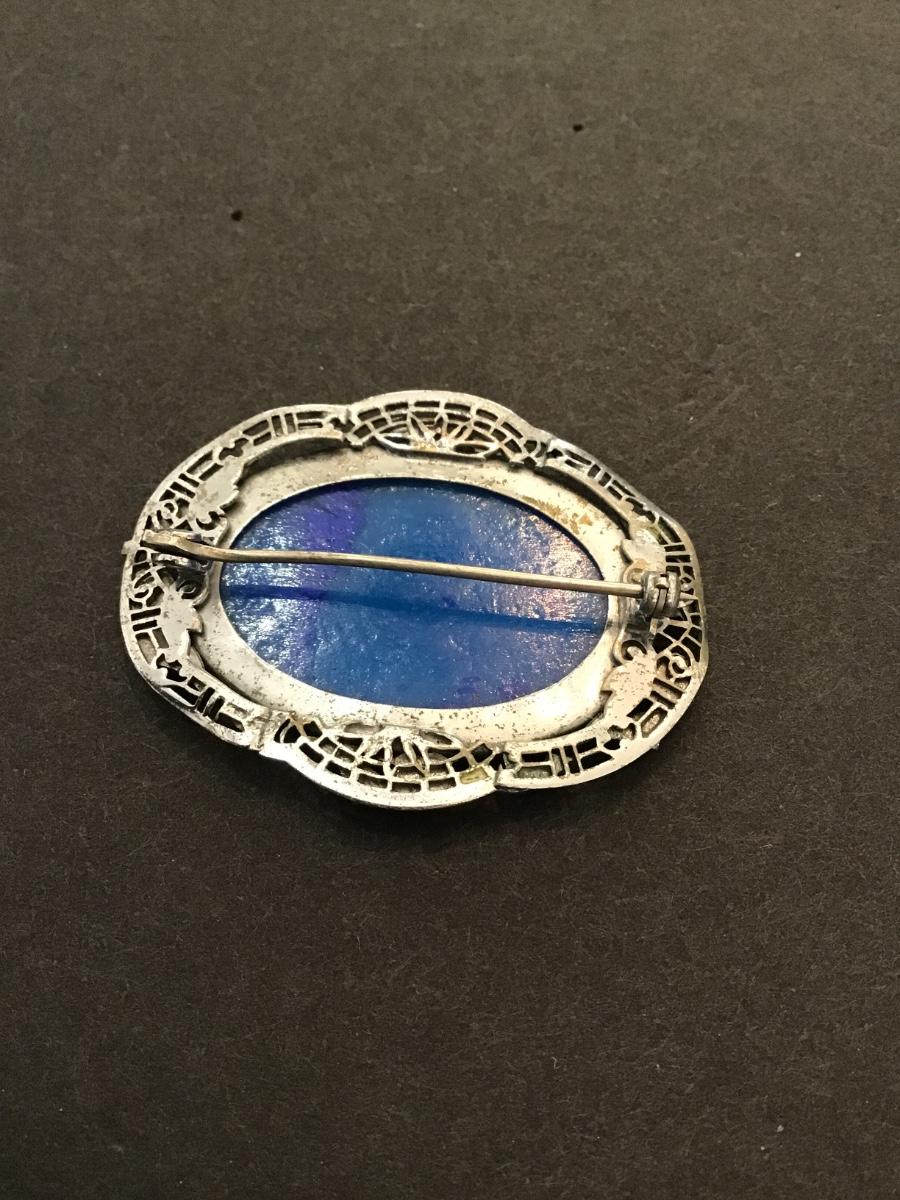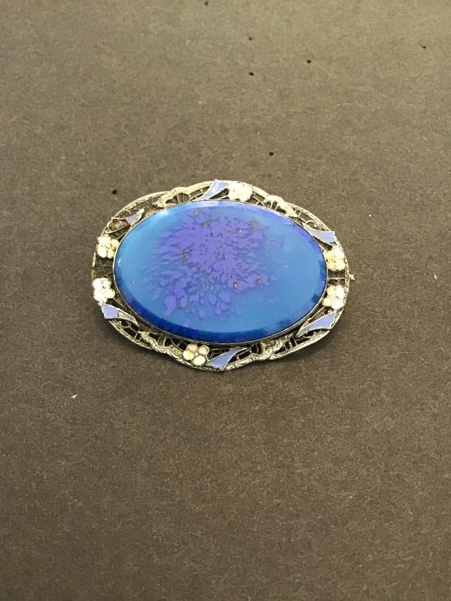 Vintage Silvertone brooch with blue marble glass. Very nice please see attached photos.