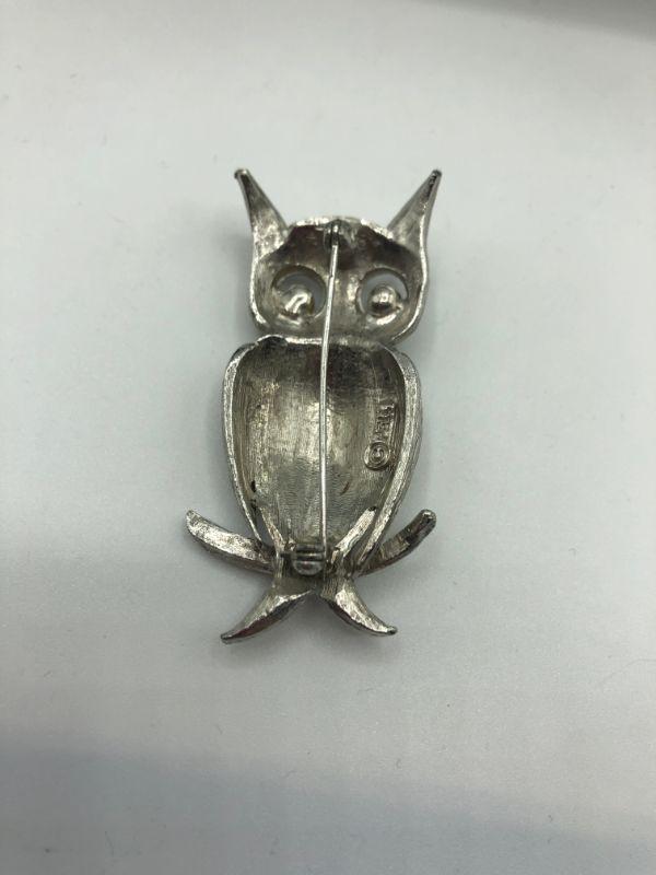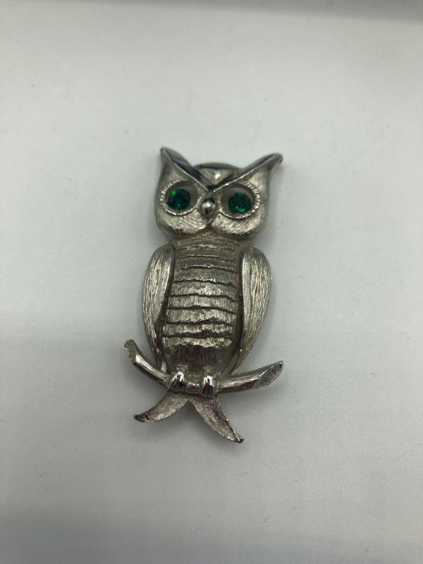 Vintage Silvertone Owl Brooch. Green rhinestone eyes. About 2".