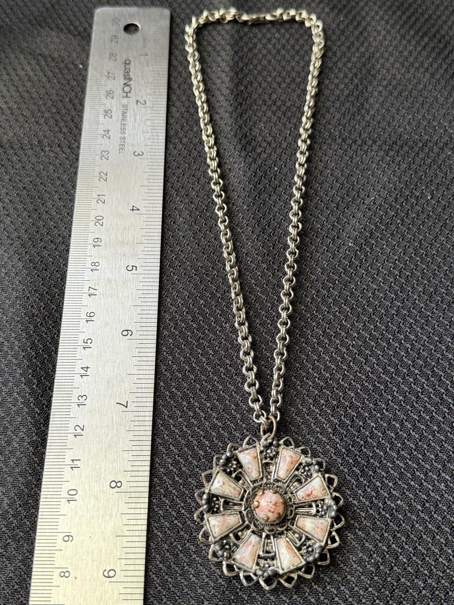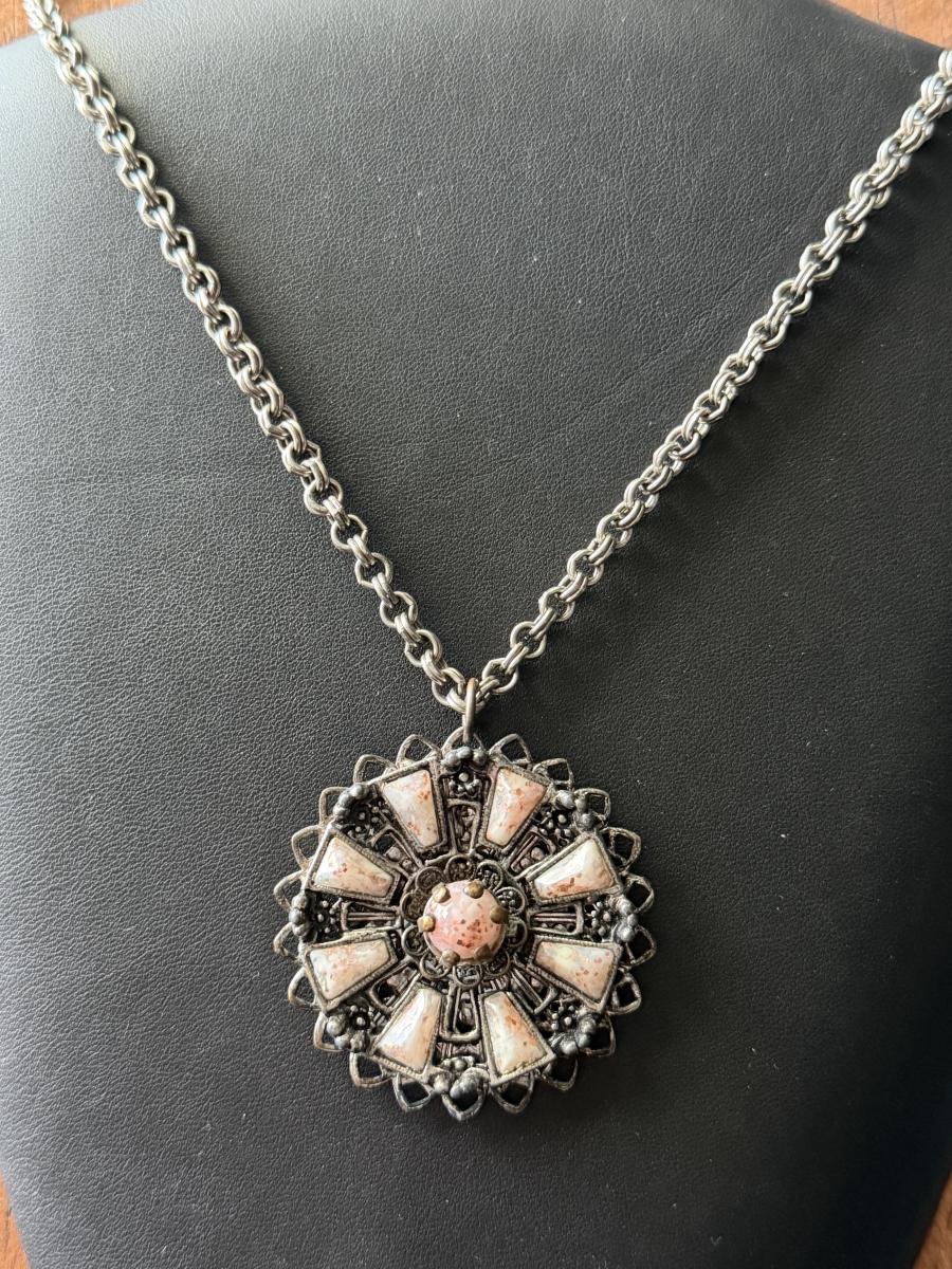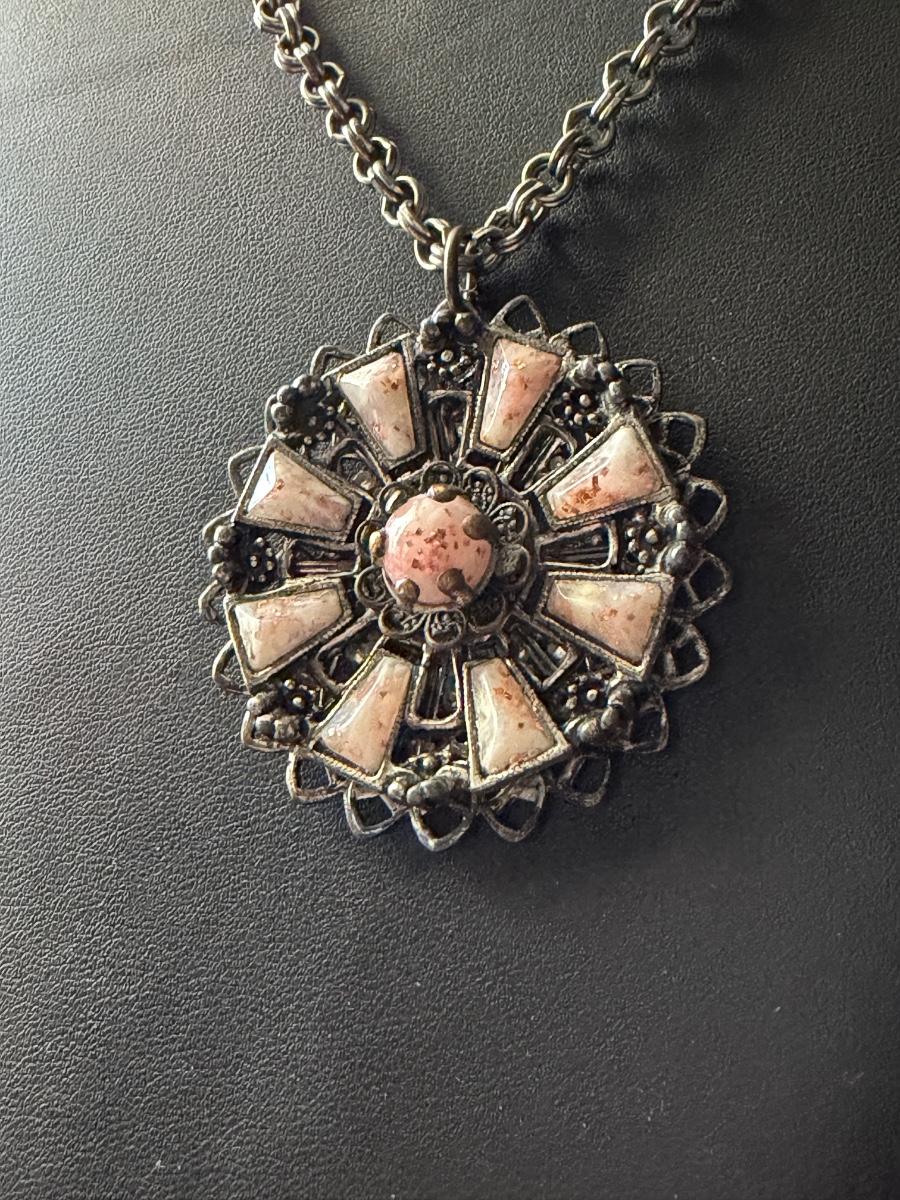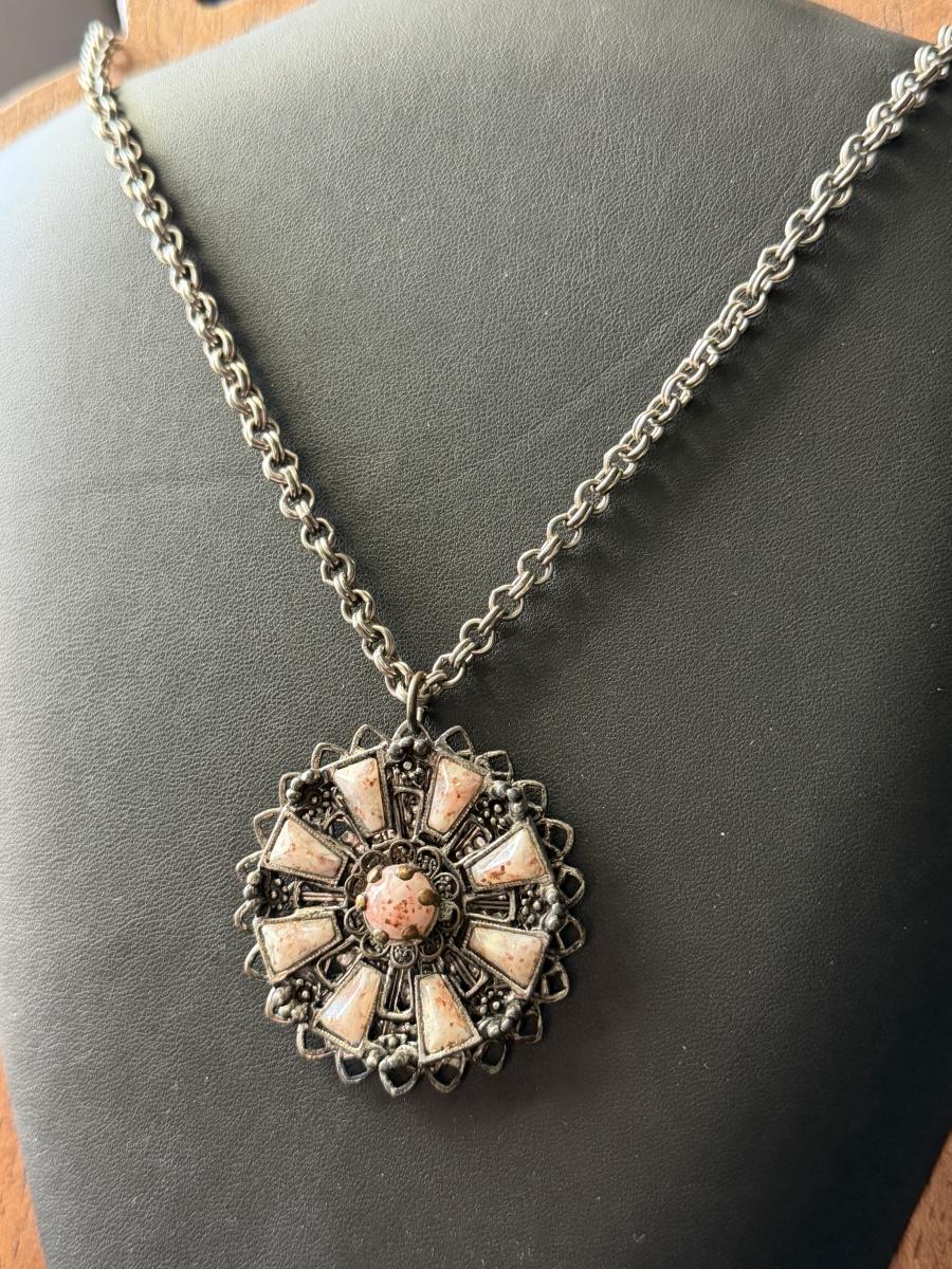 vintage silver-toned necklace with a pinwheel-design thermoset pendant
