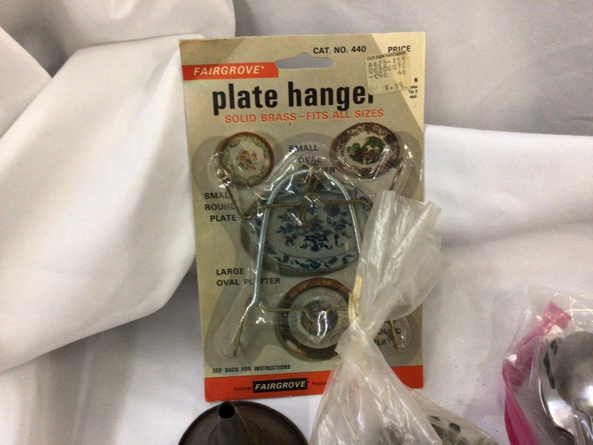 You get lots of vintage silverware, metal frosting tips, metal small tart tins, funnel, jar opener and plate hanger.