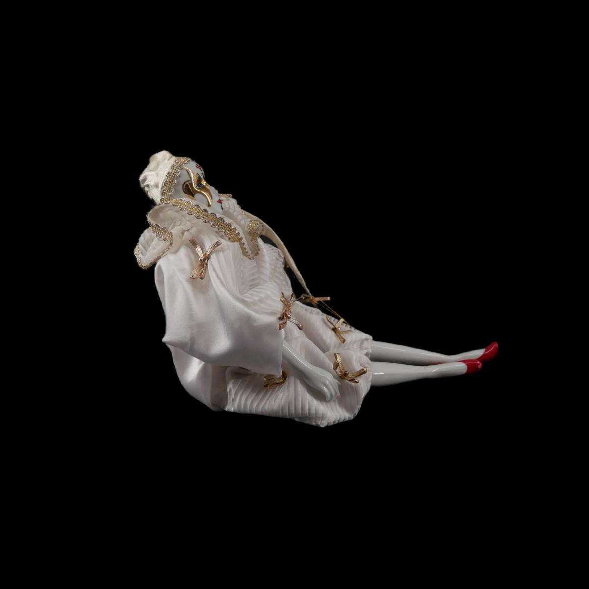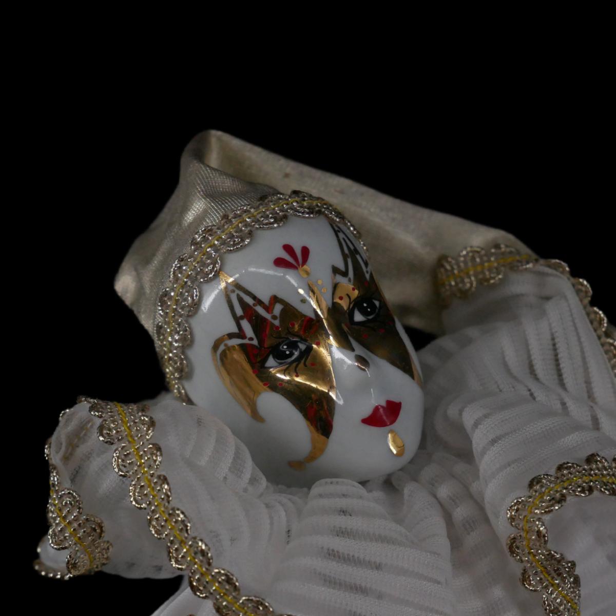 Vintage Silvestri porcelain harlequin jester doll with gold and red paint. Painted fingernails, shoes, and face. Stunning doll in great condition! Some paint wear (see photos). Measures approximately 18" in length, weighs 13 oz. (C120)