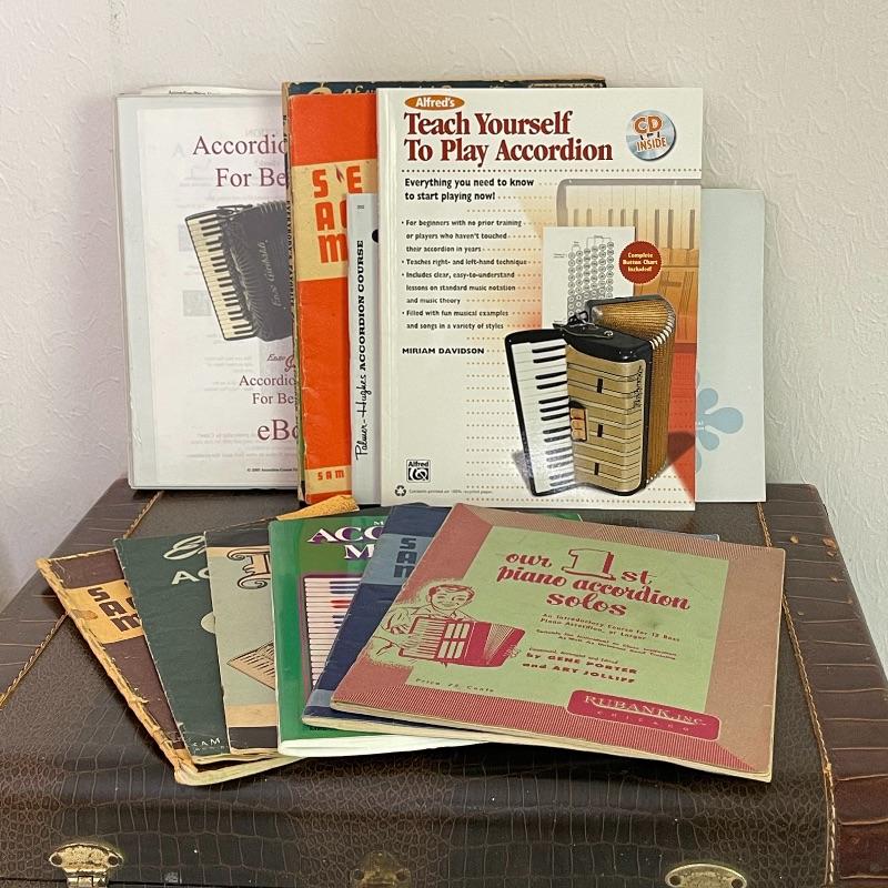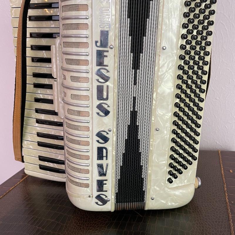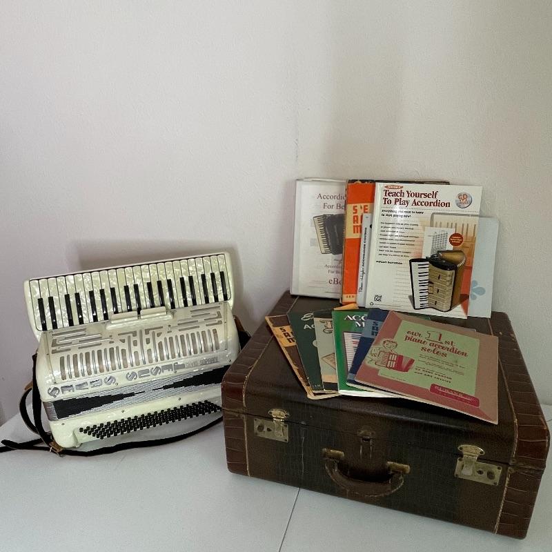 WORKS! Includes original case and several instructional books. “JESUS SAVES” emblem in silver. Teach yourself to Play Accordian includes a CD.