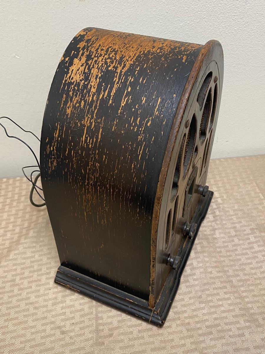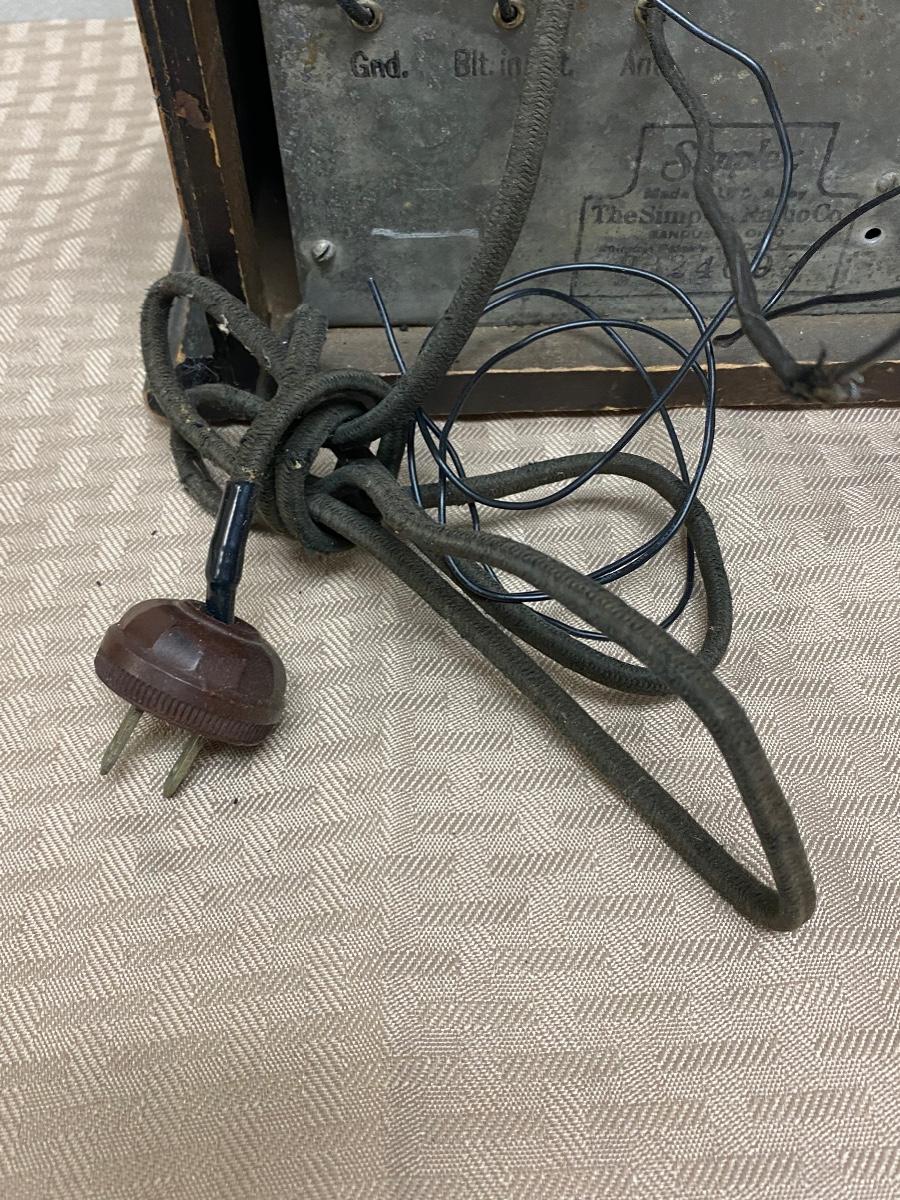 Vintage Simplex Radio Co tube radio. Cathedral style table radio. Untested, has an old style knob, but does seem to have maybe an antenna wire attached so it may work. Wood has signs of age and wear. Displays nicely. About 12" tall.