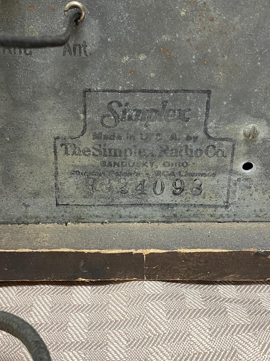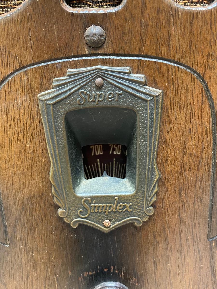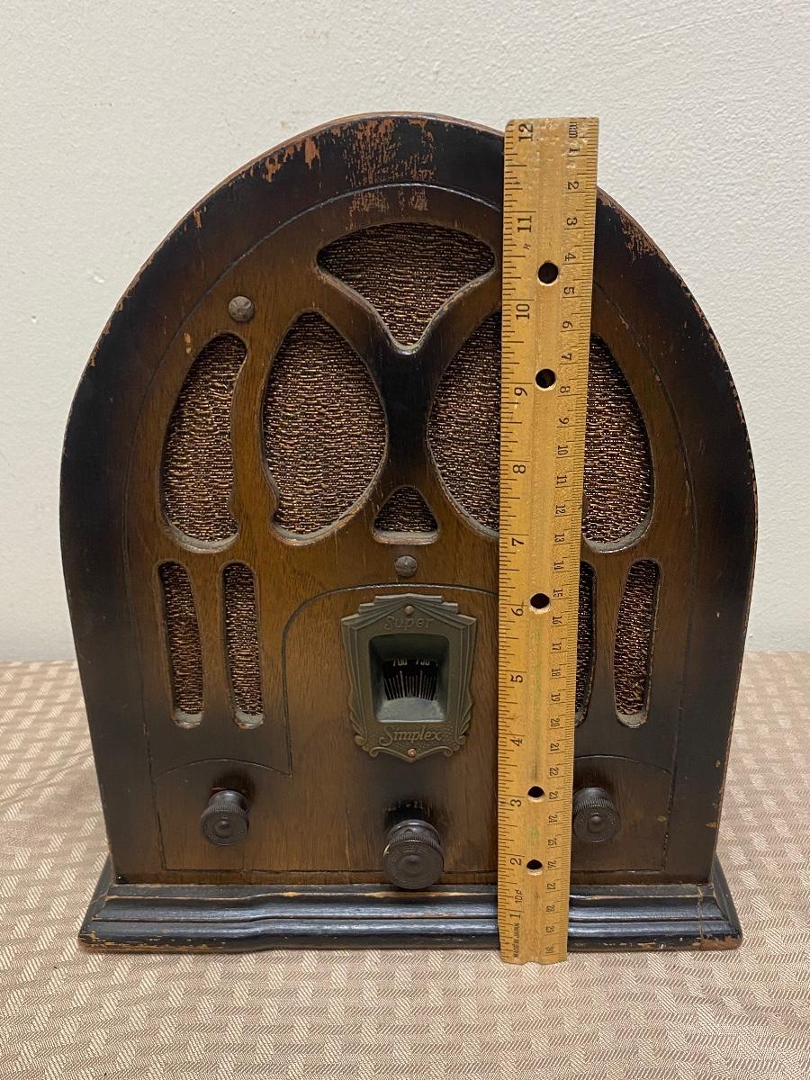Vintage Simplex Radio Co tube radio. Cathedral style table radio. Untested, has an old style knob, but does seem to have maybe an antenna wire attached so it may work. Wood has signs of age and wear. Displays nicely. About 12" tall.