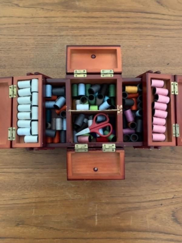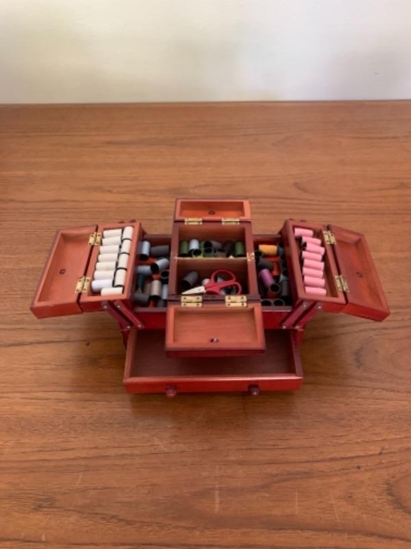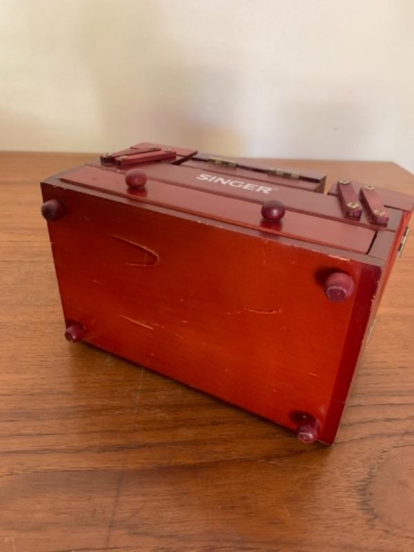 Vintage wood accordion sewing box by Singer. Missing handle piece in center.