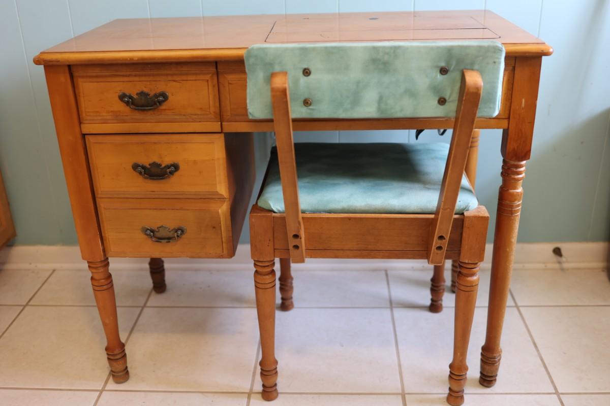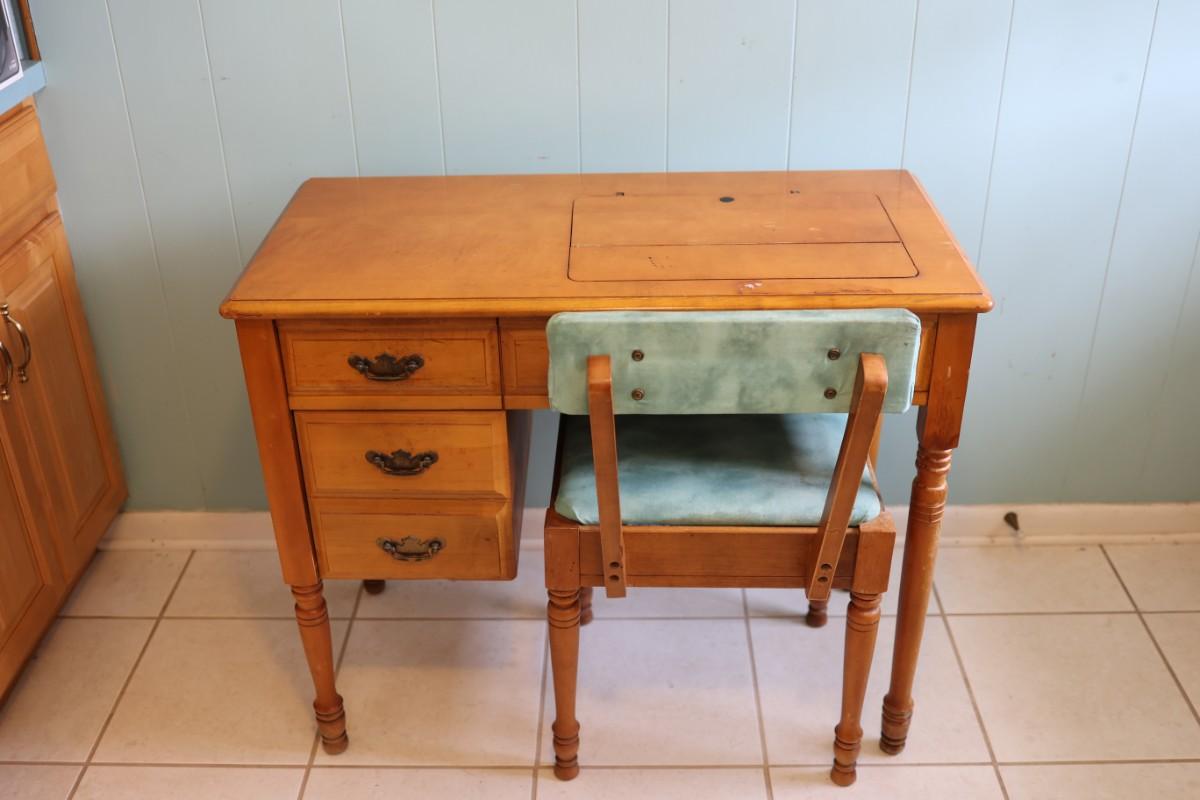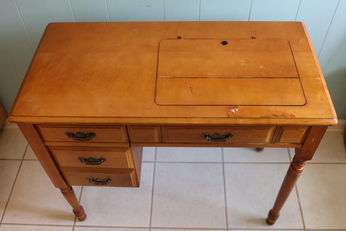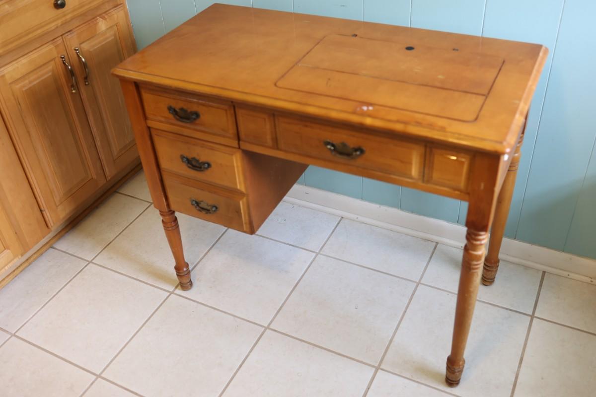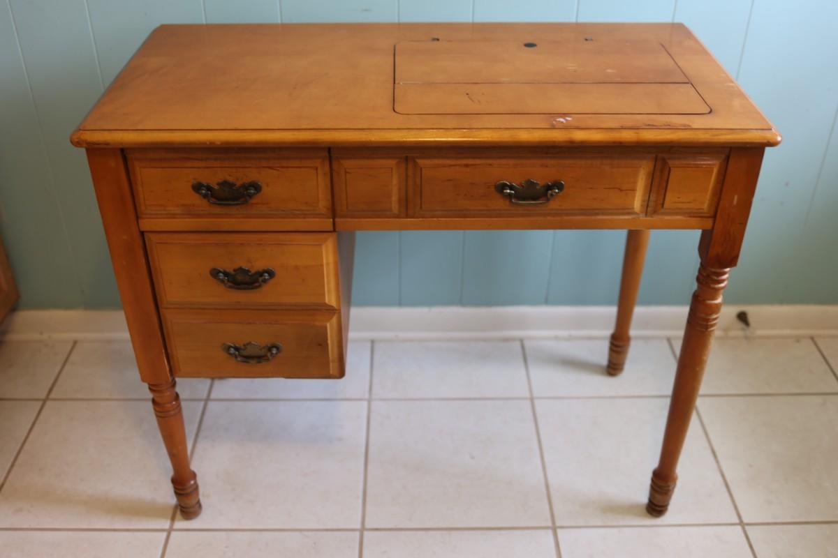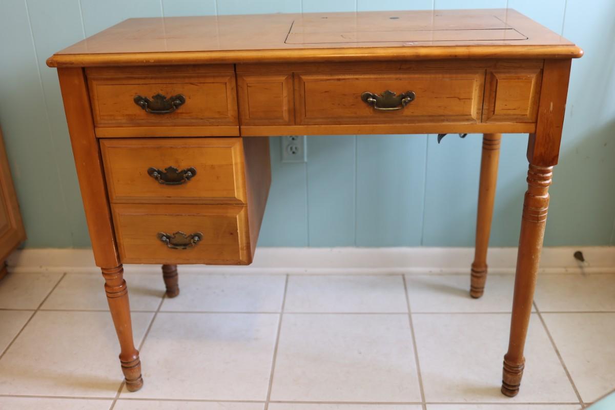 Sewing machine comes out and could be used as a desk. Three drawer.