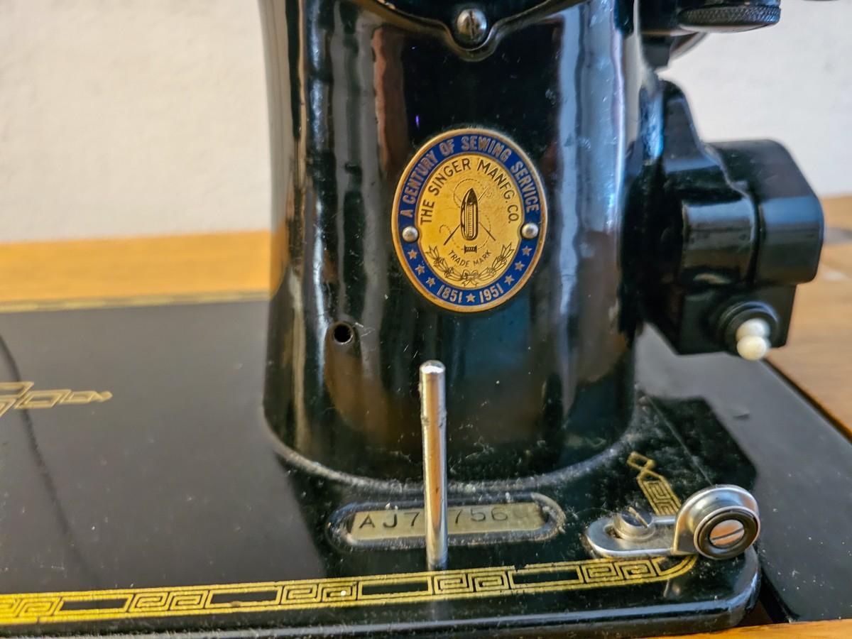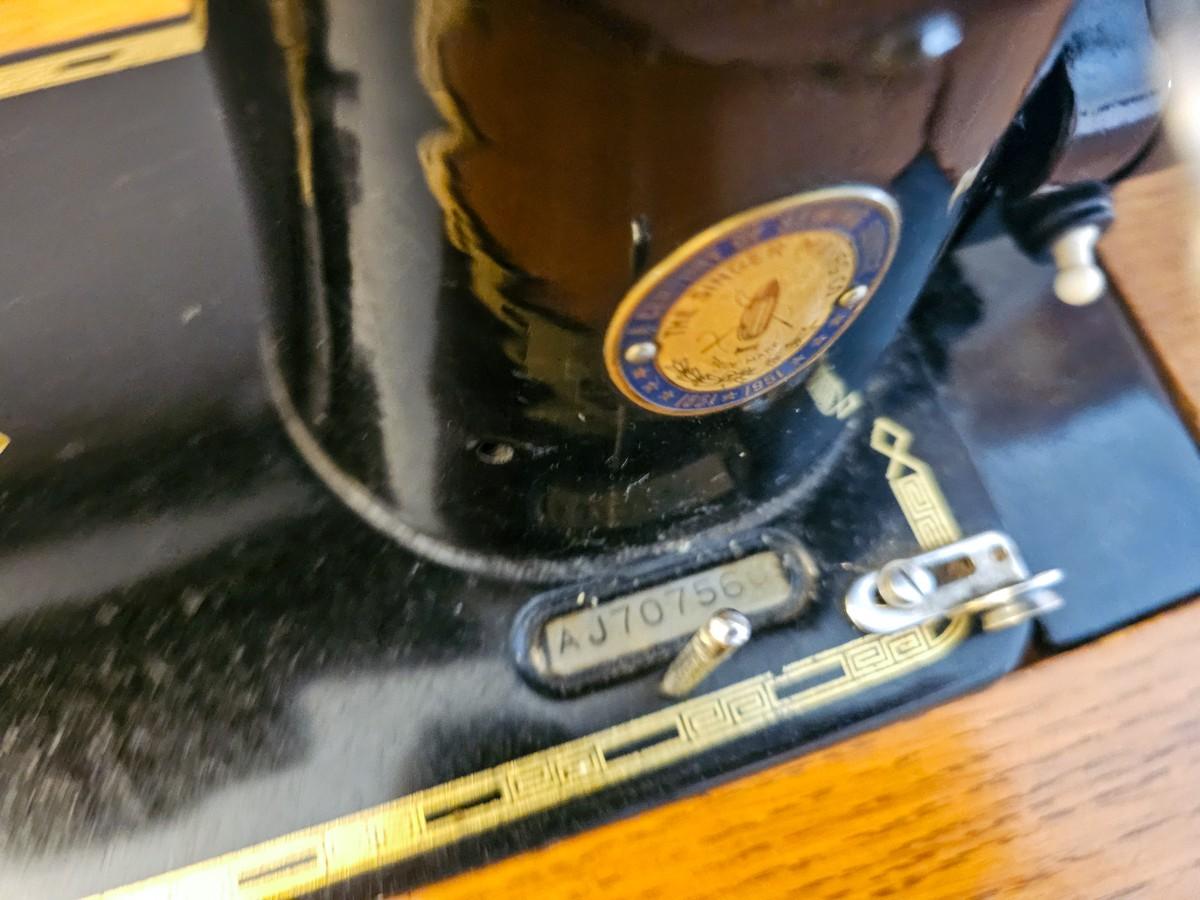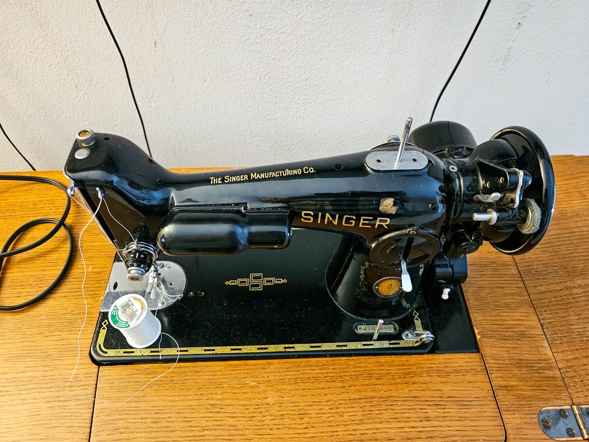 Vintage Singer sewing machine (Model AJ70756) with cabinet and stool. Untested. If you would like to see the machine in person and test it, please contact Melody at 318.459.8068.
