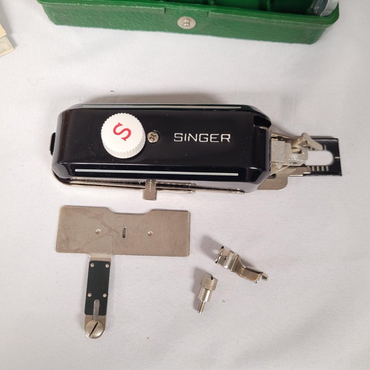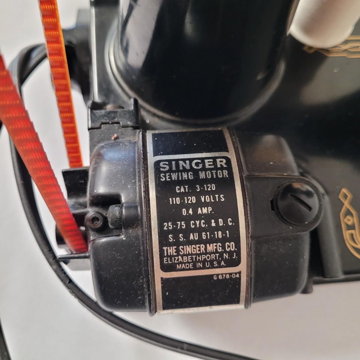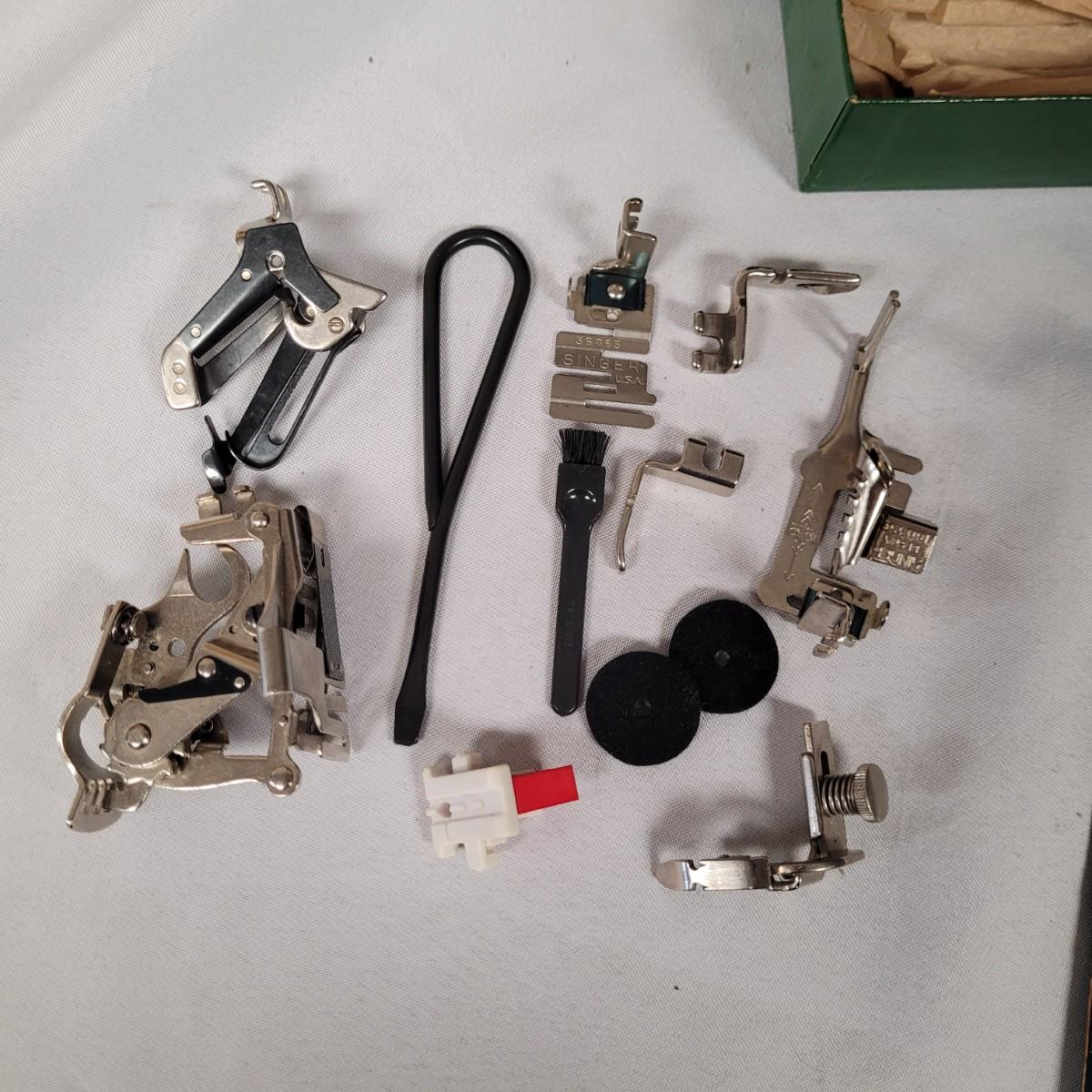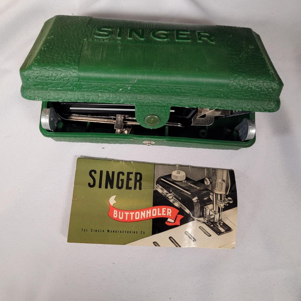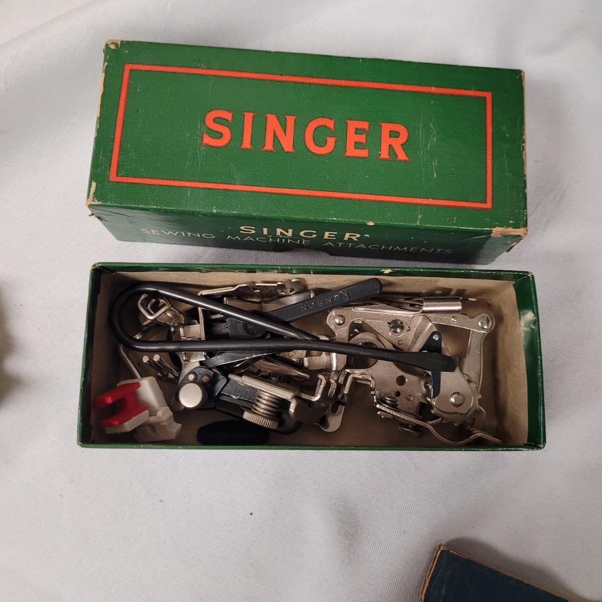 Vintage Singer sewing machine in hard locking case with accessories, including machine attachments, button holer, oil and manual. Machine works when tested. Model no AM692904 found on bottom of machine. Sewing box includes a variety of threads, spools, thimbles, needles, elastic threader, pins, embroidery hoops, measuring tape, a large assortment of buttons, and other miscellaneous items. See manufacturer plate for machine info. Sewing machine case measures approximately 14.5"L x8"D x11"H. Shipping available.