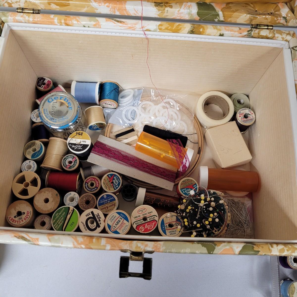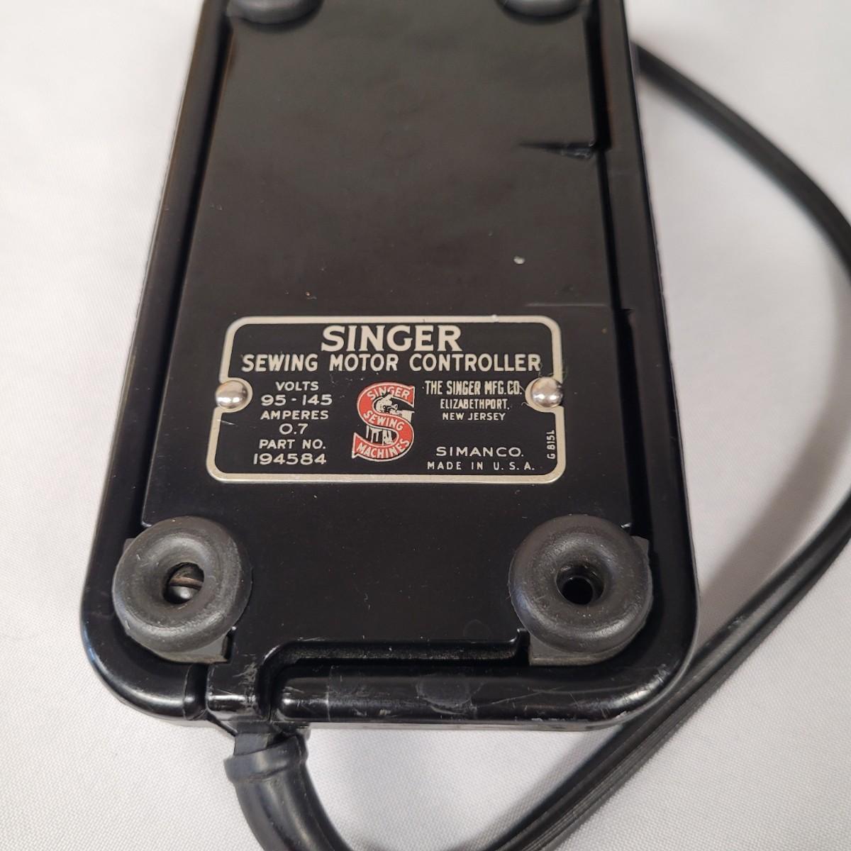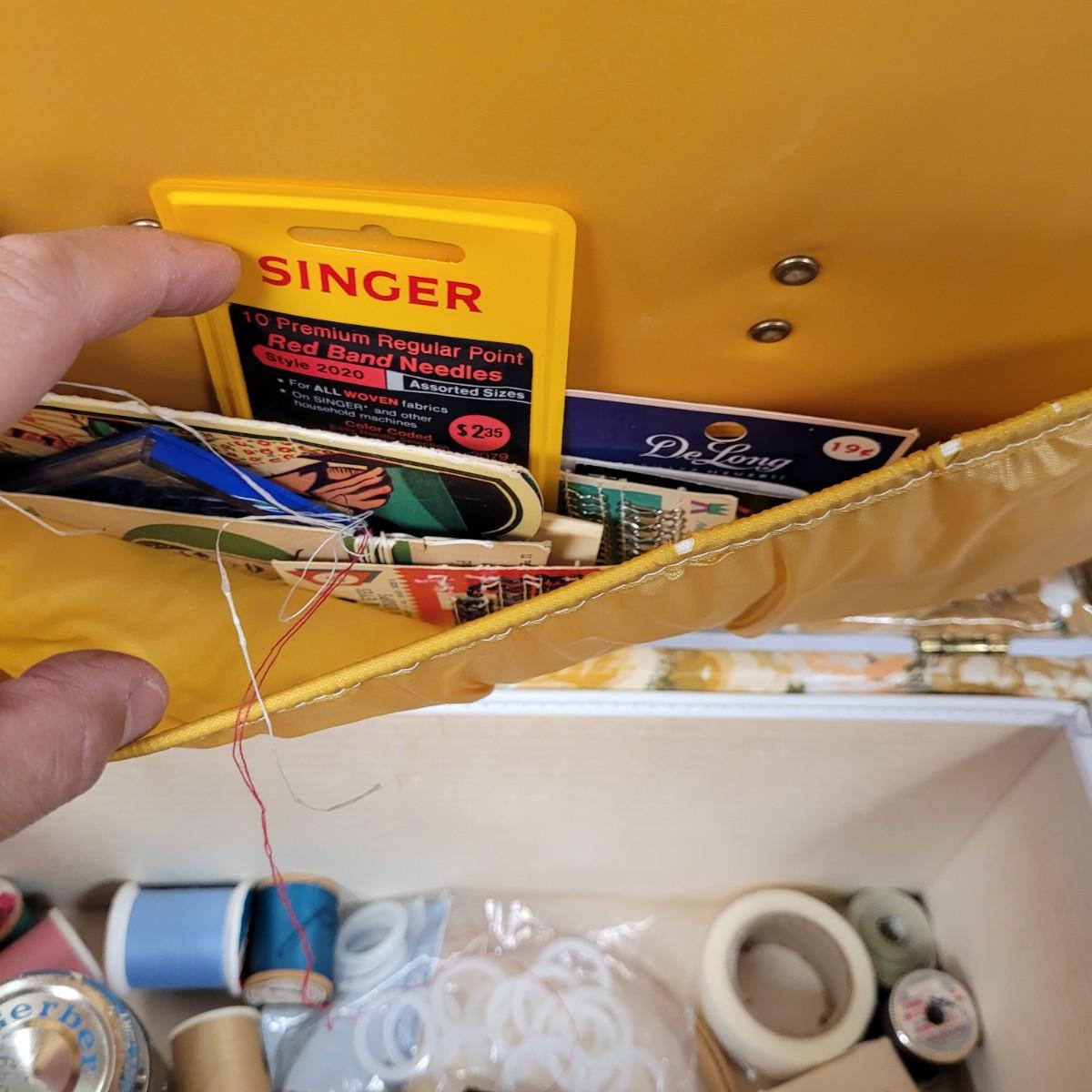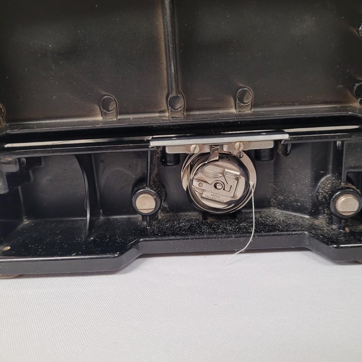 Vintage Singer sewing machine in hard locking case with accessories, including machine attachments, button holer, oil and manual. Machine works when tested. Model no AM692904 found on bottom of machine. Sewing box includes a variety of threads, spools, thimbles, needles, elastic threader, pins, embroidery hoops, measuring tape, a large assortment of buttons, and other miscellaneous items. See manufacturer plate for machine info. Sewing machine case measures approximately 14.5"L x8"D x11"H. Shipping available.