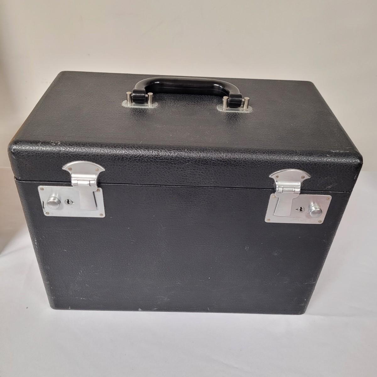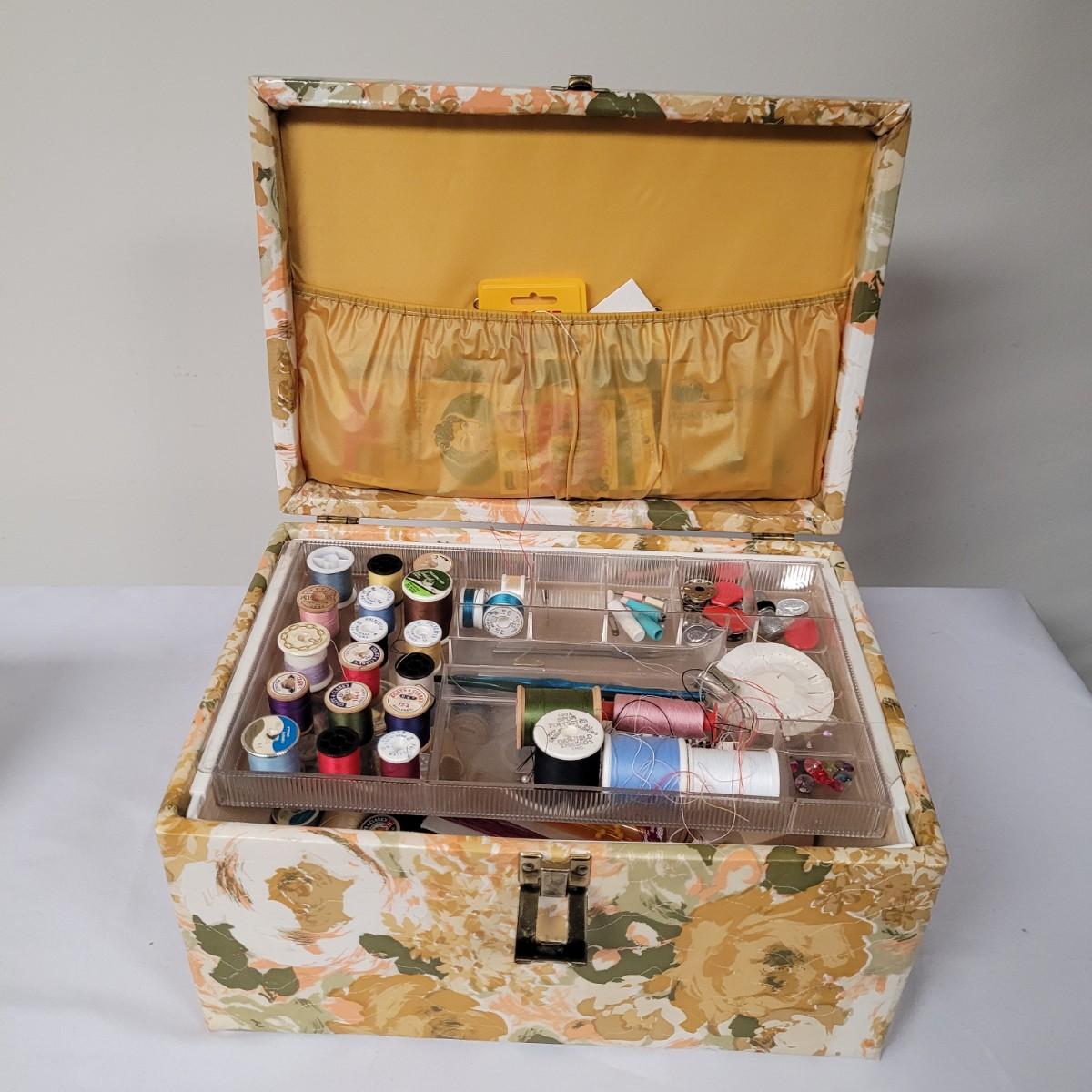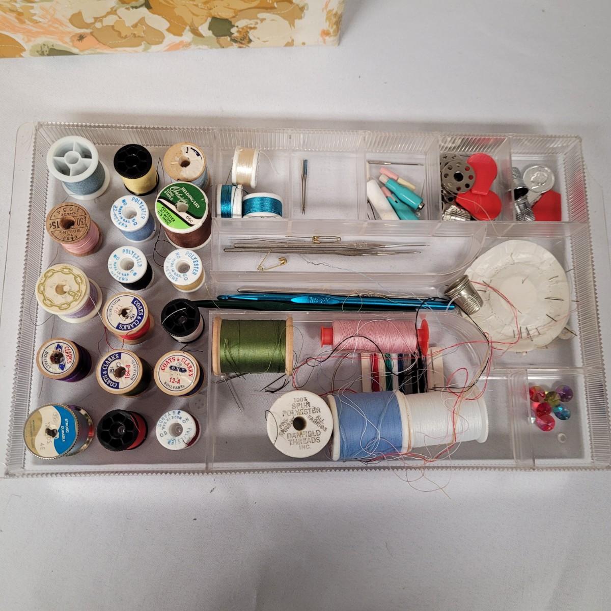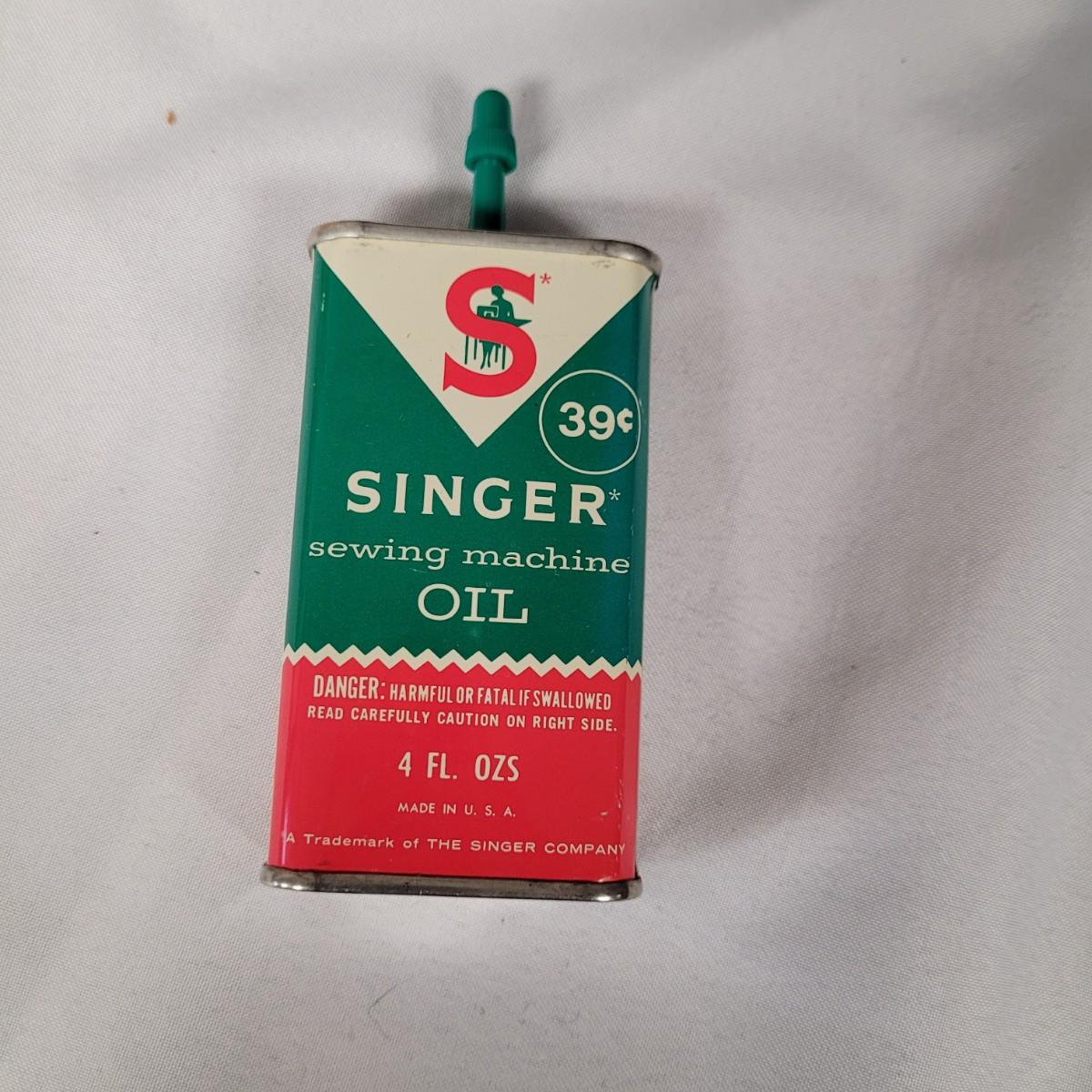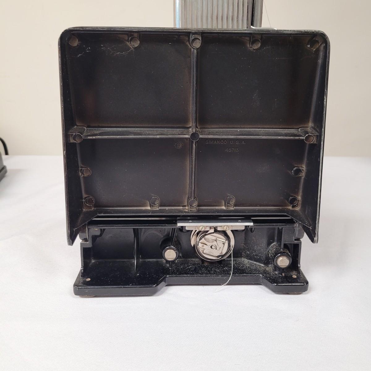 Vintage Singer sewing machine in hard locking case with accessories, including machine attachments, button holer, oil and manual. Machine works when tested. Model no AM692904 found on bottom of machine. Sewing box includes a variety of threads, spools, thimbles, needles, elastic threader, pins, embroidery hoops, measuring tape, a large assortment of buttons, and other miscellaneous items. See manufacturer plate for machine info. Sewing machine case measures approximately 14.5"L x8"D x11"H. Shipping available.