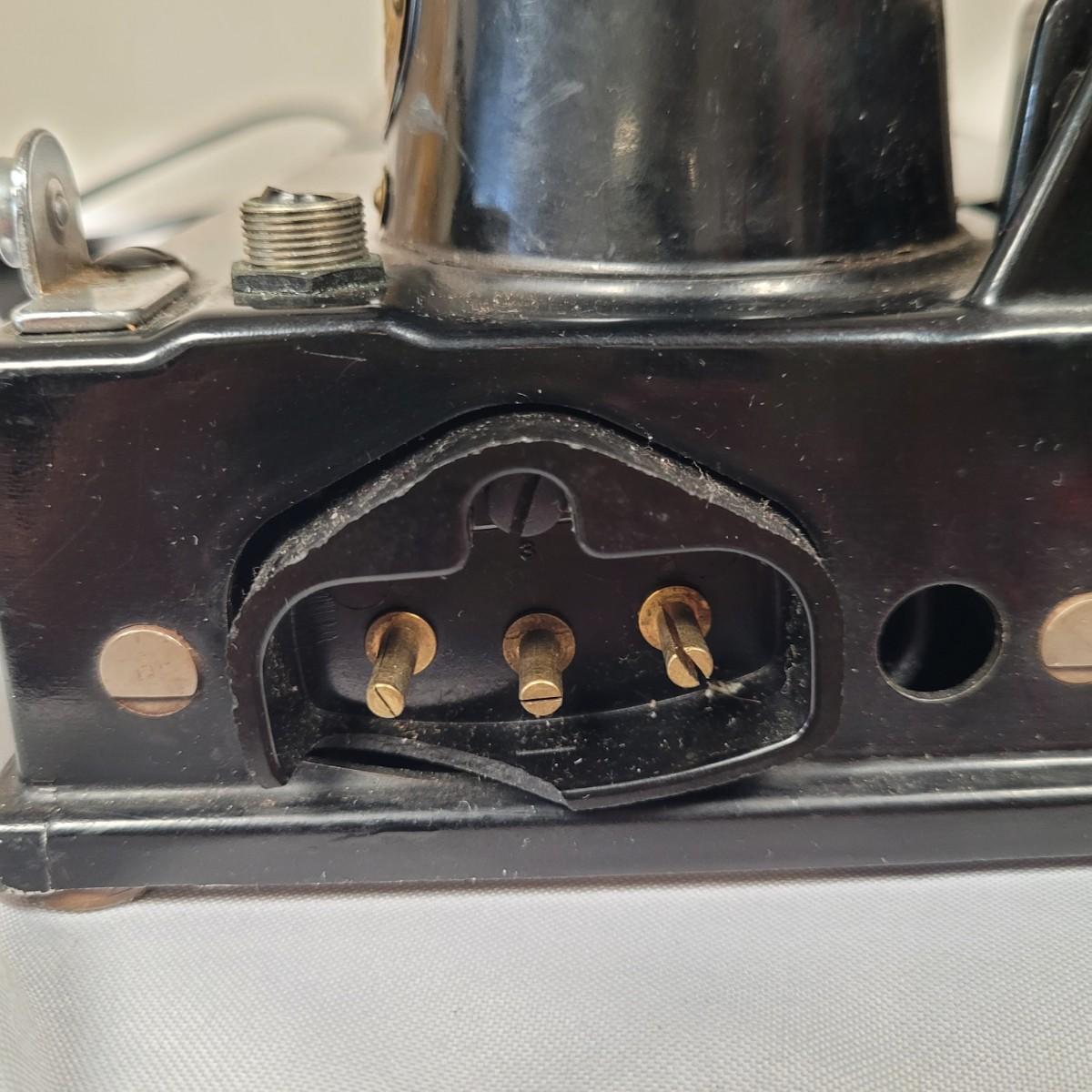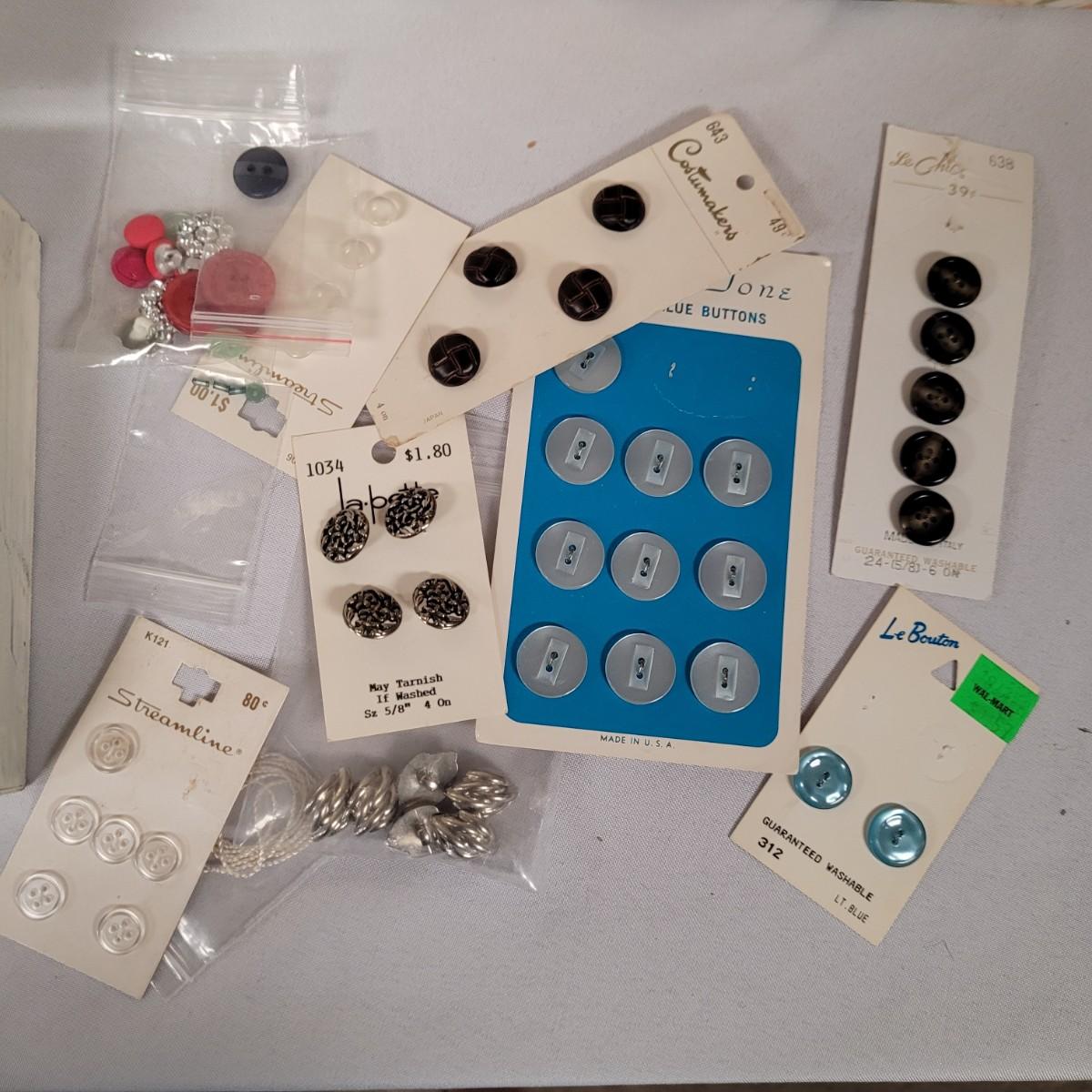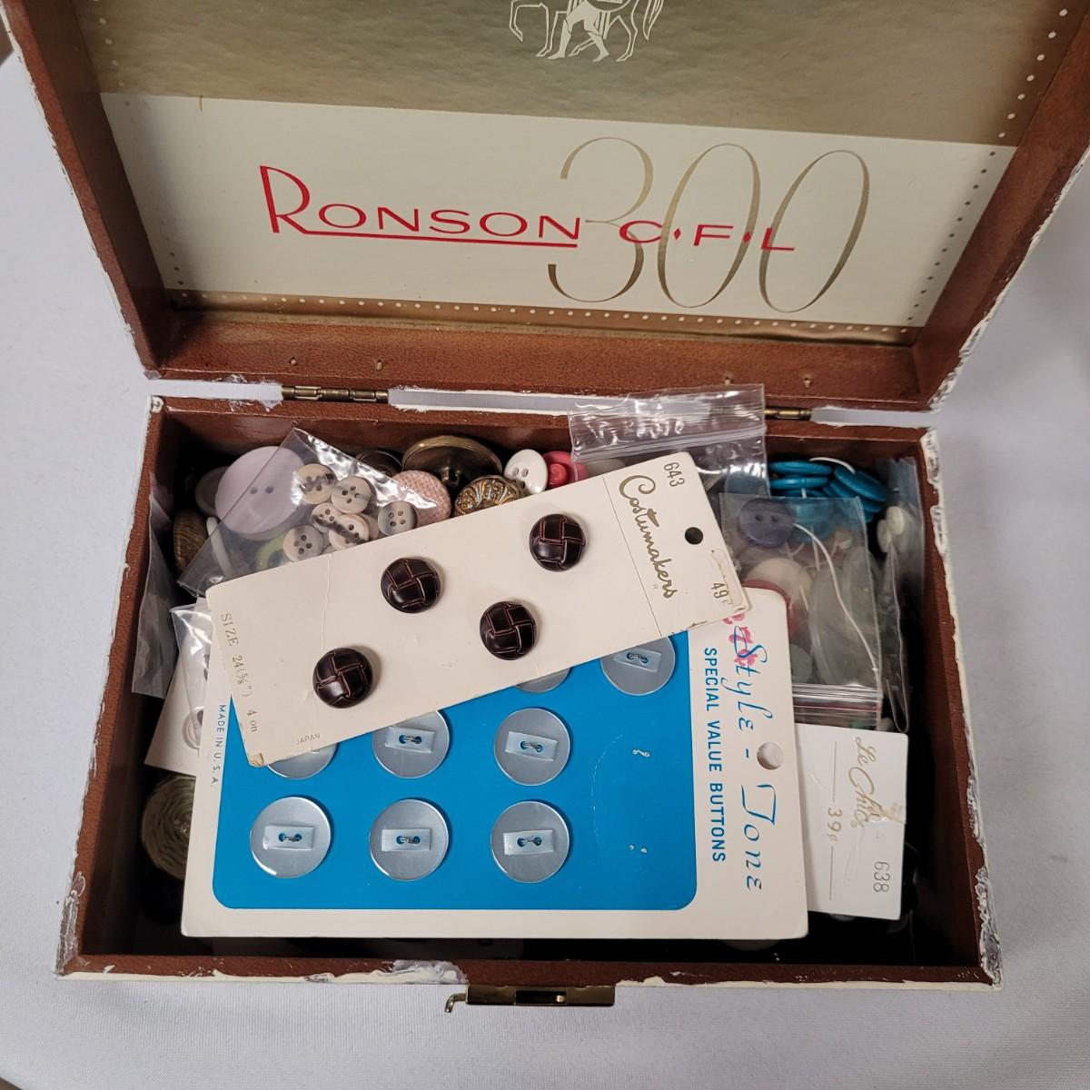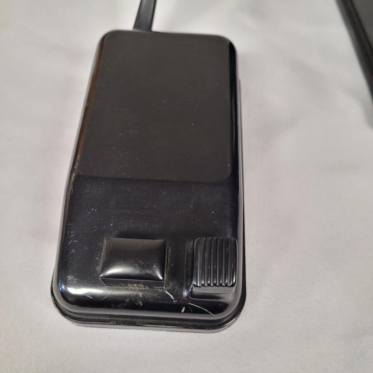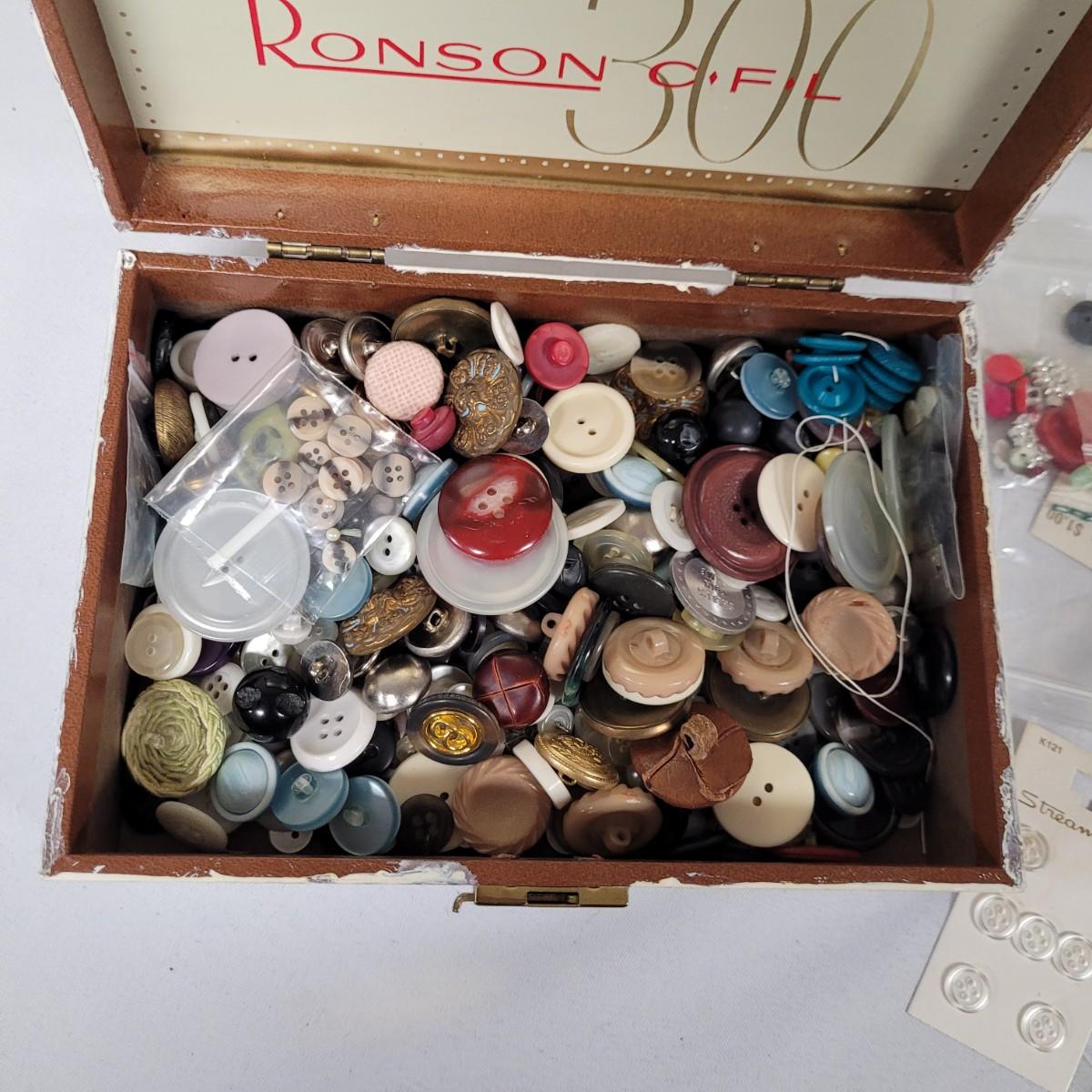 Vintage Singer sewing machine in hard locking case with accessories, including machine attachments, button holer, oil and manual. Machine works when tested. Model no AM692904 found on bottom of machine. Sewing box includes a variety of threads, spools, thimbles, needles, elastic threader, pins, embroidery hoops, measuring tape, a large assortment of buttons, and other miscellaneous items. See manufacturer plate for machine info. Sewing machine case measures approximately 14.5"L x8"D x11"H. Shipping available.