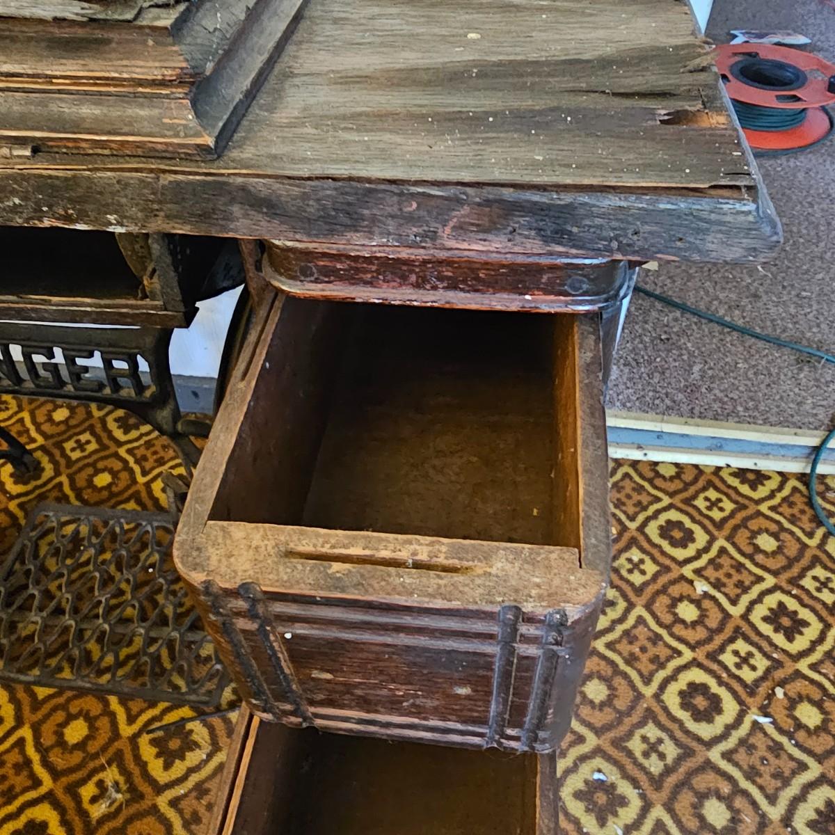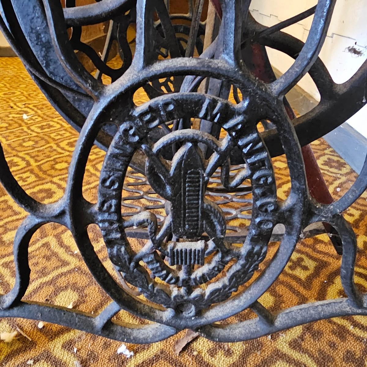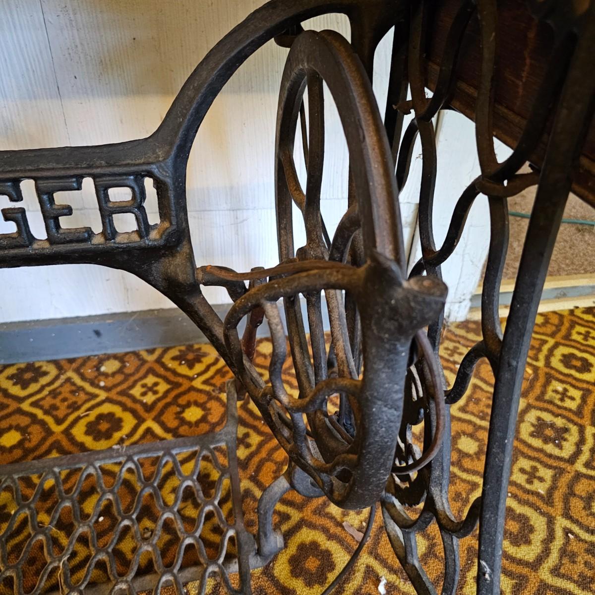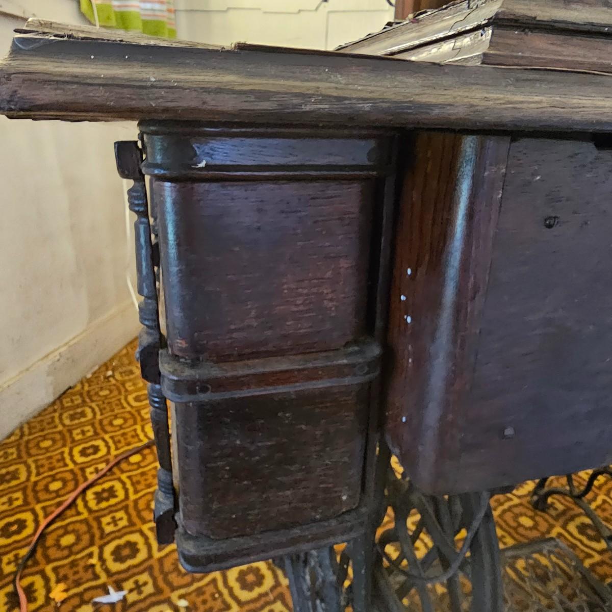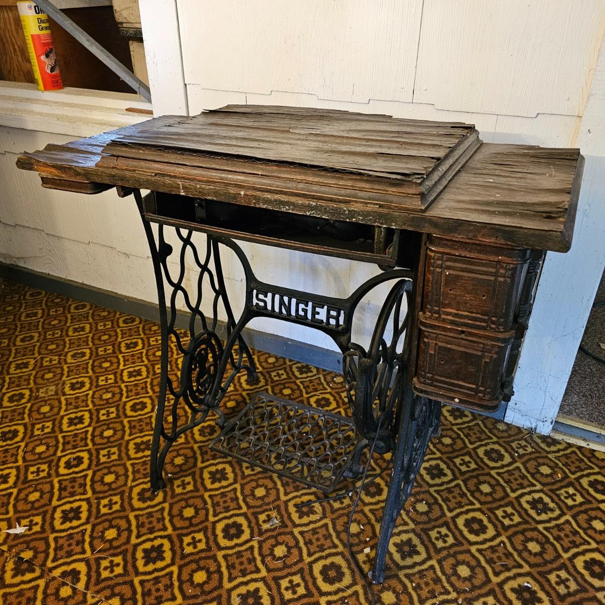 Model #27, built in 1904 according to Singer lookup classification. Wood cabinet, cast iron legs and base with traditional Singer logo on ends and in under frame. Unit has two side drawers for accessories. Handles missing from both drawers. Top surfaces have delamination on lid and both sides. Under surface is smooth. Cabinet measures 37" x 18" x 30"H closed and 50.5" x 18" x 30"H open. Bobbin case and bobbin intact. Drive belt is broken but included. Steel wheels on frame for ease of movement. See photos for details.