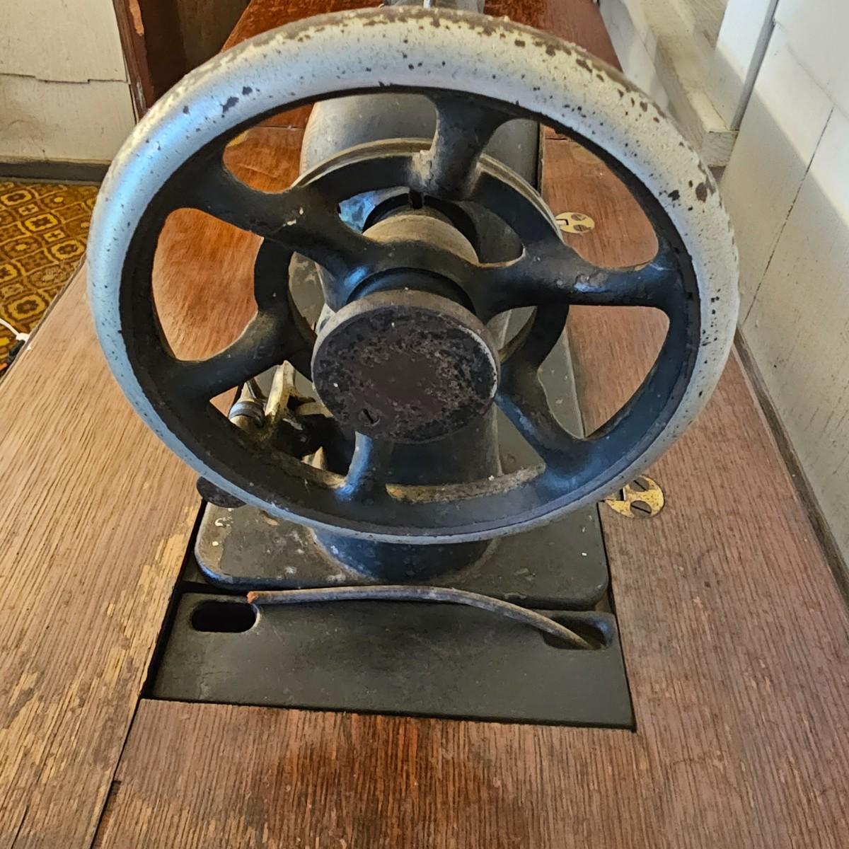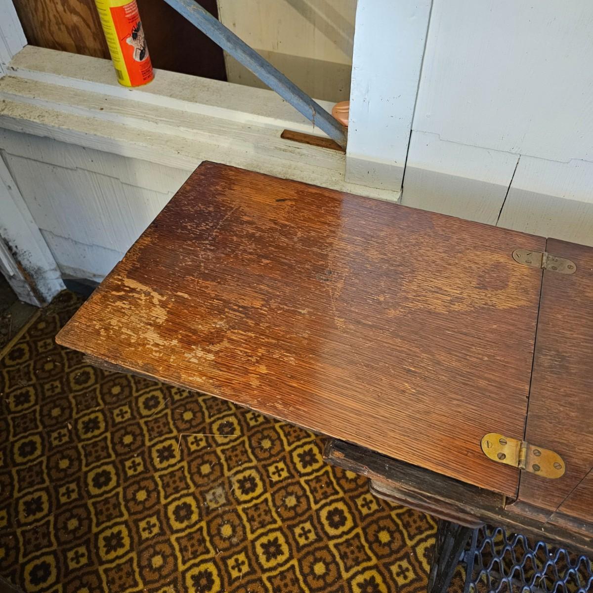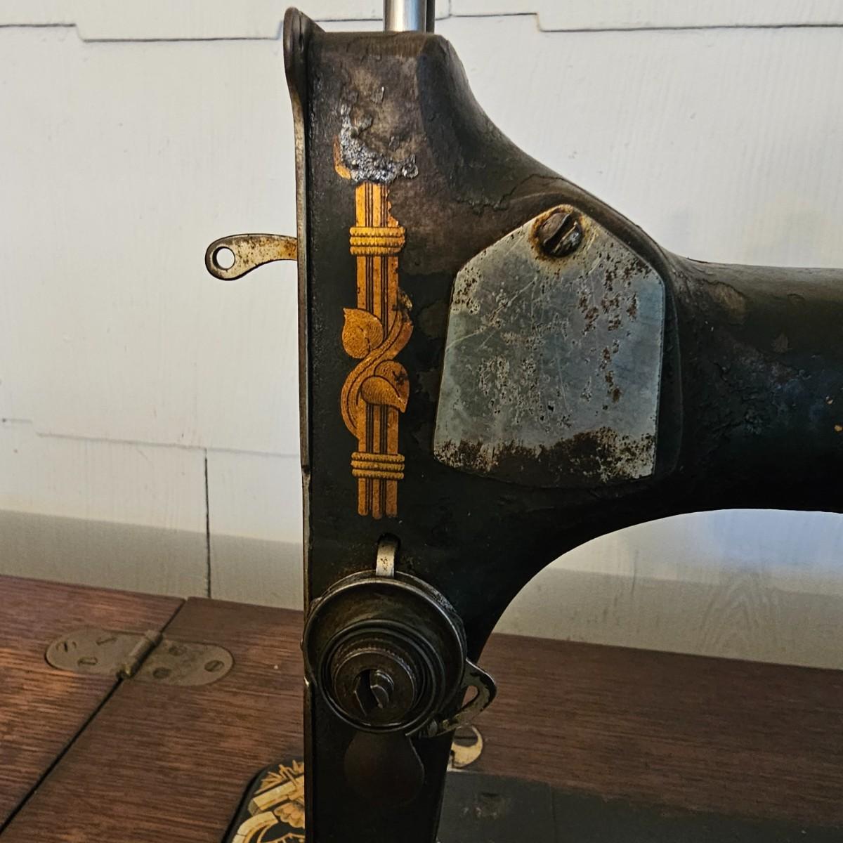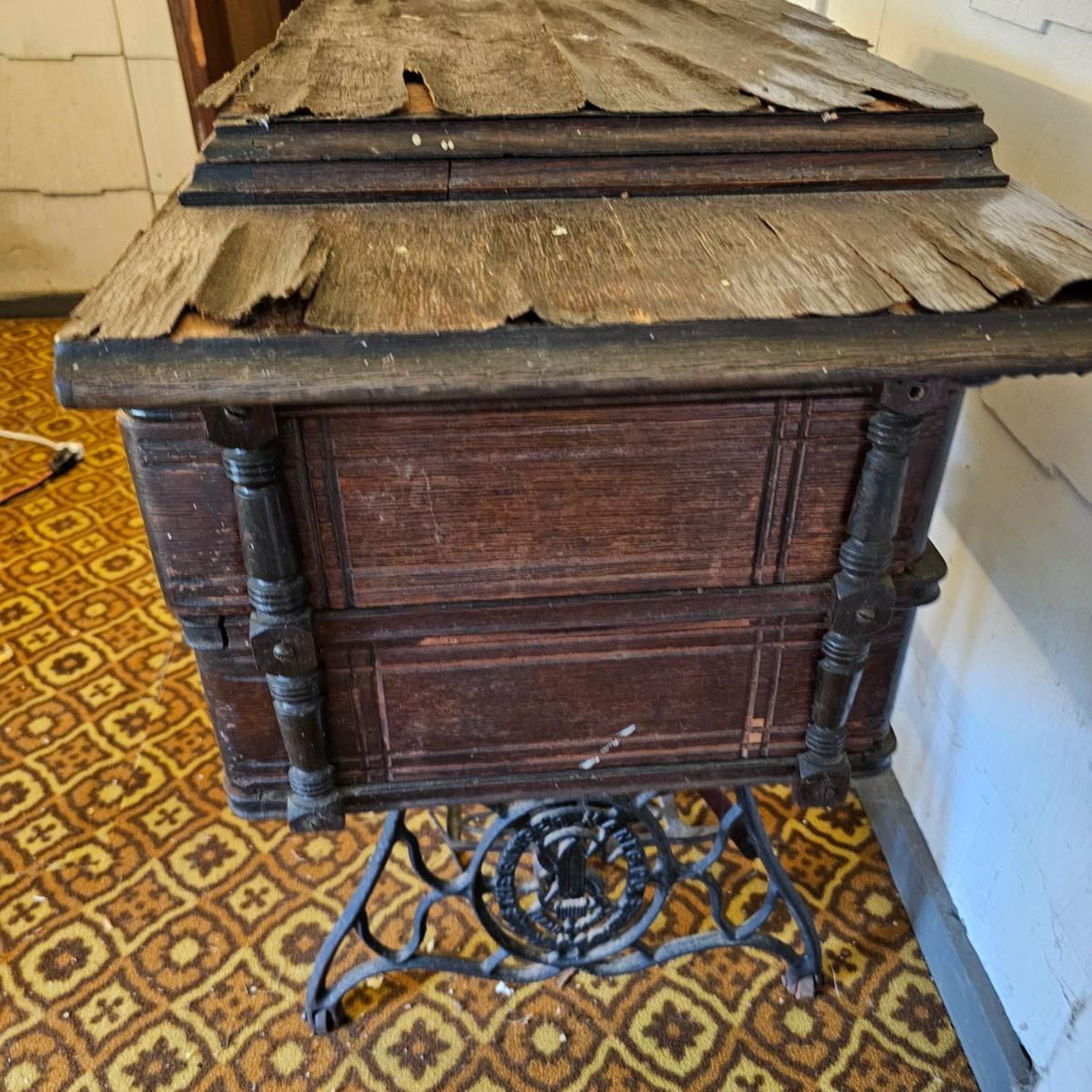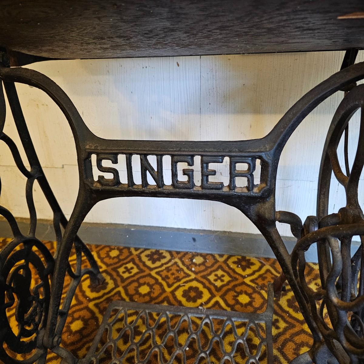 Model #27, built in 1904 according to Singer lookup classification. Wood cabinet, cast iron legs and base with traditional Singer logo on ends and in under frame. Unit has two side drawers for accessories. Handles missing from both drawers. Top surfaces have delamination on lid and both sides. Under surface is smooth. Cabinet measures 37" x 18" x 30"H closed and 50.5" x 18" x 30"H open. Bobbin case and bobbin intact. Drive belt is broken but included. Steel wheels on frame for ease of movement. See photos for details.