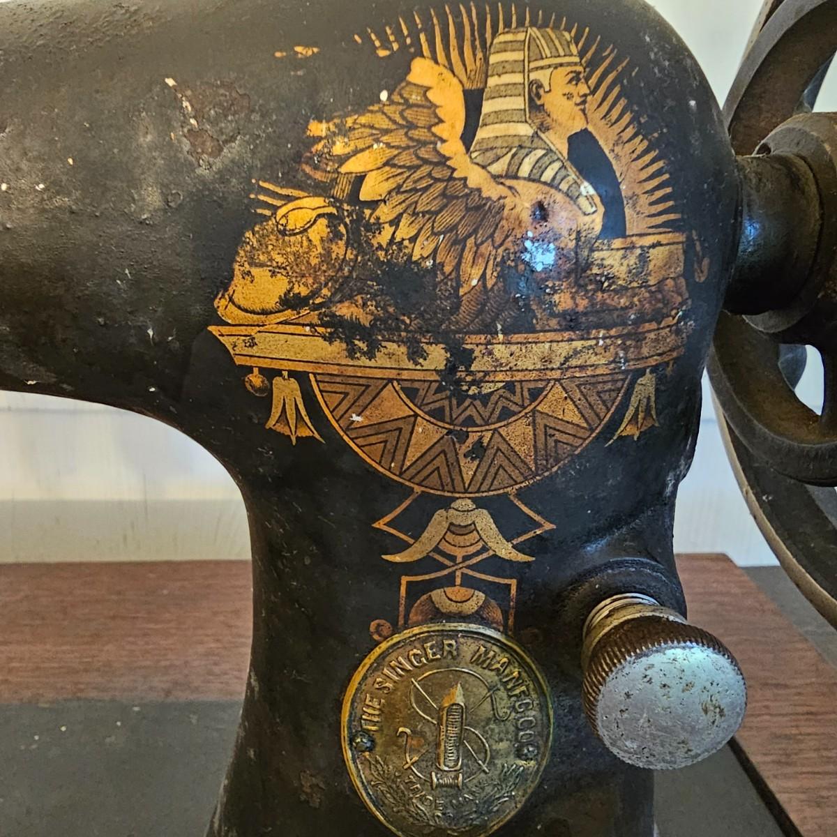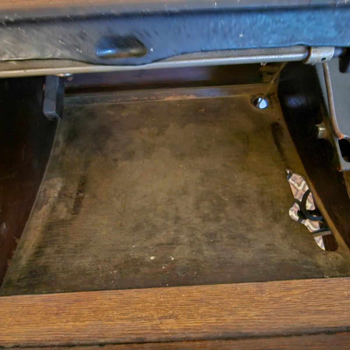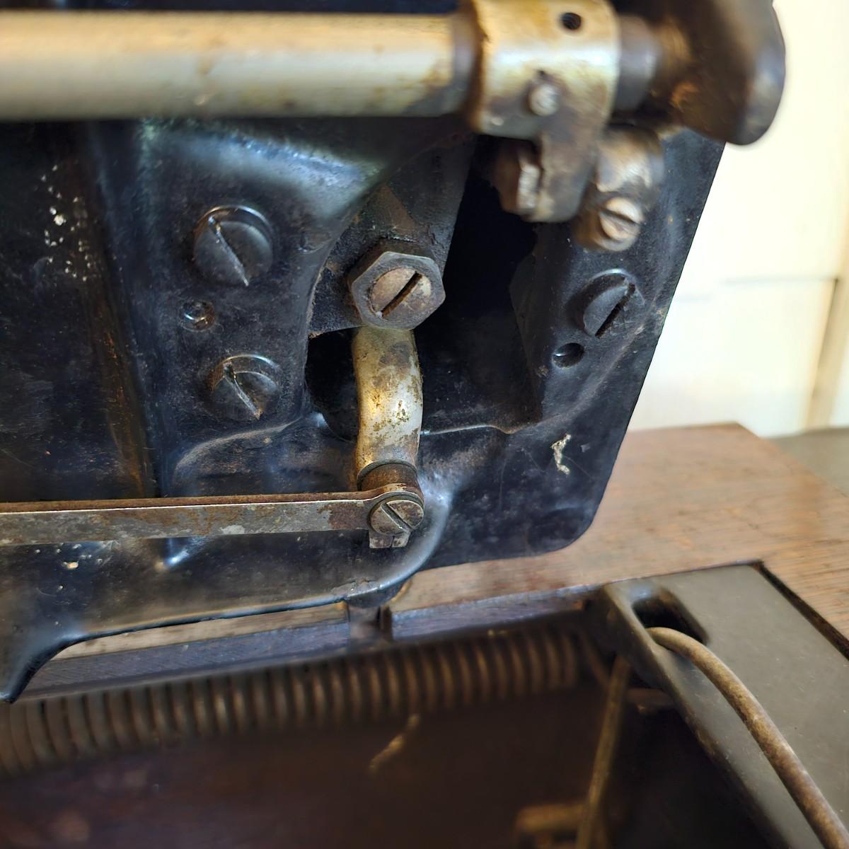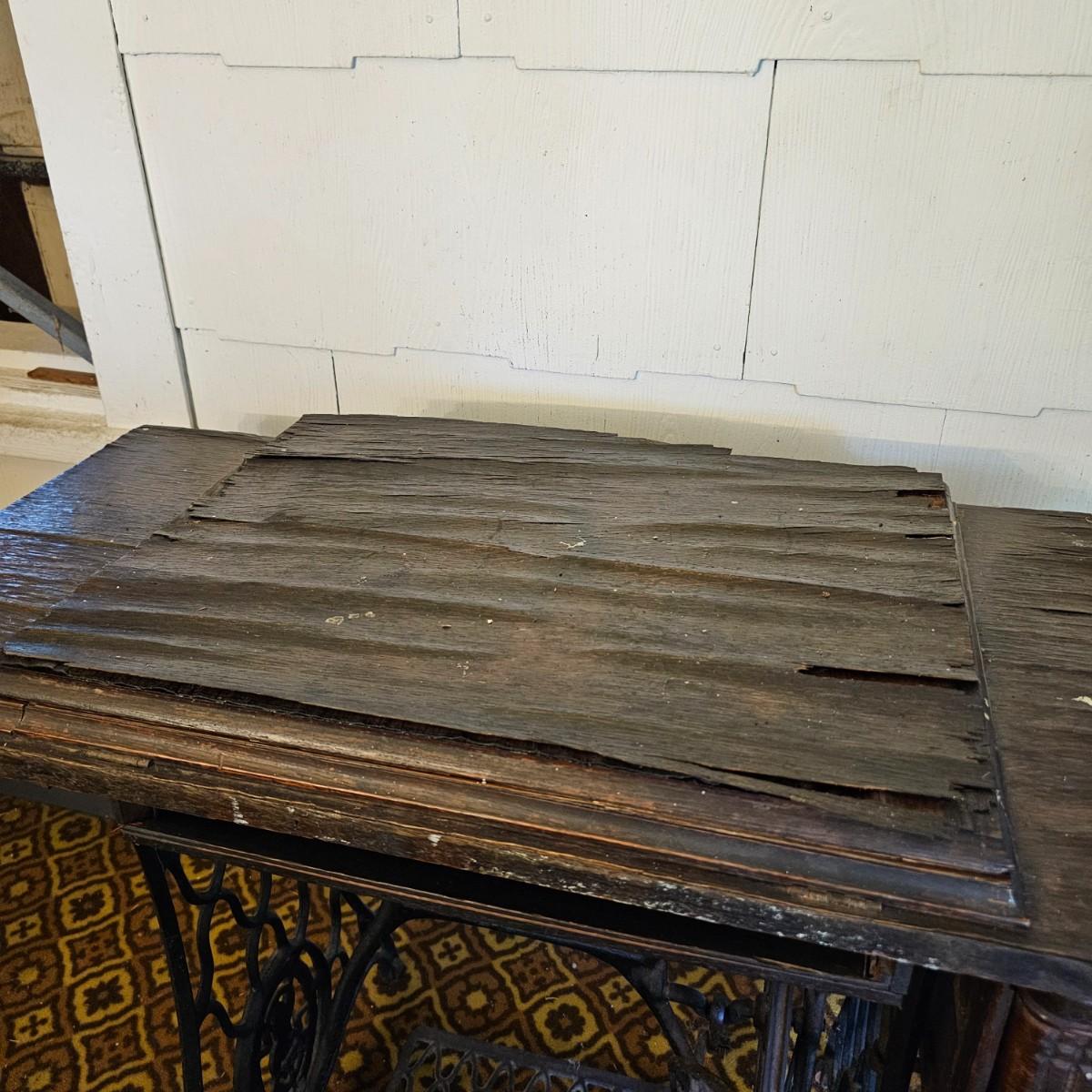 Model #27, built in 1904 according to Singer lookup classification. Wood cabinet, cast iron legs and base with traditional Singer logo on ends and in under frame. Unit has two side drawers for accessories. Handles missing from both drawers. Top surfaces have delamination on lid and both sides. Under surface is smooth. Cabinet measures 37" x 18" x 30"H closed and 50.5" x 18" x 30"H open. Bobbin case and bobbin intact. Drive belt is broken but included. Steel wheels on frame for ease of movement. See photos for details.