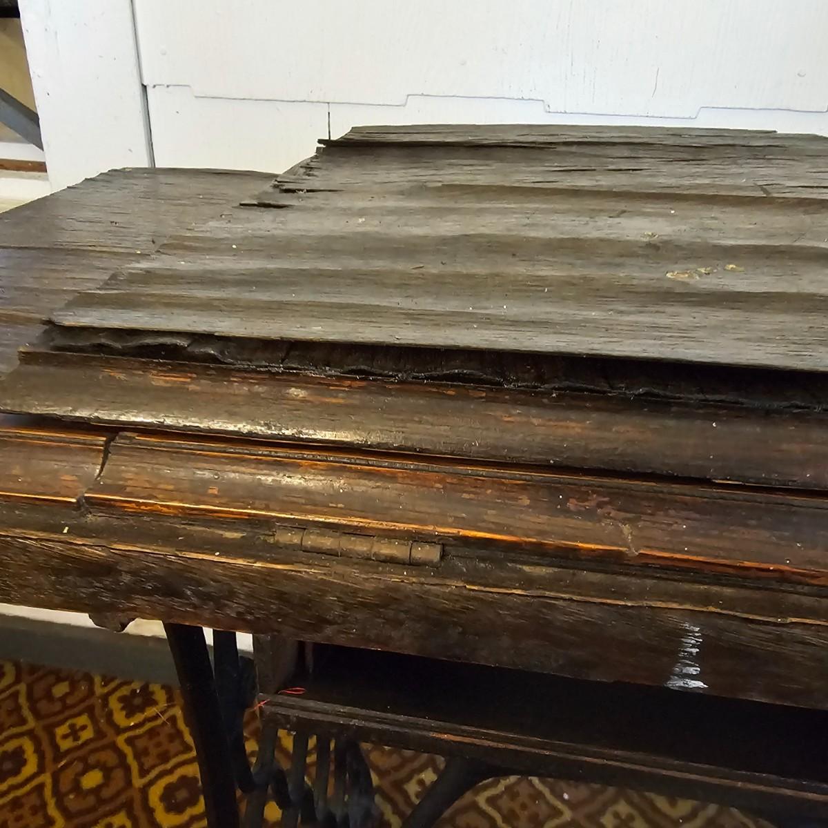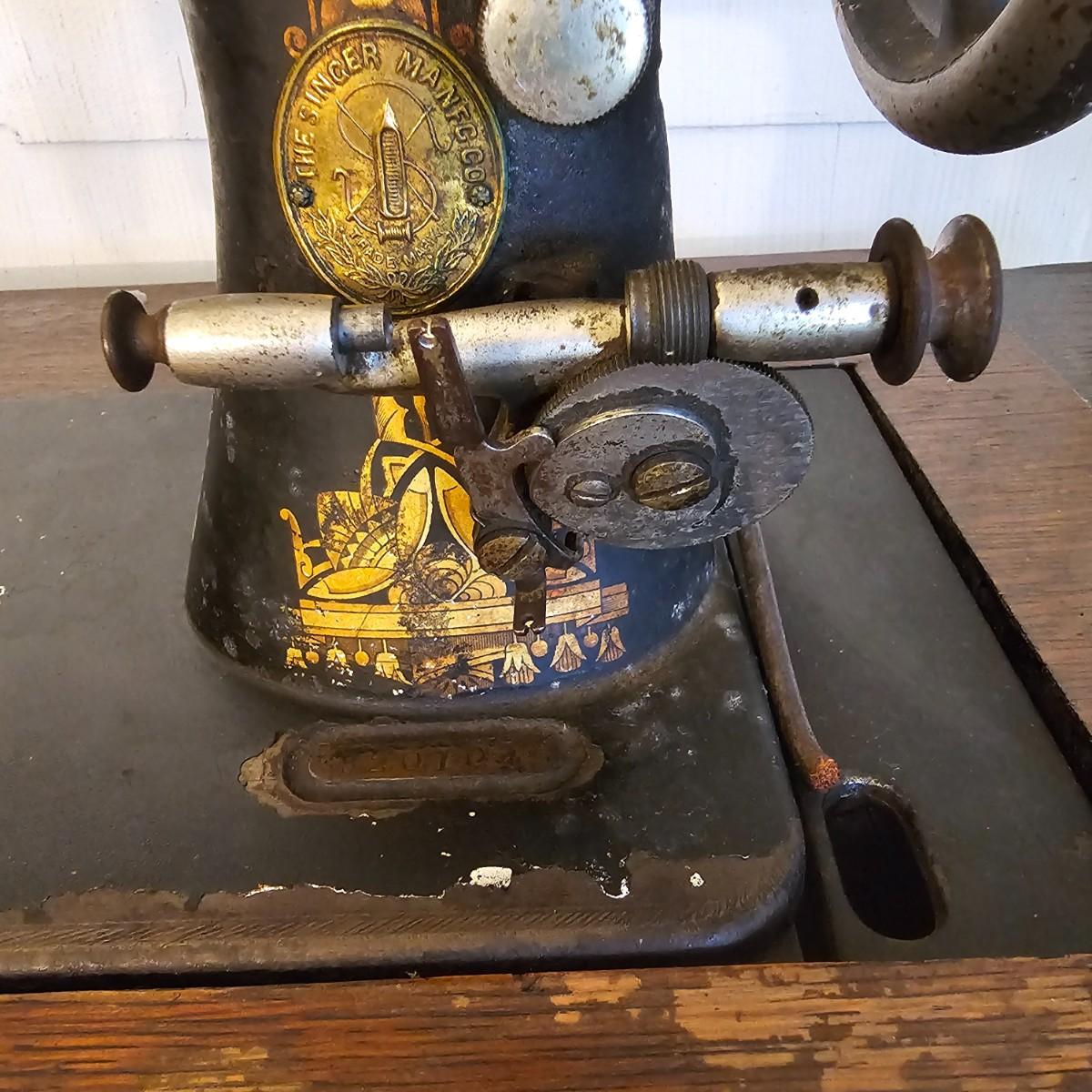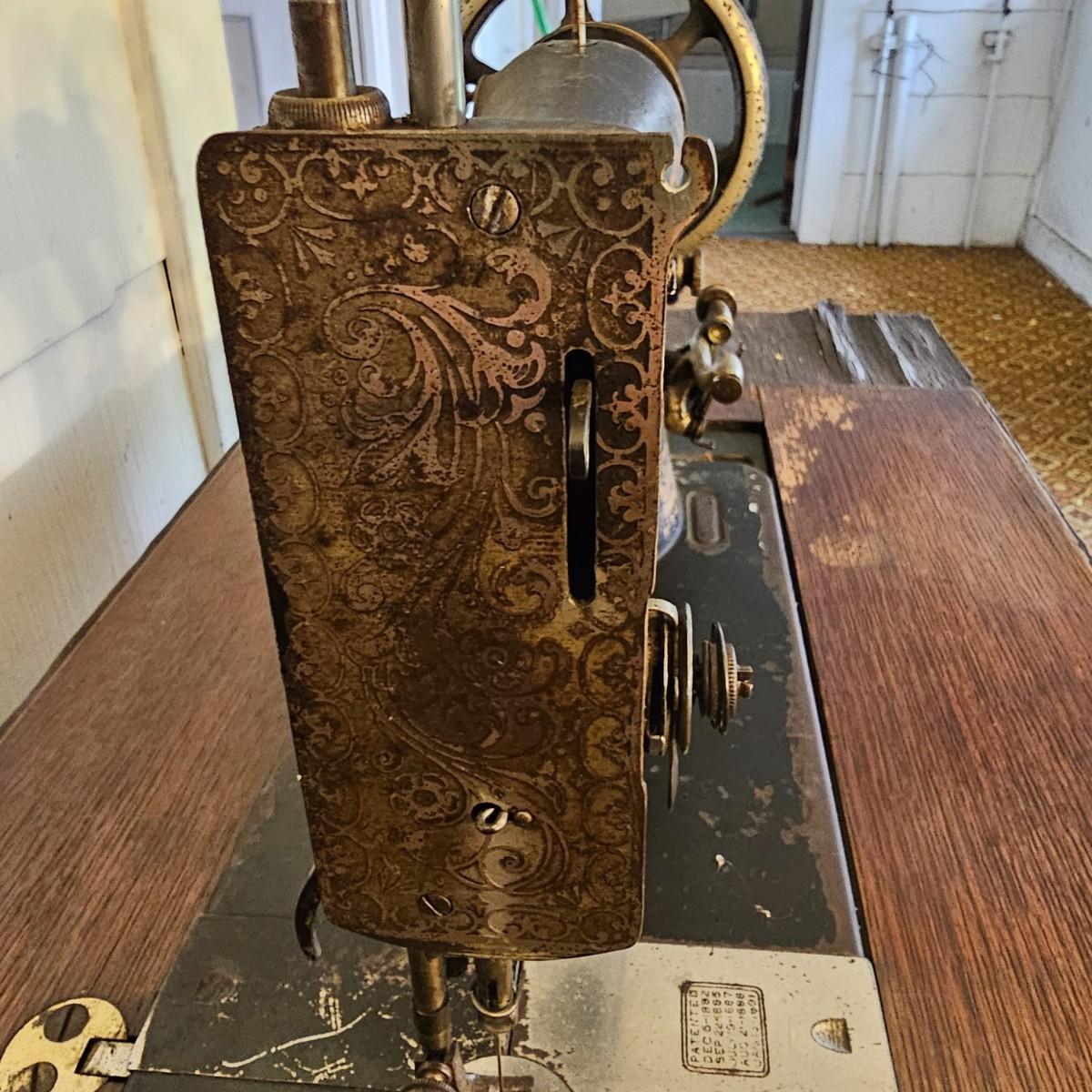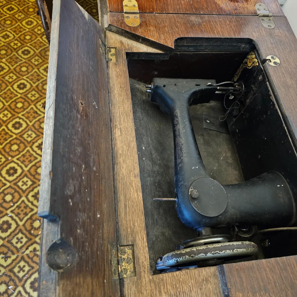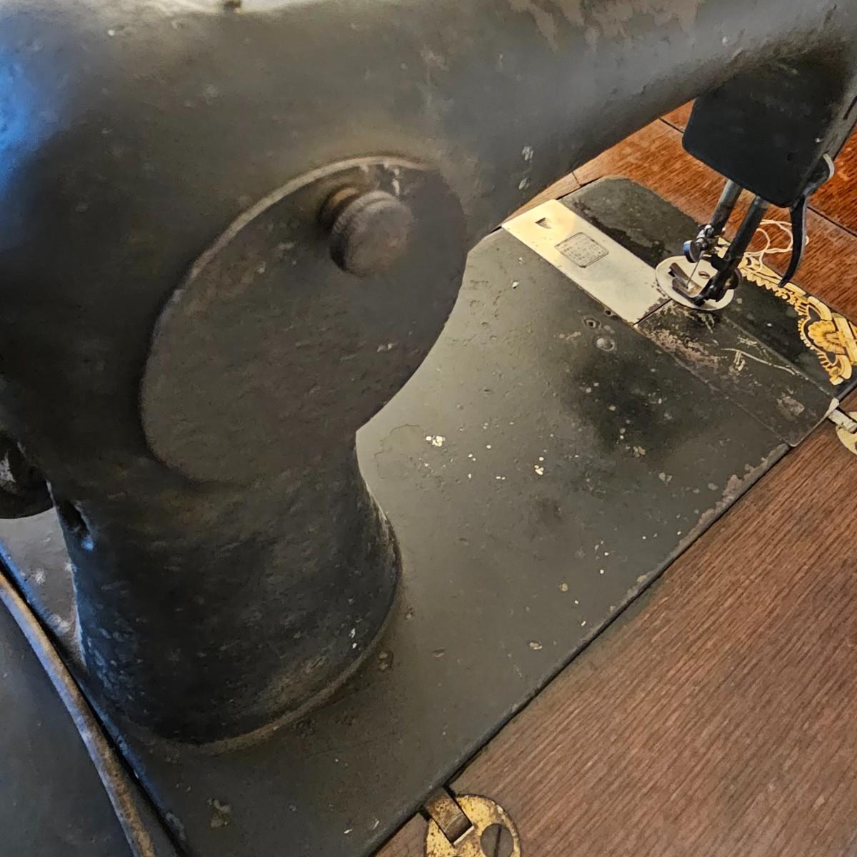Model #27, built in 1904 according to Singer lookup classification. Wood cabinet, cast iron legs and base with traditional Singer logo on ends and in under frame. Unit has two side drawers for accessories. Handles missing from both drawers. Top surfaces have delamination on lid and both sides. Under surface is smooth. Cabinet measures 37" x 18" x 30"H closed and 50.5" x 18" x 30"H open. Bobbin case and bobbin intact. Drive belt is broken but included. Steel wheels on frame for ease of movement. See photos for details.