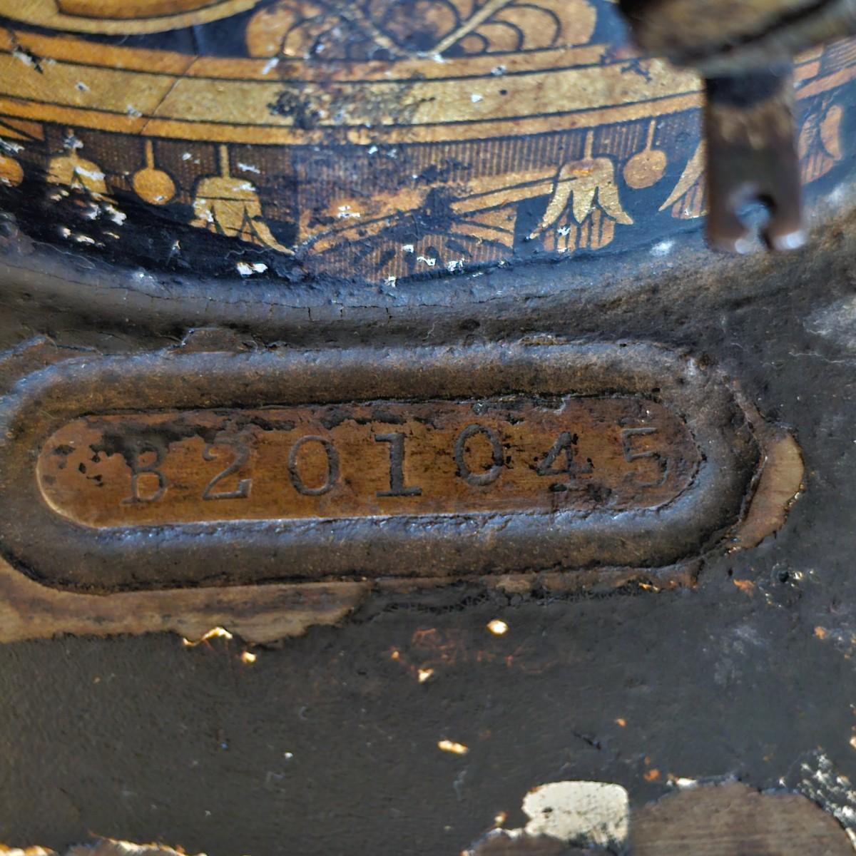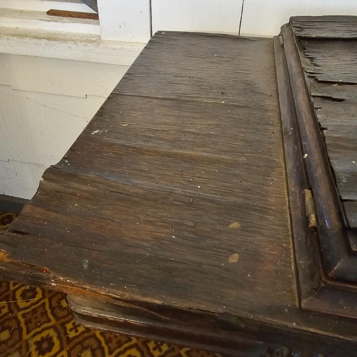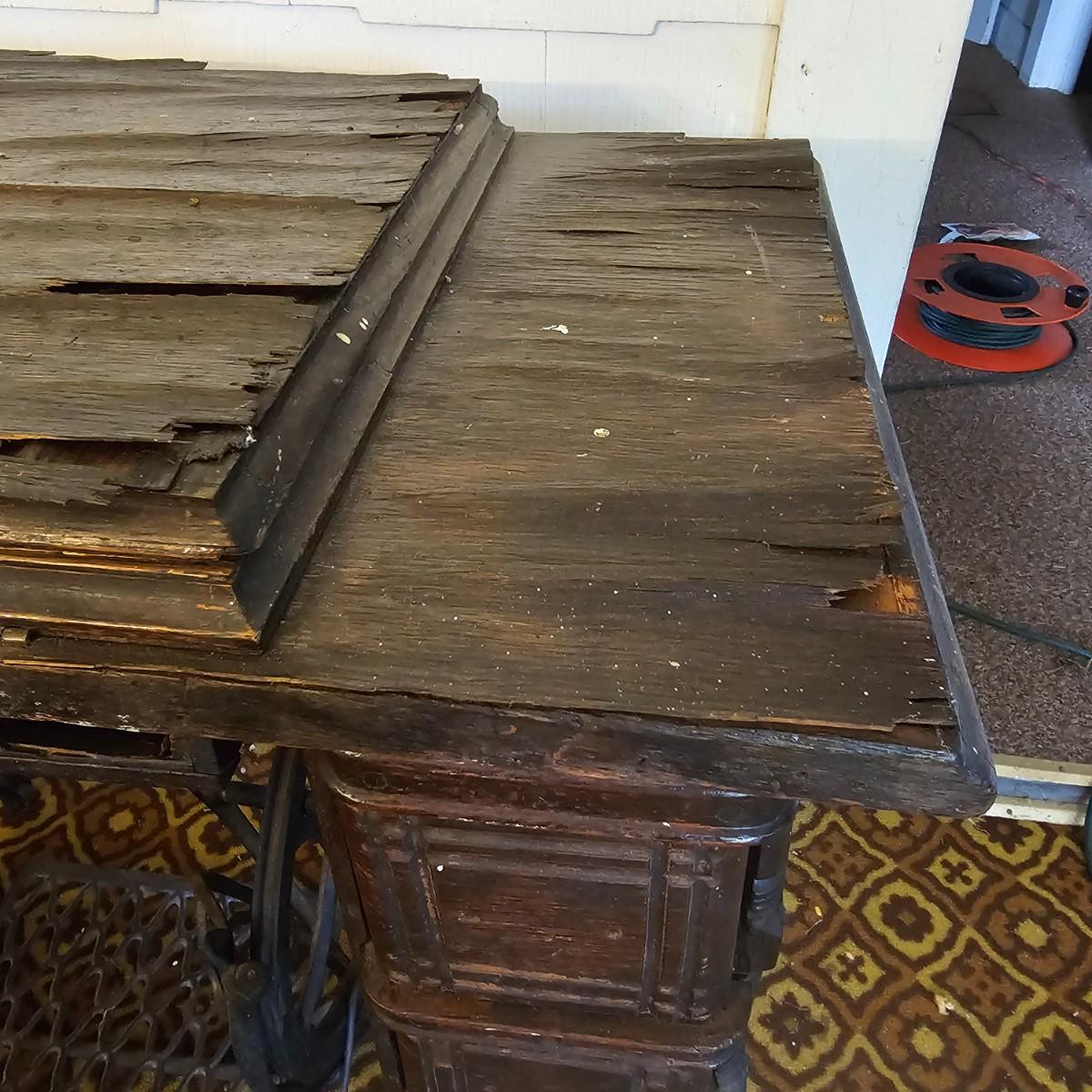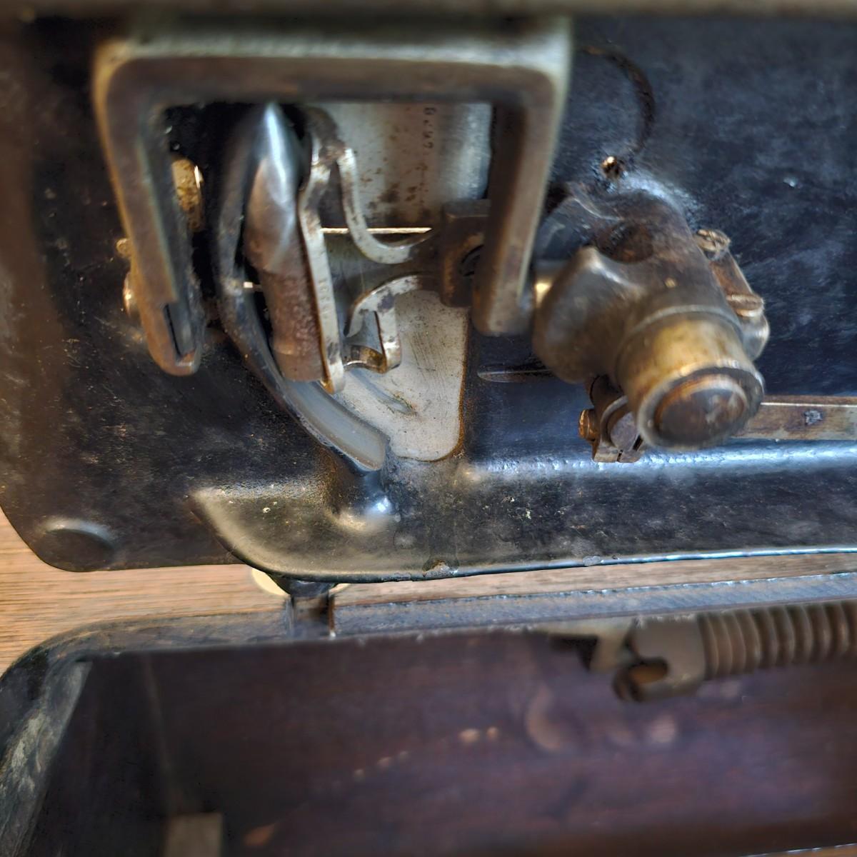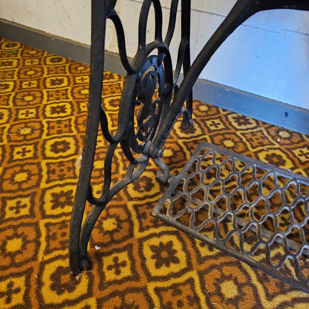 Model #27, built in 1904 according to Singer lookup classification. Wood cabinet, cast iron legs and base with traditional Singer logo on ends and in under frame. Unit has two side drawers for accessories. Handles missing from both drawers. Top surfaces have delamination on lid and both sides. Under surface is smooth. Cabinet measures 37" x 18" x 30"H closed and 50.5" x 18" x 30"H open. Bobbin case and bobbin intact. Drive belt is broken but included. Steel wheels on frame for ease of movement. See photos for details.