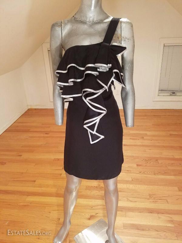 A beauty and in great vintage condition . 100% silk adorned with silver trims on the ruffles.