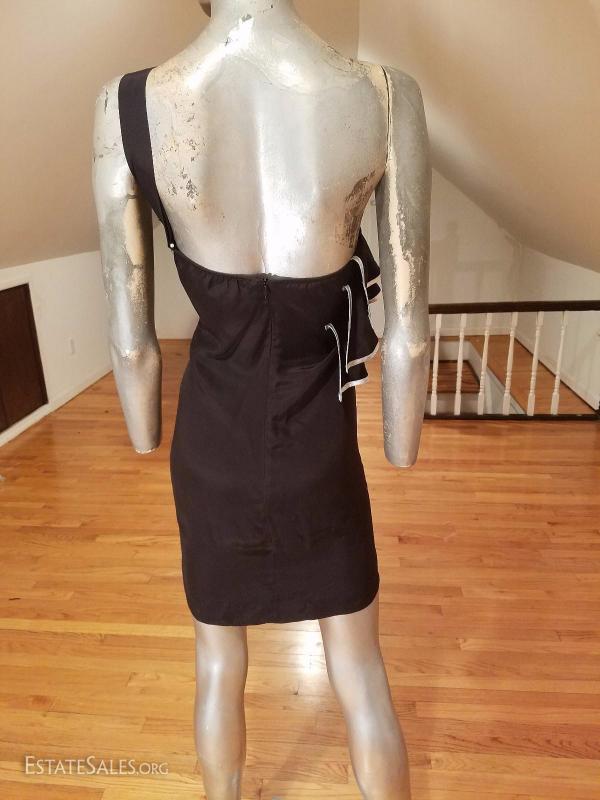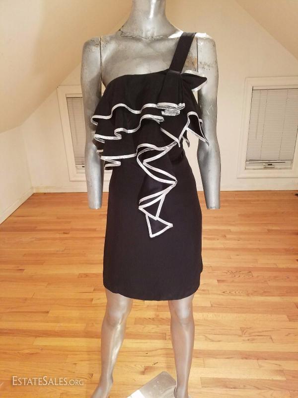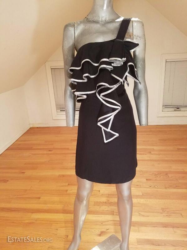 A beauty and in great vintage condition . 100% silk adorned with silver trims on the ruffles.