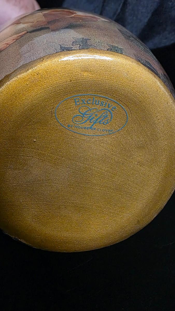A gold-trimmed rim crowns the vase, lending a subtle touch of elegance to its classical silhouette. Standing approximately 11 inches tall, this collectible piece speaks to House of Lloyd’s distinctive approach to emotional design — merging European art motifs with the nostalgia of Americana craftsmanship.