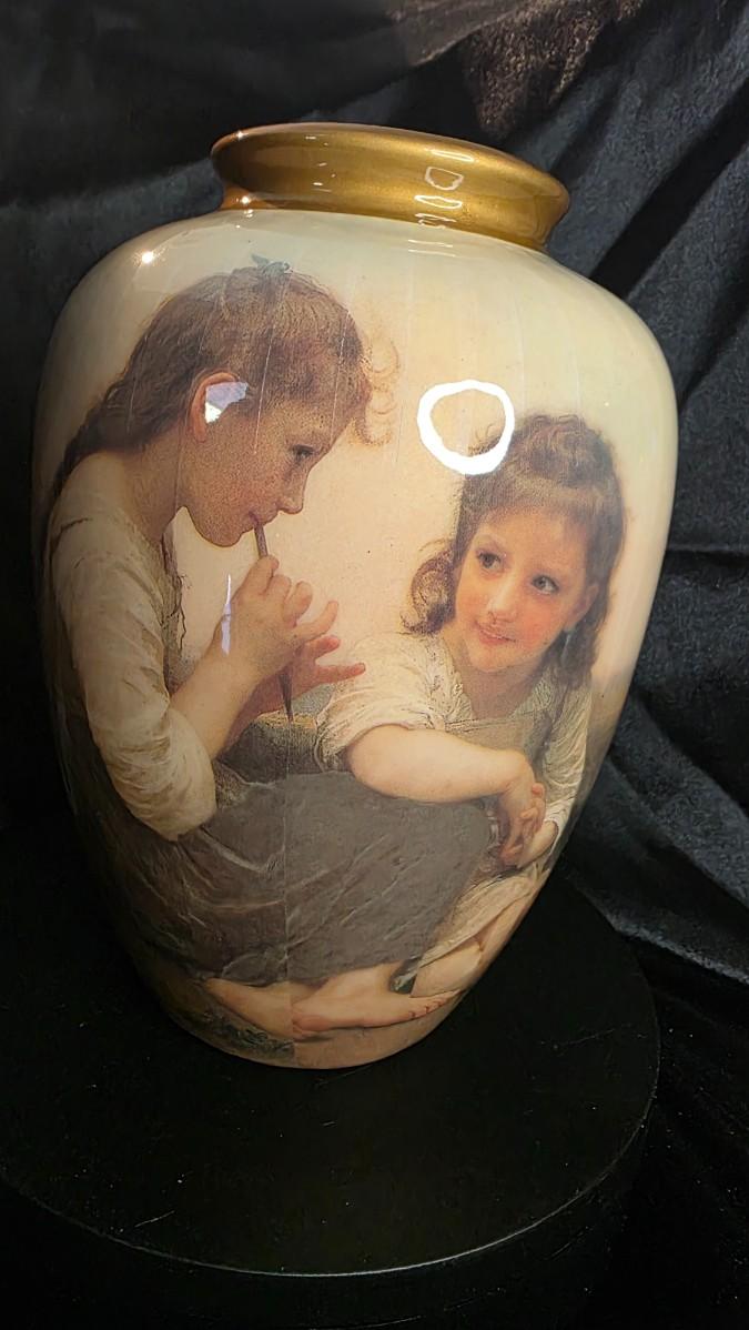 Crafted in the late 1980s to early 1990s, the vase features a detailed transfer image of two young girls — one gently playing a wooden flute while the other listens, her eyes bright with affection and wonder. Their innocence is framed against a soft countryside backdrop, rendered in warm earth tones beneath a gentle glaze that glows beneath the light.