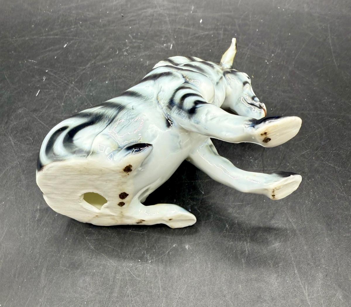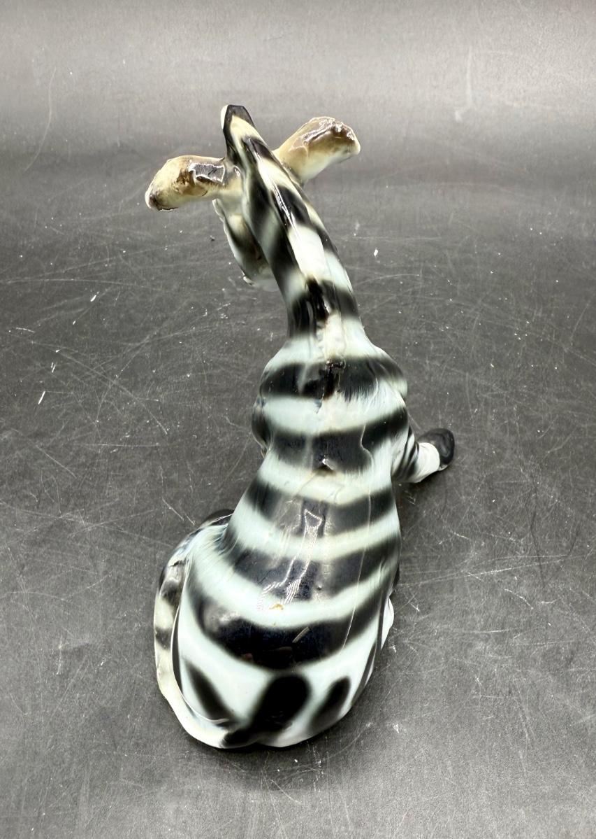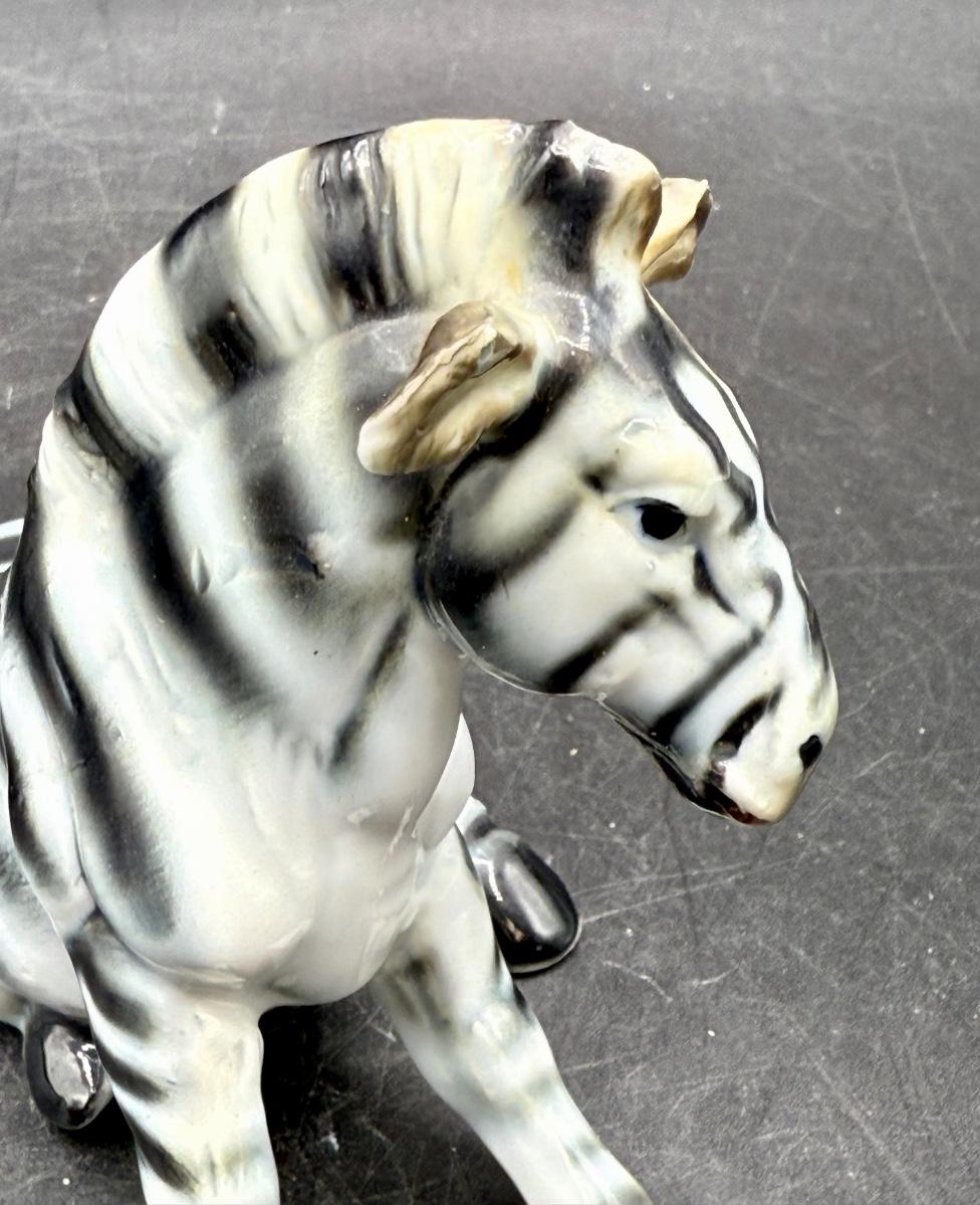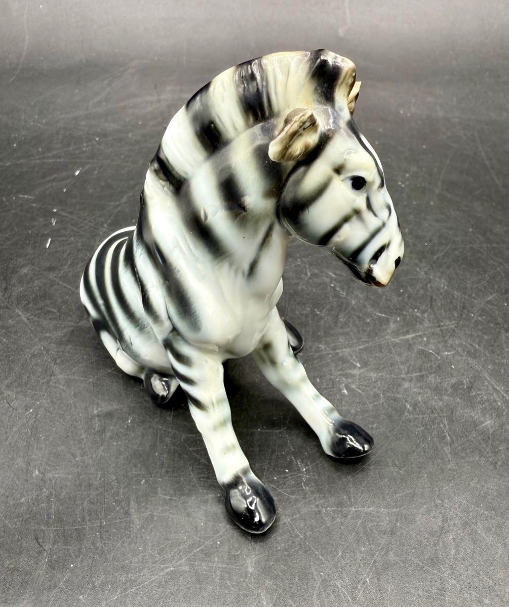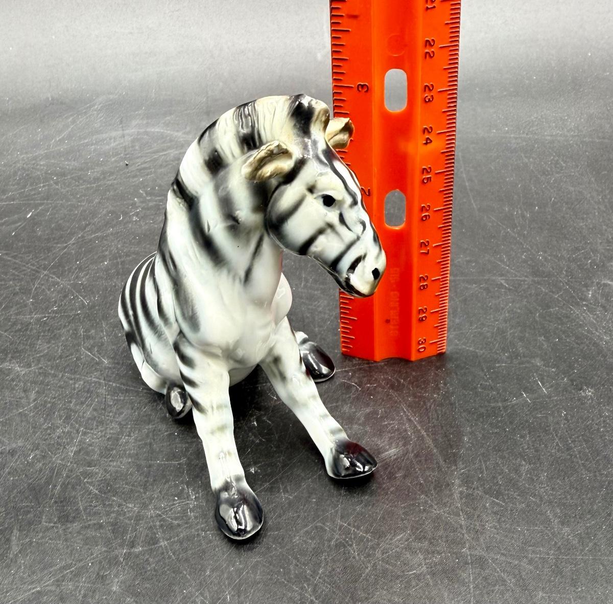 Vintage Sitting Zebra Porcelain Bone China Figurine - Black & White Brown. High gloss finish on this cute zebra figurine. He is white with black stripes, gray hooves and brown around mane, neck, ears and face. Measures 3.25” tall and 4” long. This figurine is in good vintage condition, except for a rough spot on one ear.