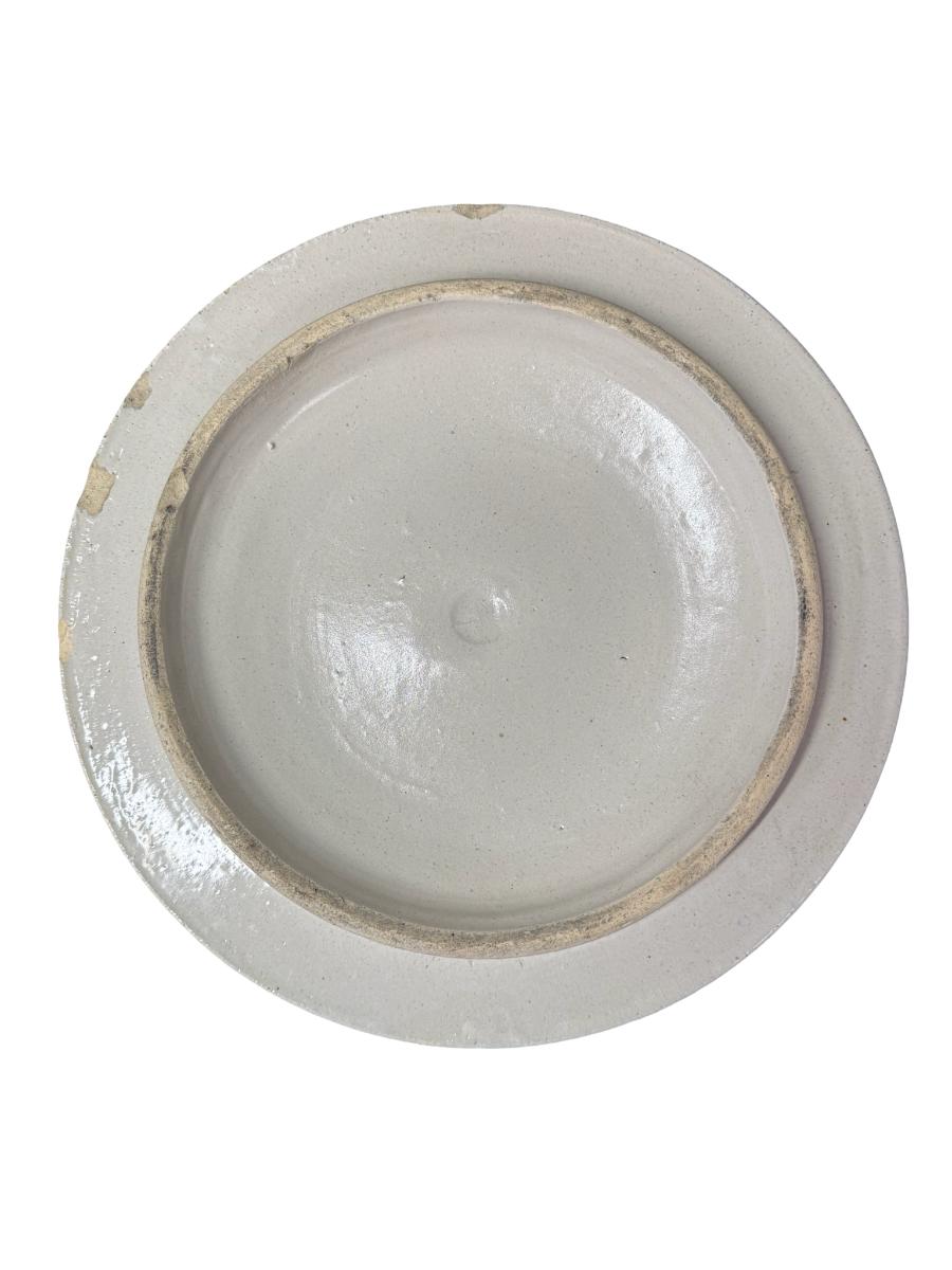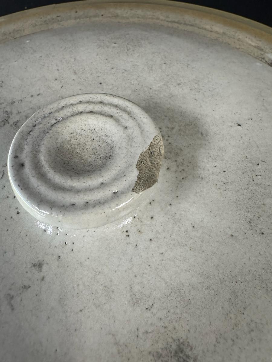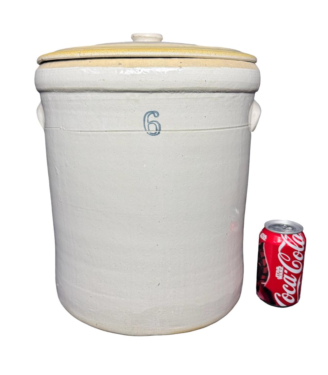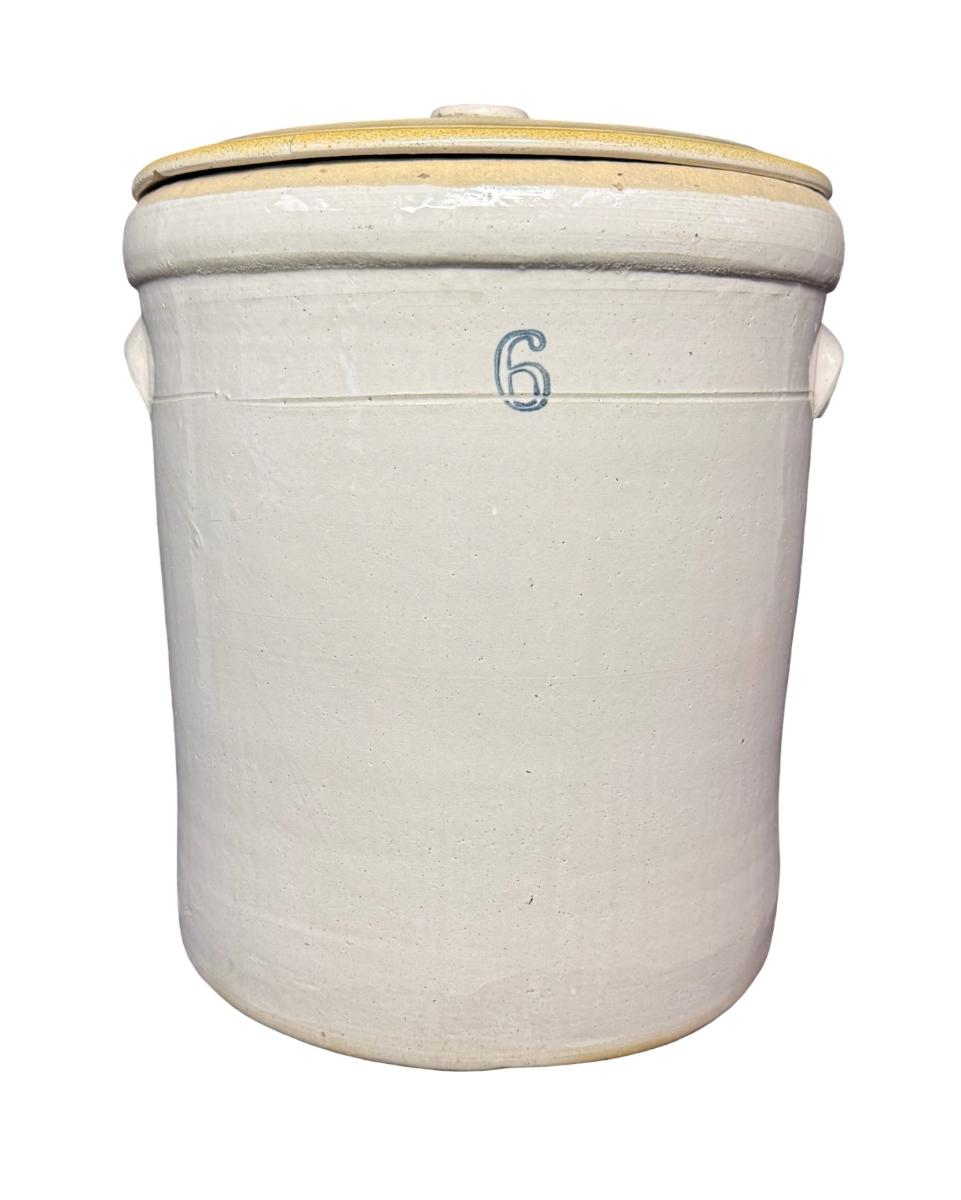 This piece is free from most of the damage typically associated with these crocks. There are three chips under the lid, and a chip on the lid handle. The ears are free of chips. Measurement: 14.5”H x 12.5” Diameter. Pre-auction estimate: $75-$100. [JL]