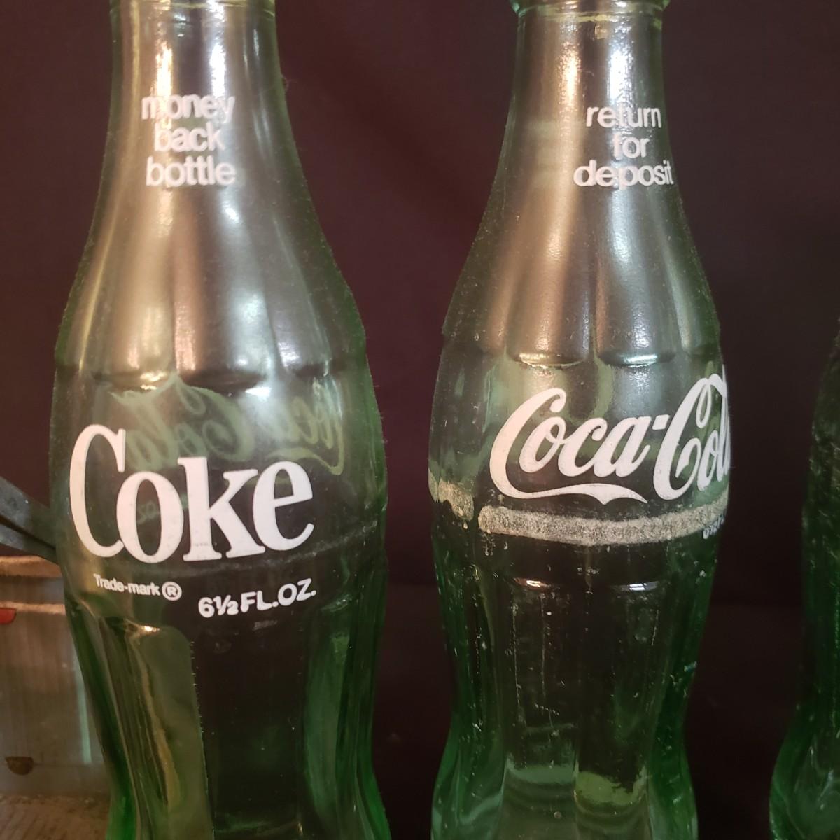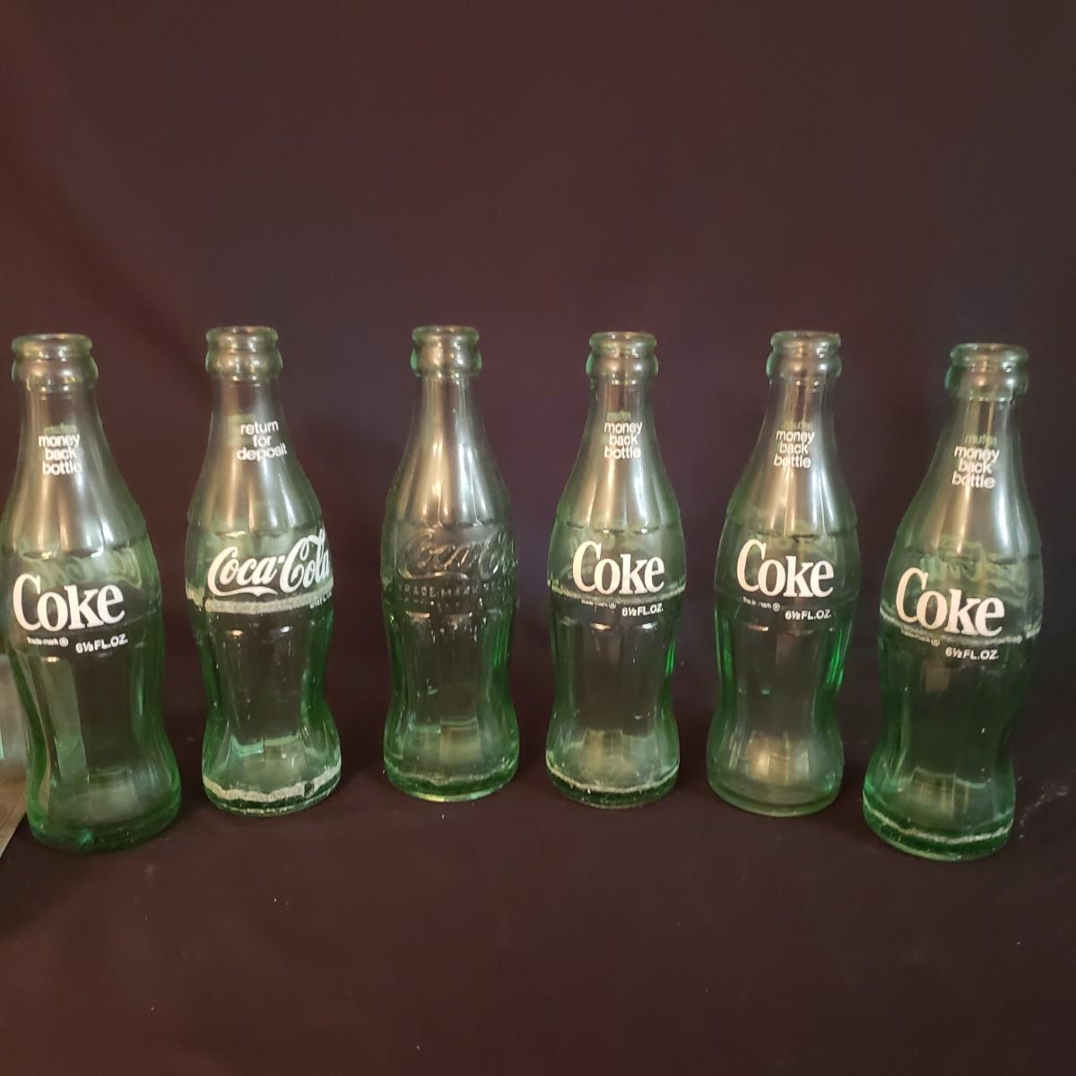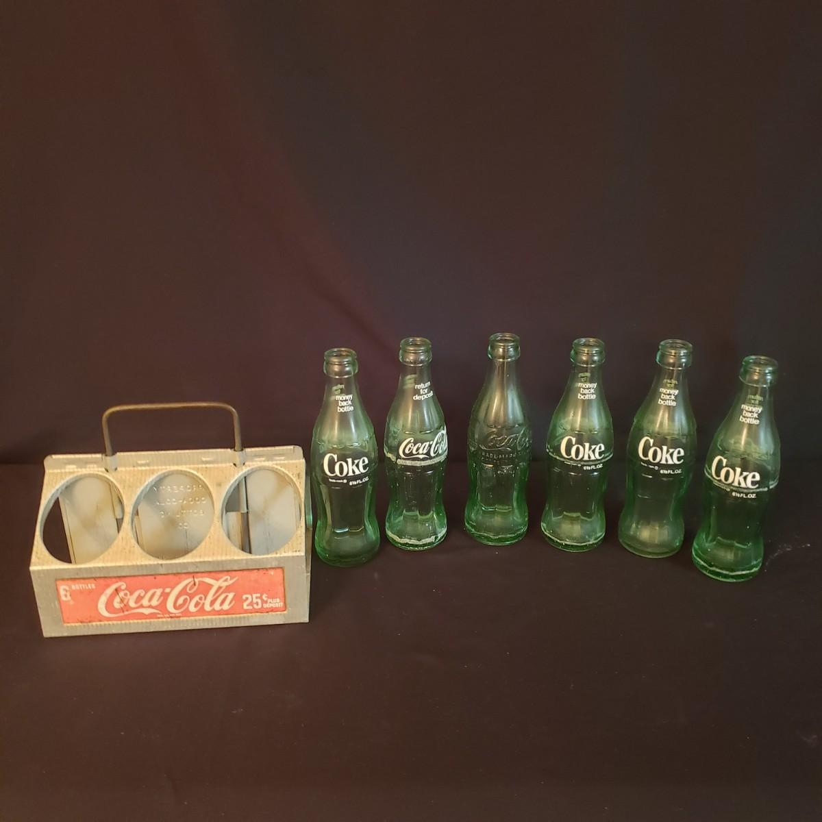 This is a 6 pack of glass Coca-Cola bottles with a metal carrying case. The metal handle moves up and down. Five of the bottles have the white Coca-Cola print on them, while one is clear printed. The bottles measure 8" H. The carrying case measures 8"x5"x6" H.