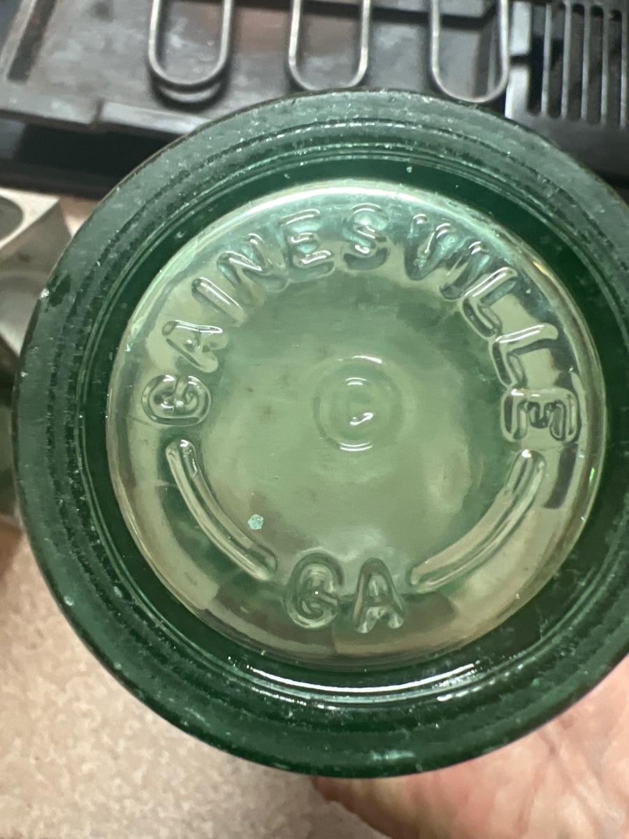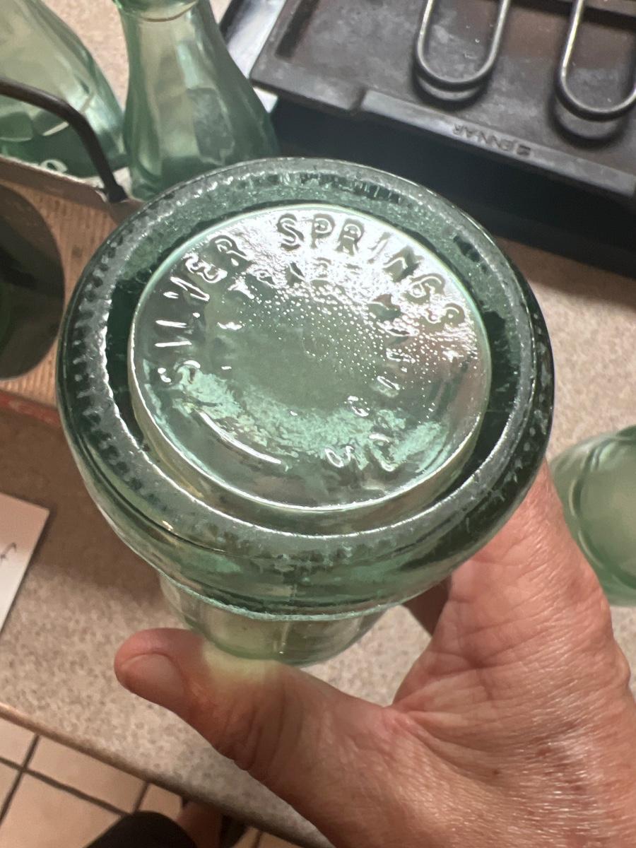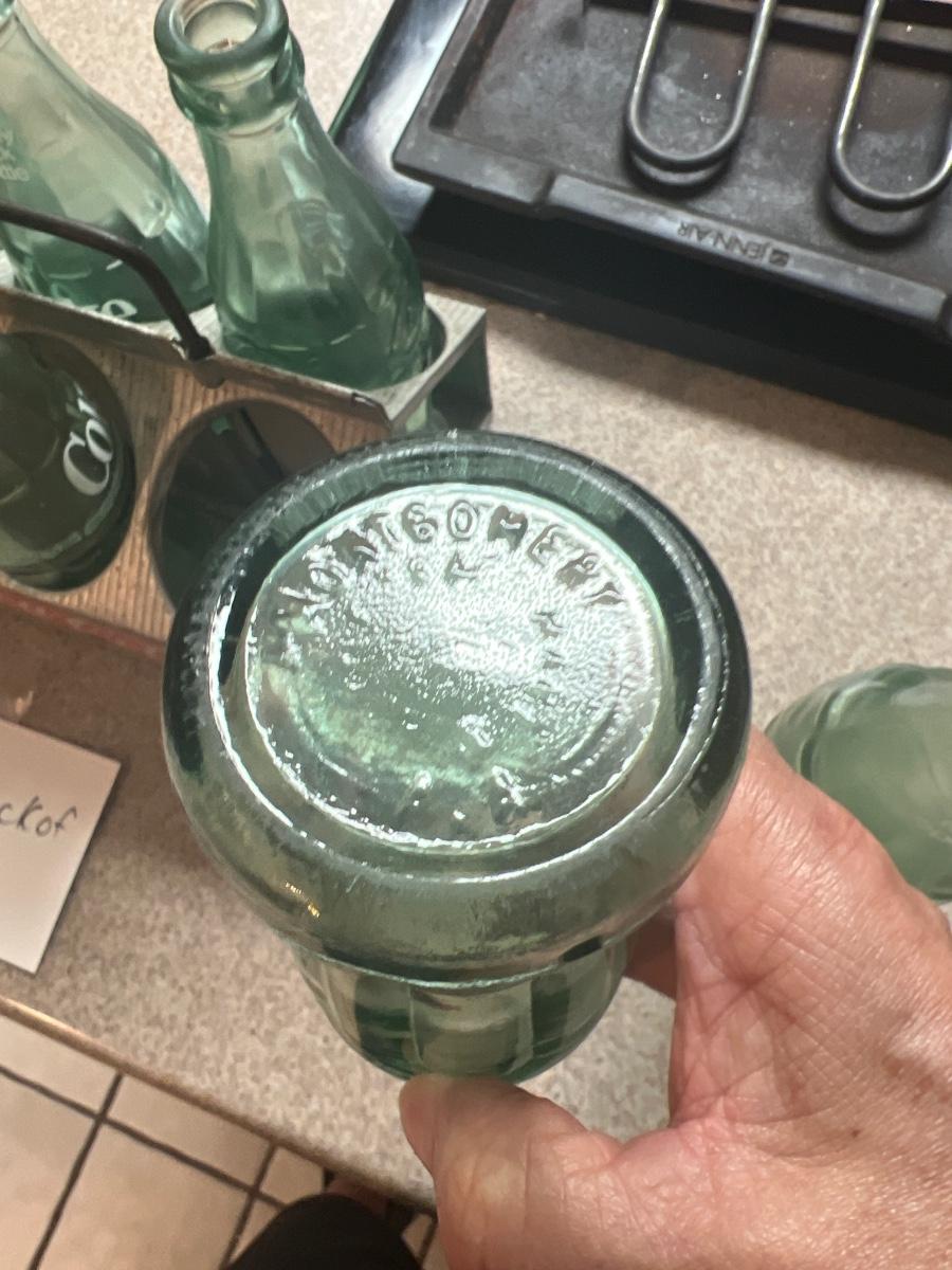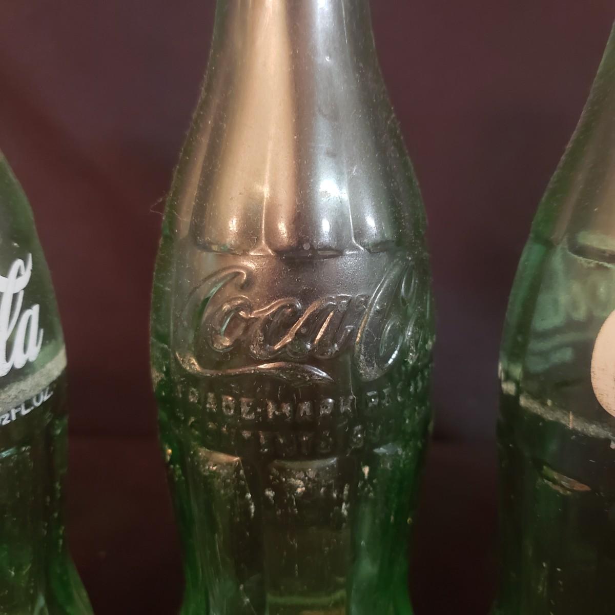 This is a 6 pack of glass Coca-Cola bottles with a metal carrying case. The metal handle moves up and down. Five of the bottles have the white Coca-Cola print on them, while one is clear printed. The bottles measure 8" H. The carrying case measures 8"x5"x6" H.
